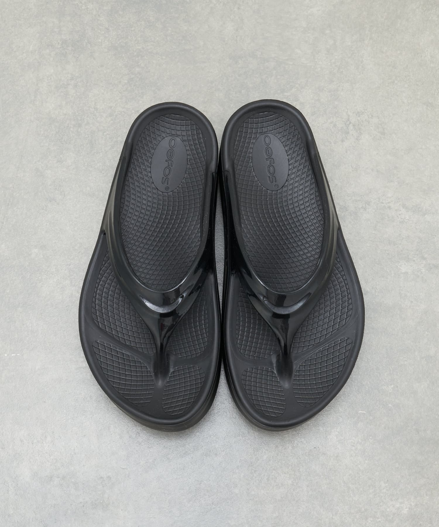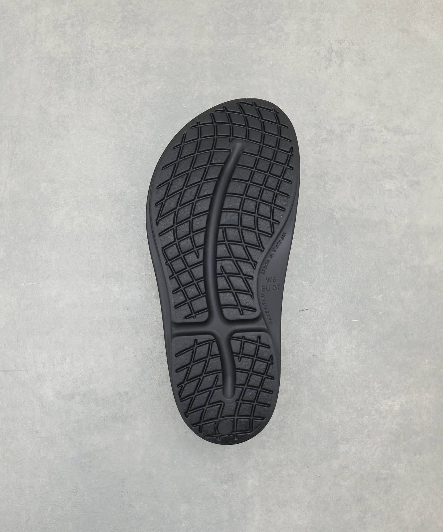 OOFOS® 製品に使われている特殊素材 OOfoam は、前進力を生む事を目的とした一般的な EVA 素材のミッドソールと異なり、衝撃の反発を 37% 抑えることができ着地による足裏への衝撃を軽減することができます。そのため膝、腰、背中にかかる負担を軽減でき、また人間工学に基づいて設計されたフットベットにより、足を優しく包み込み、土踏まずをしっかりサポートします。