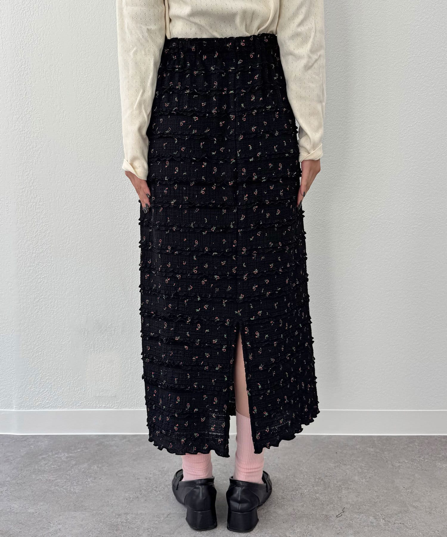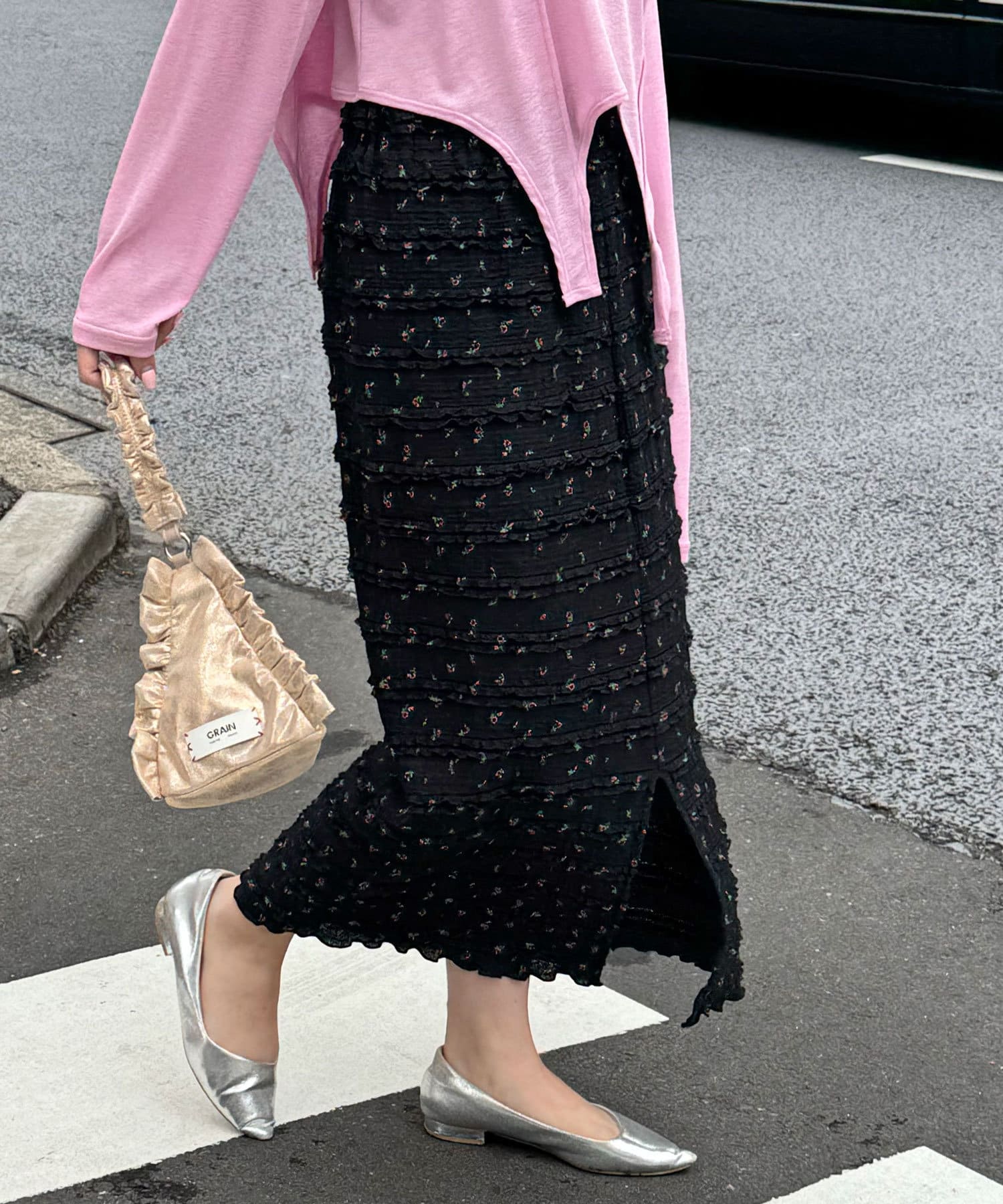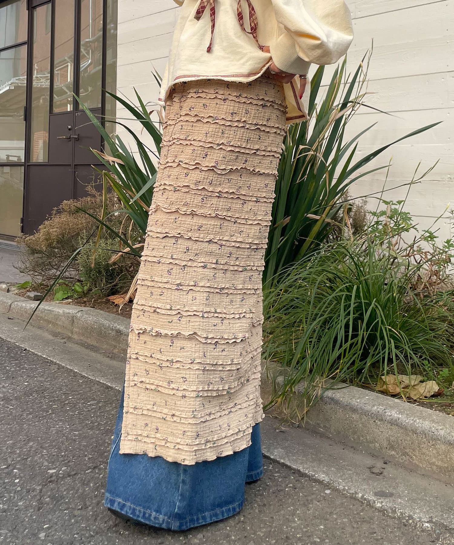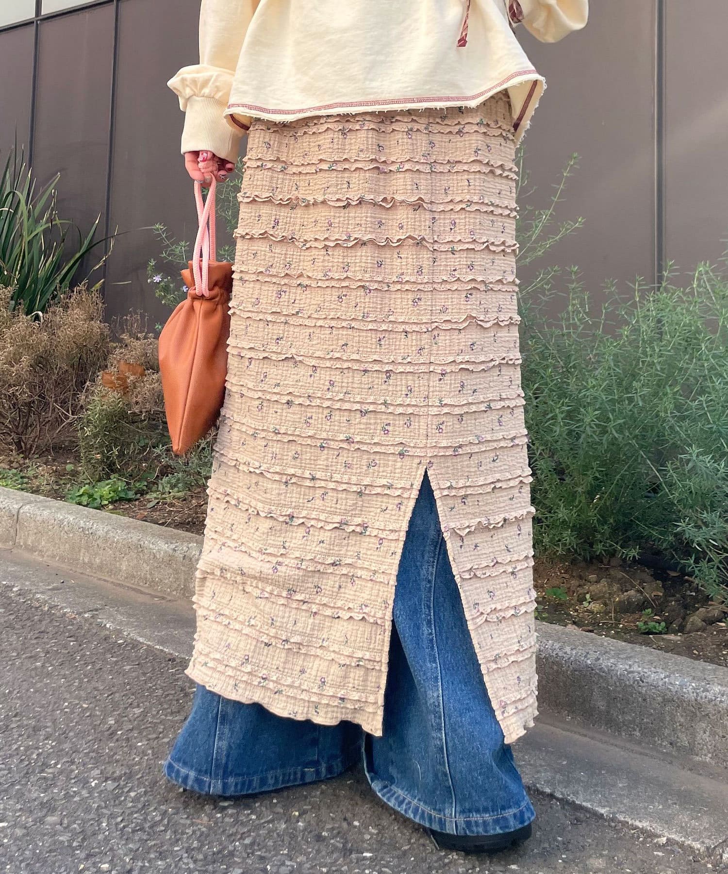 繊細な小花柄とフリルディテールが魅力のIラインスカート。