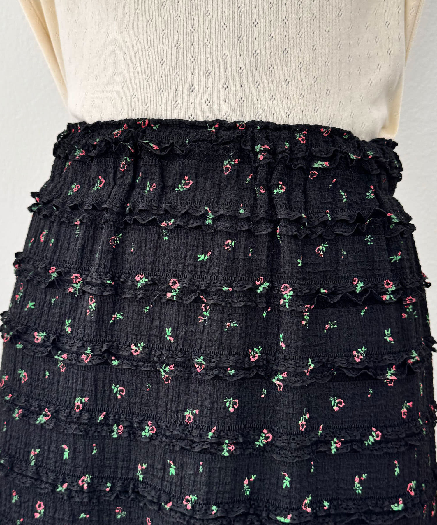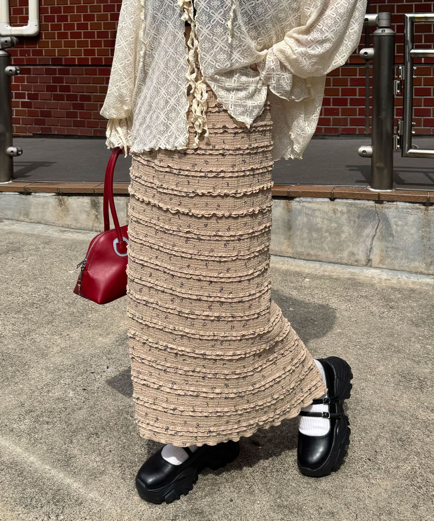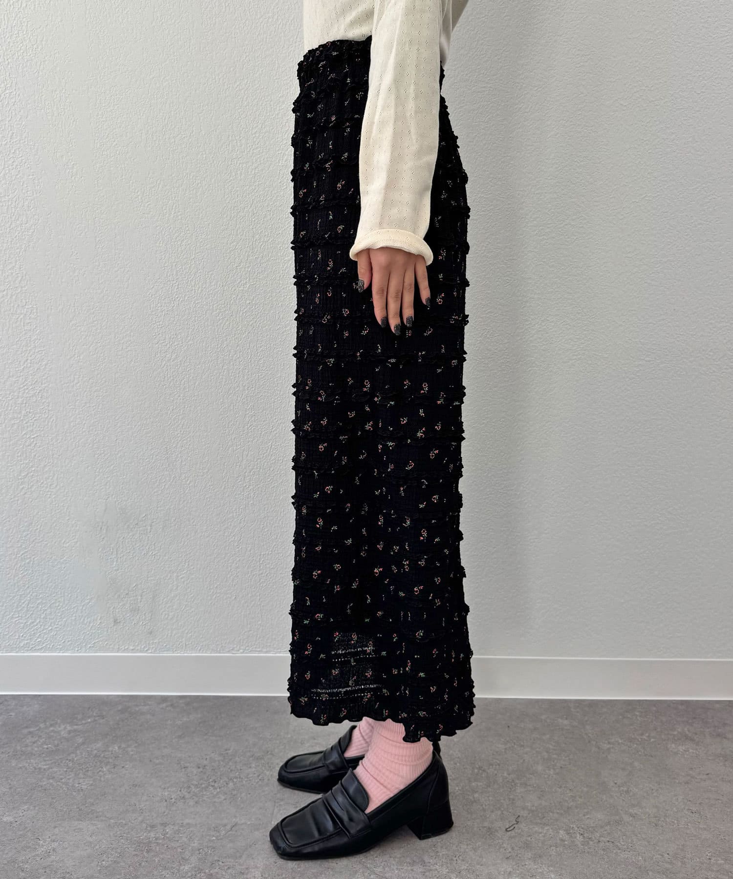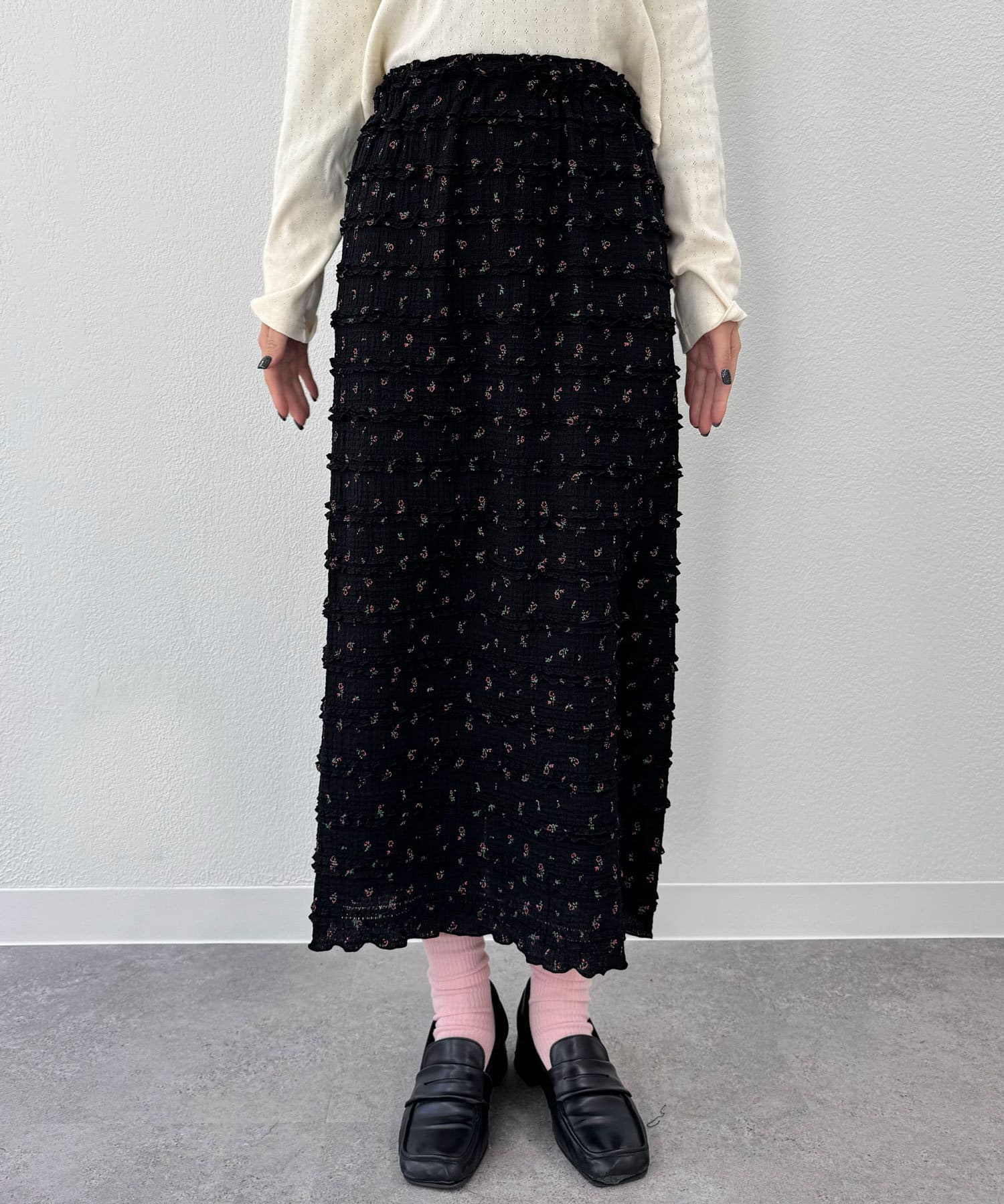 繊細な小花柄とフリルディテールが魅力のIラインスカート。