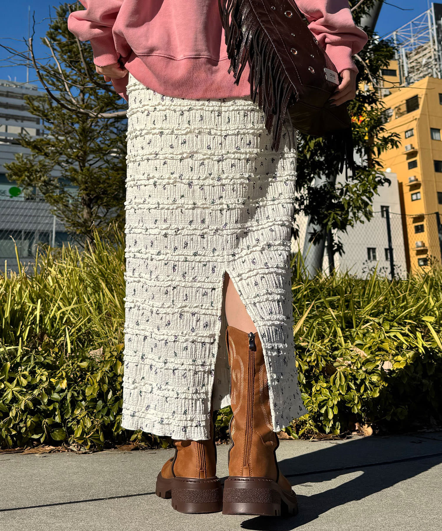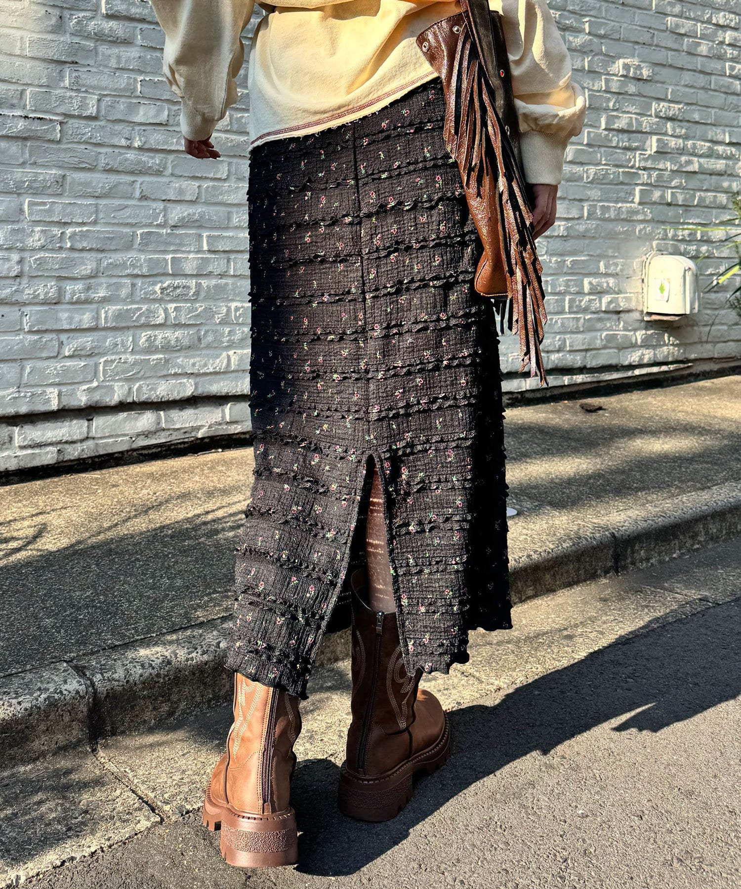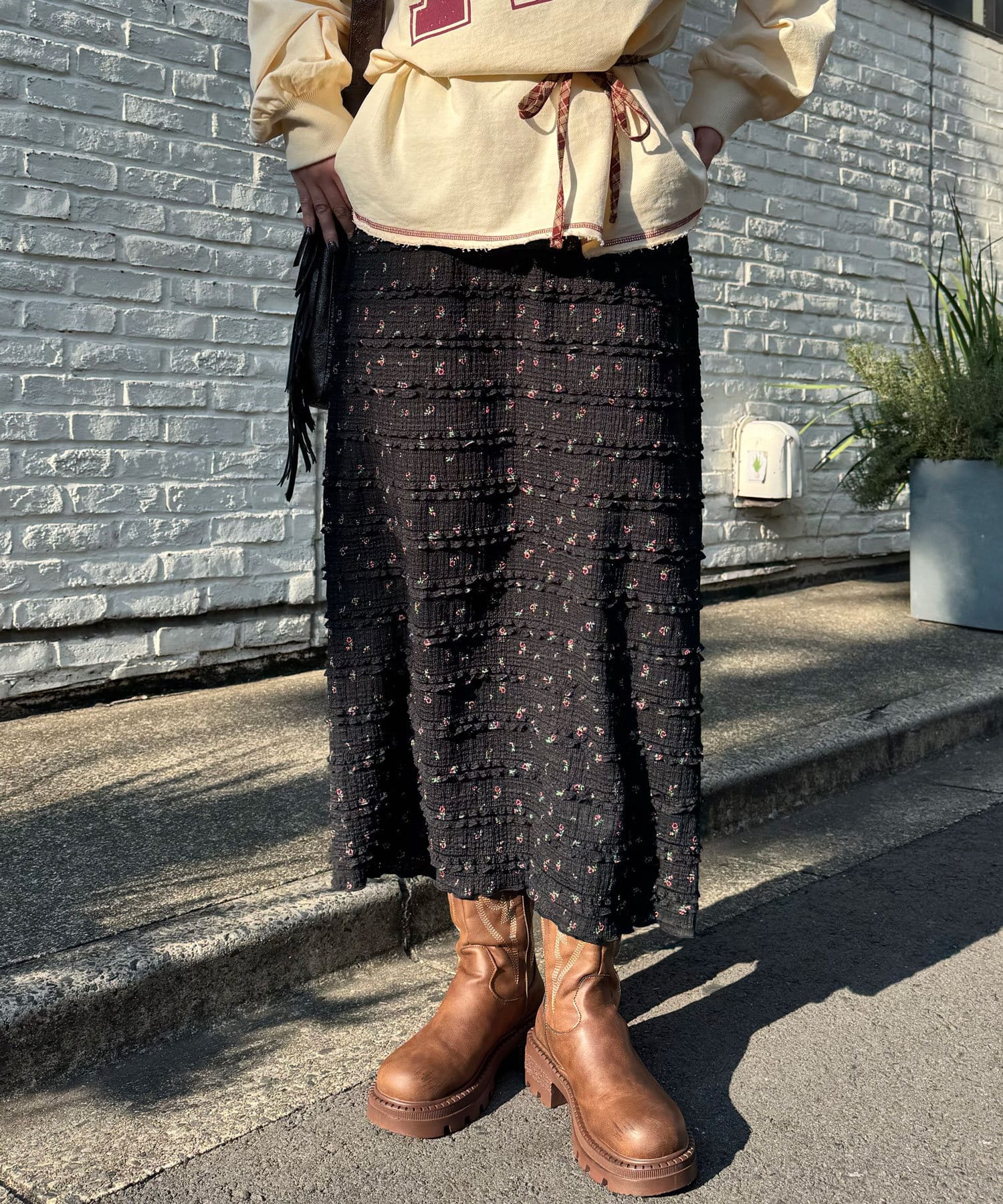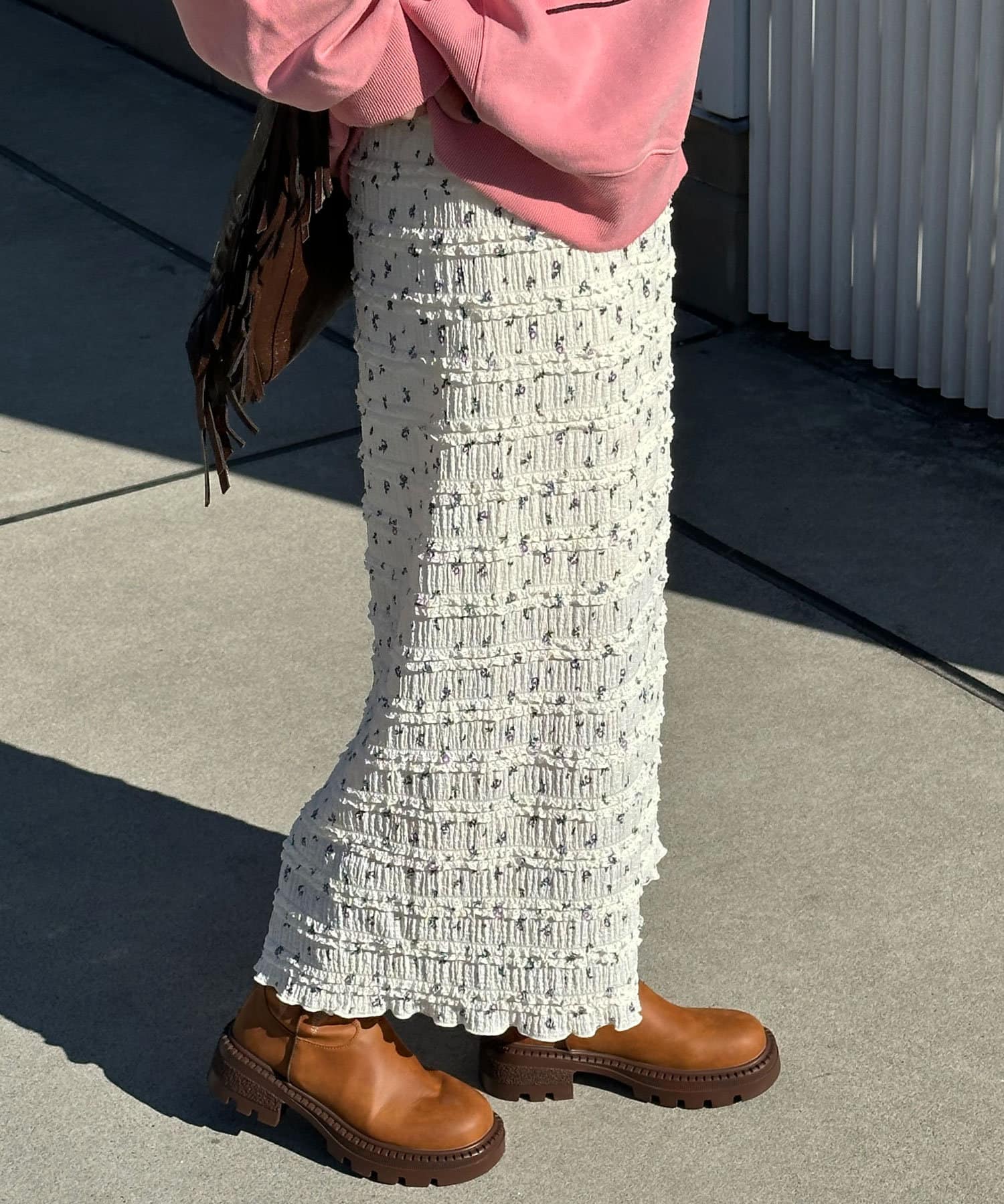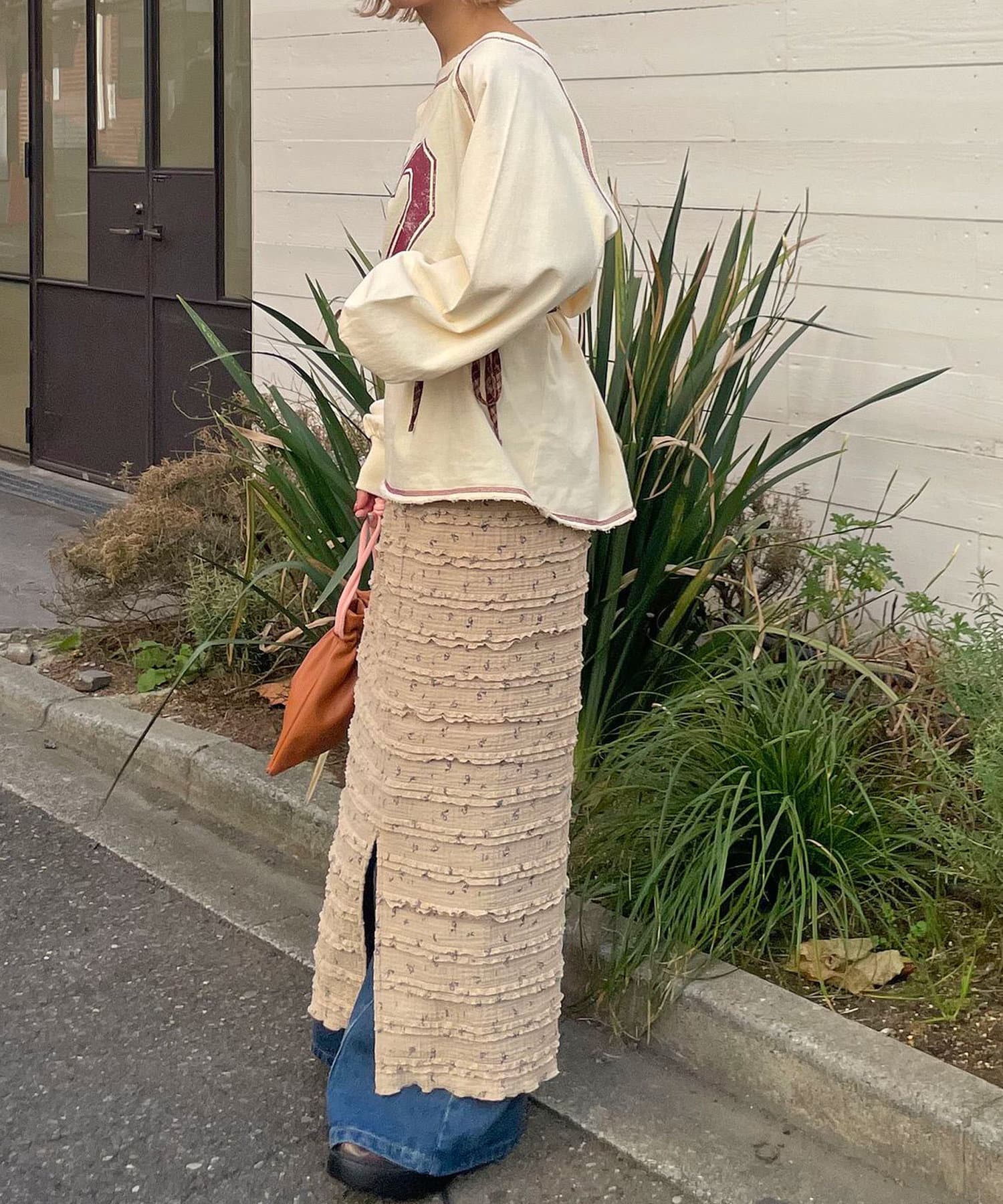 繊細な小花柄とフリルディテールが魅力のIラインスカート。