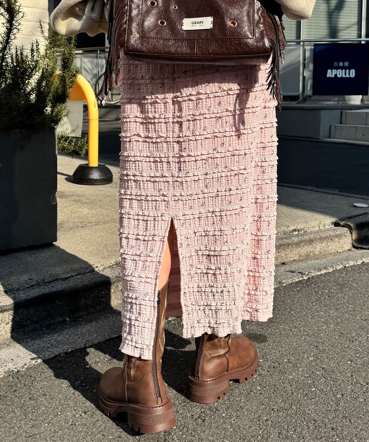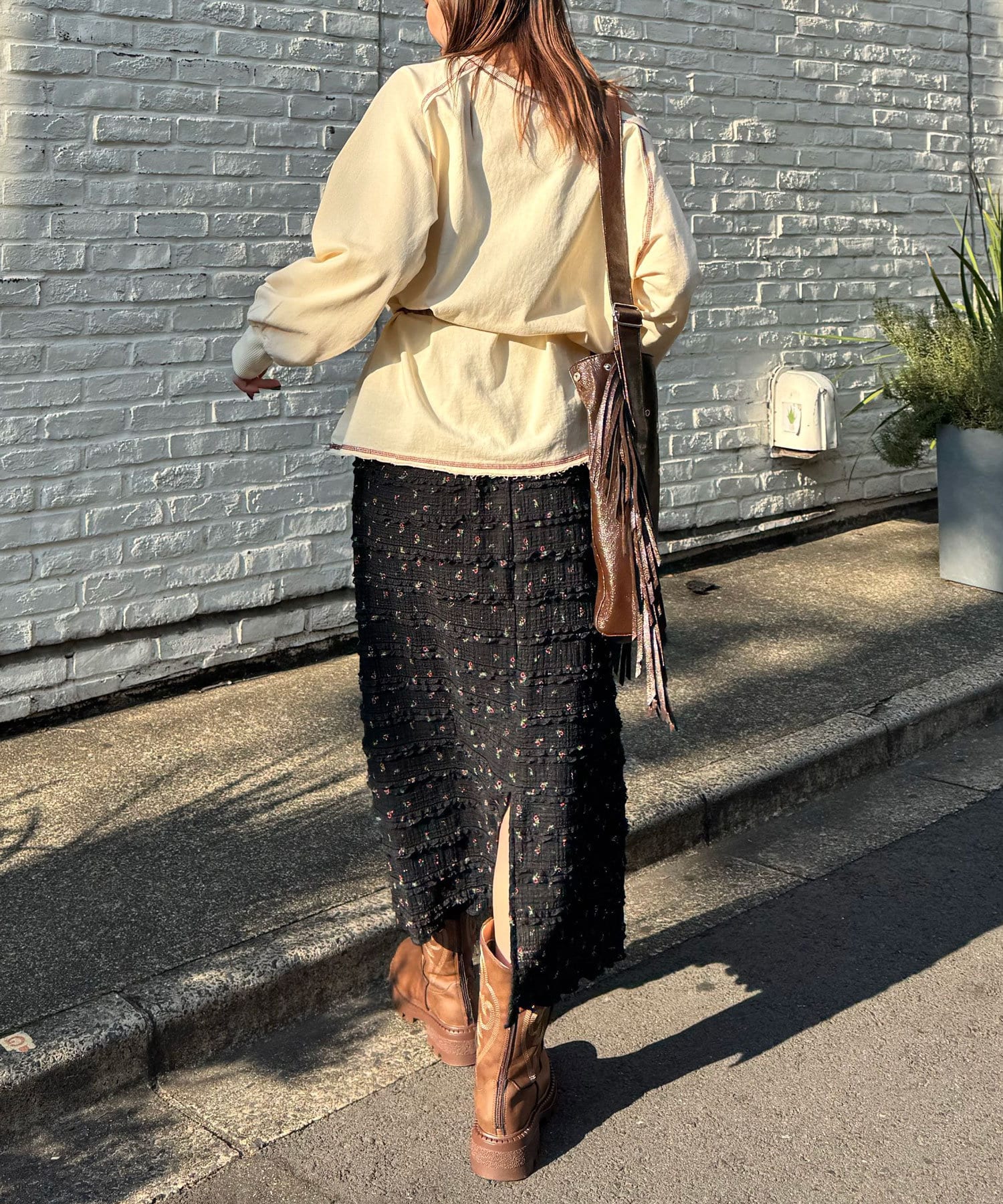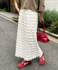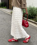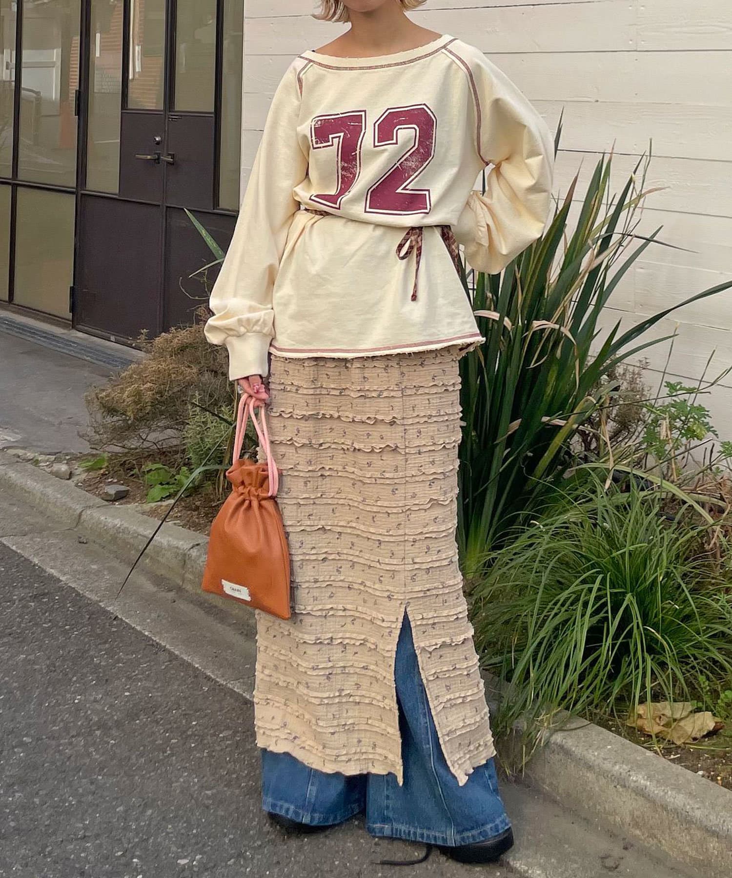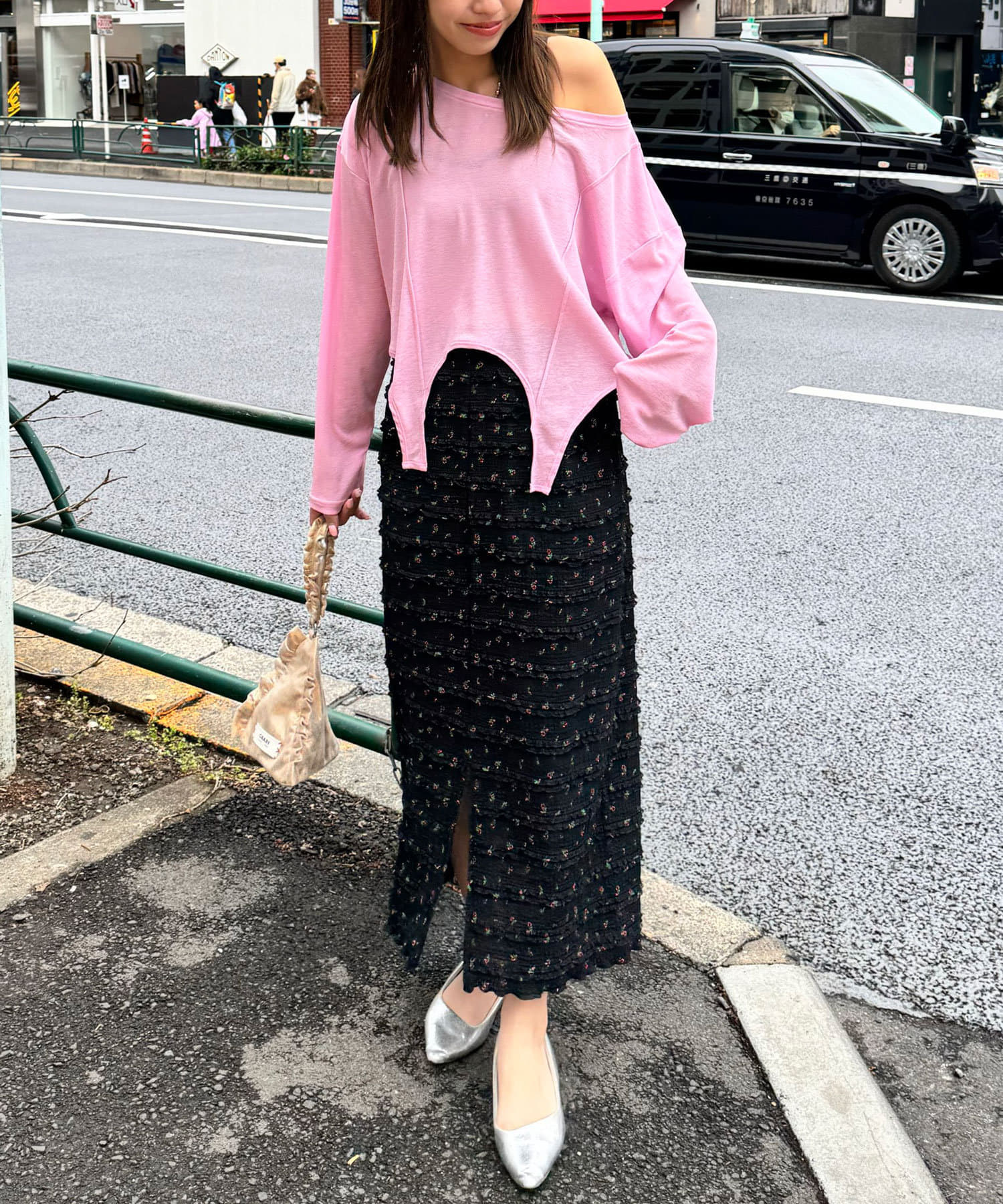 繊細な小花柄とフリルディテールが魅力のIラインスカート。