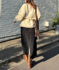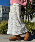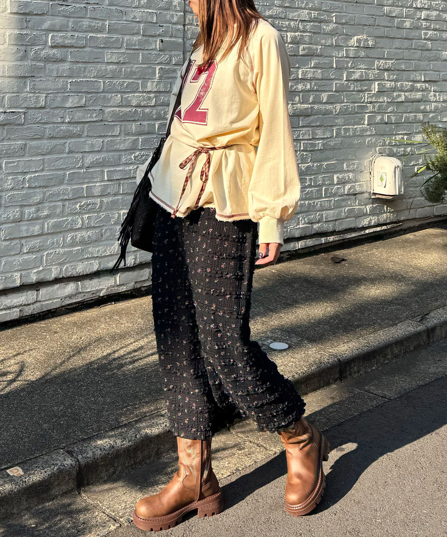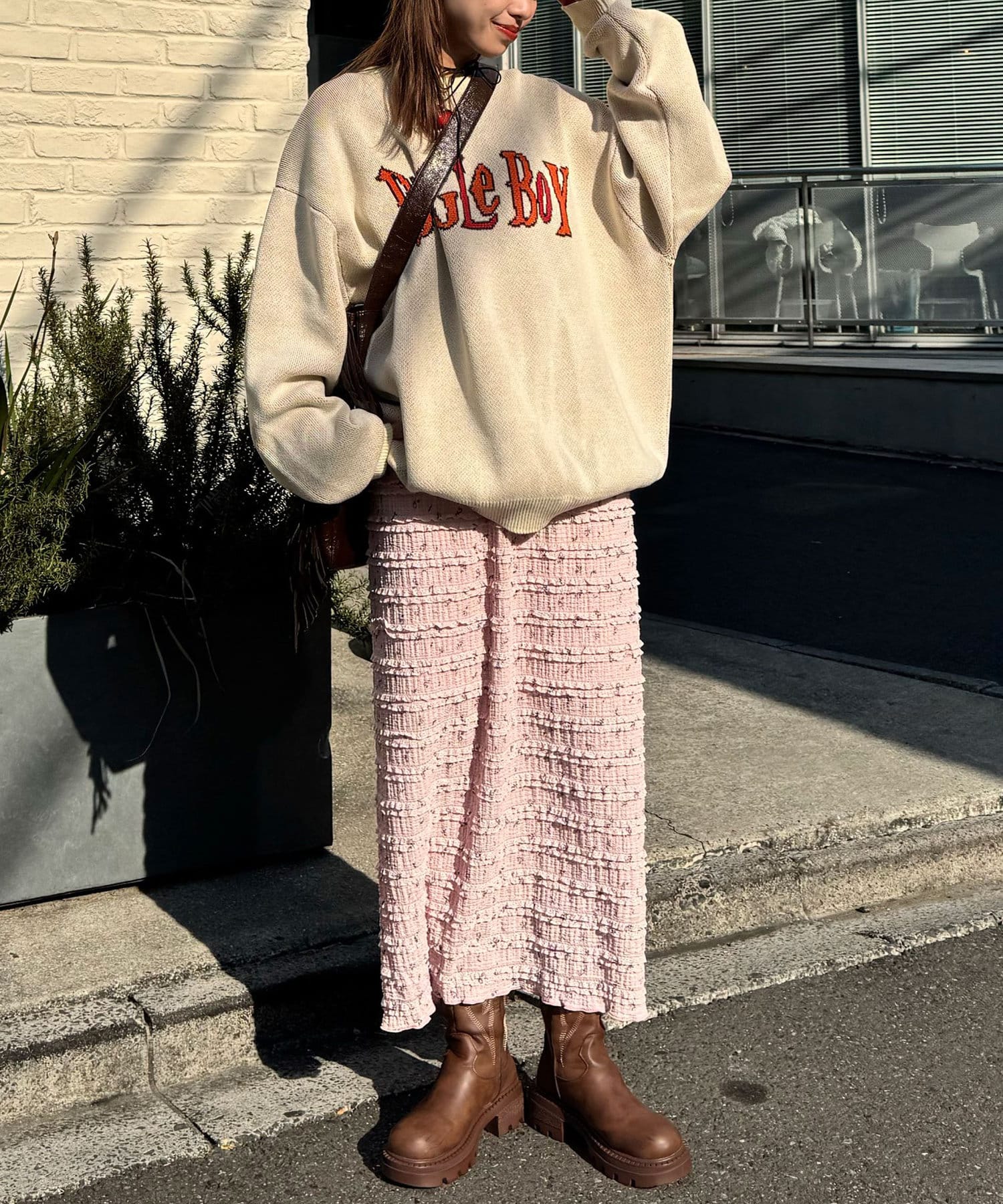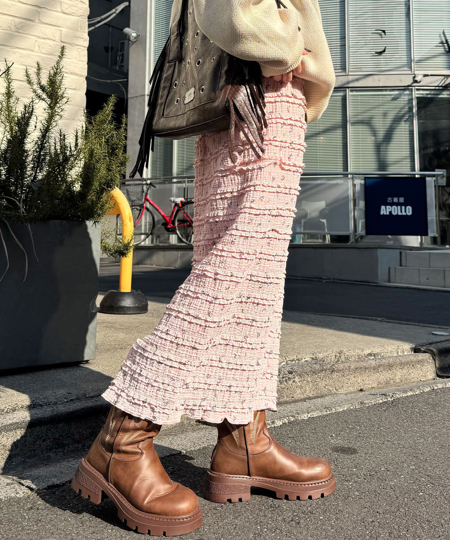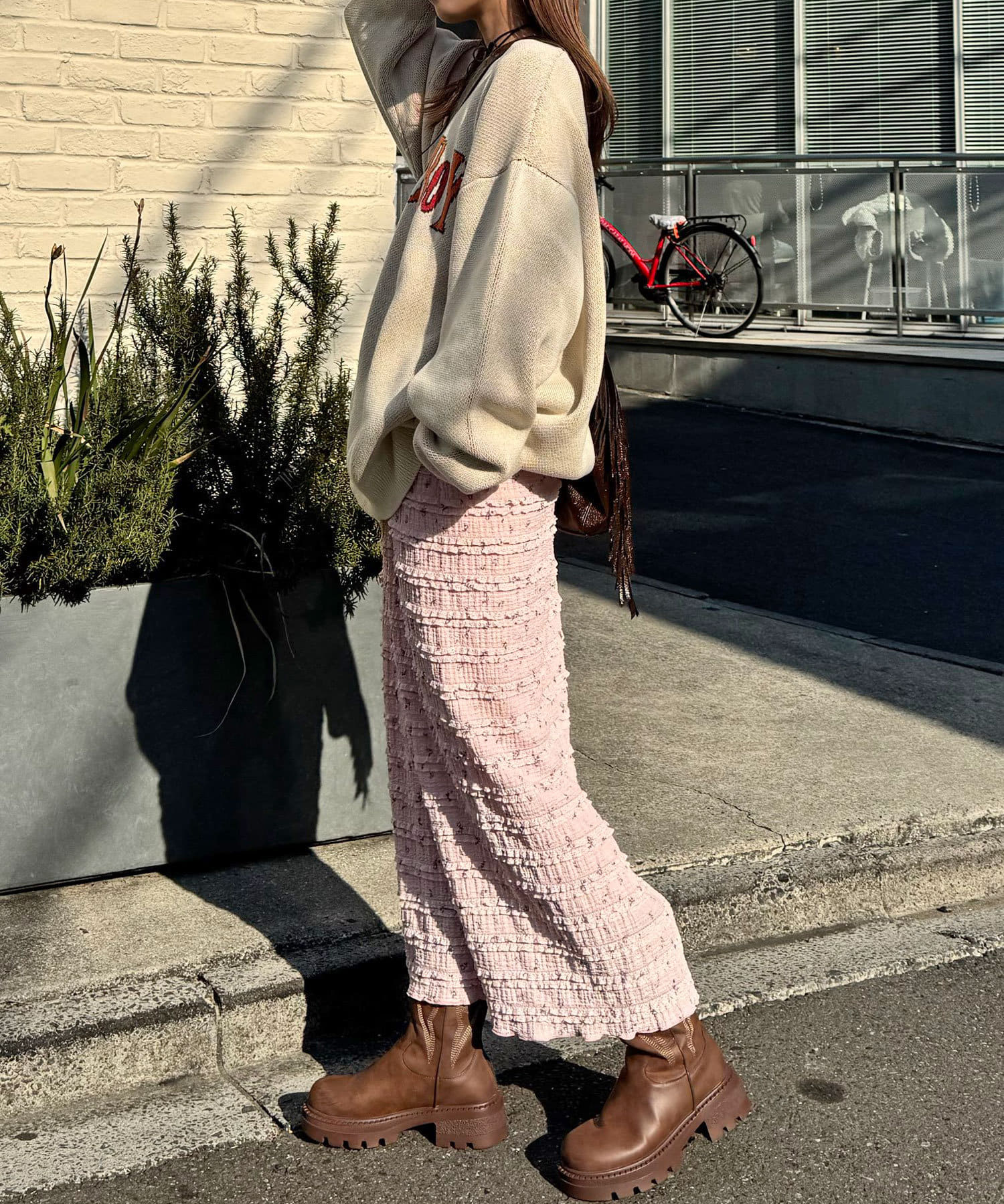 タイトなリブニットとショートブーツを合わせて、大人っぽくスタイルアップ。