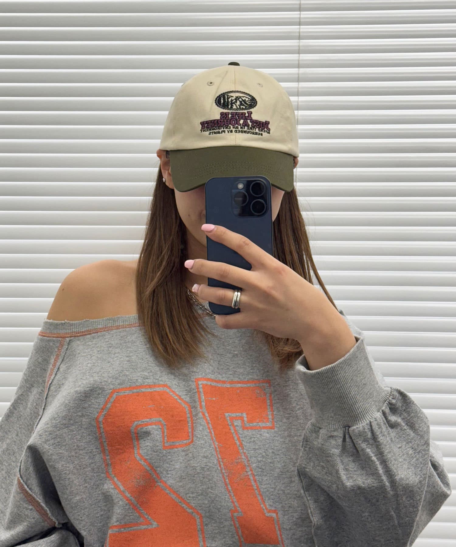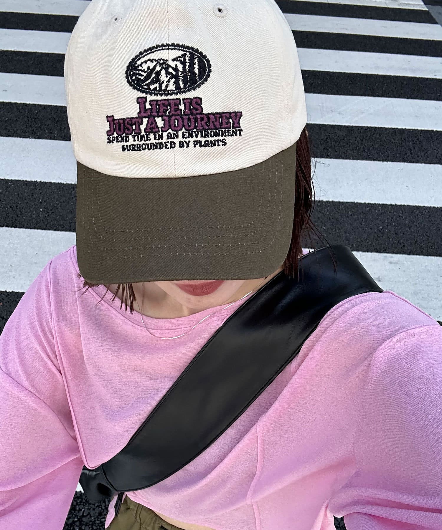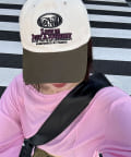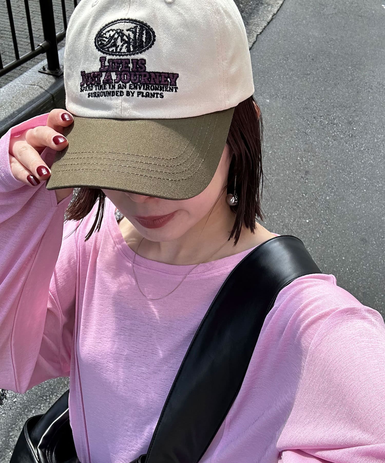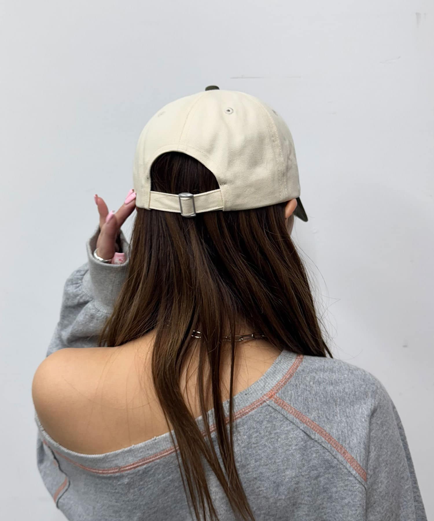 ツバとトップの配色が個性的で、シンプルなコーデに取り入れるだけでこなれた印象に。
