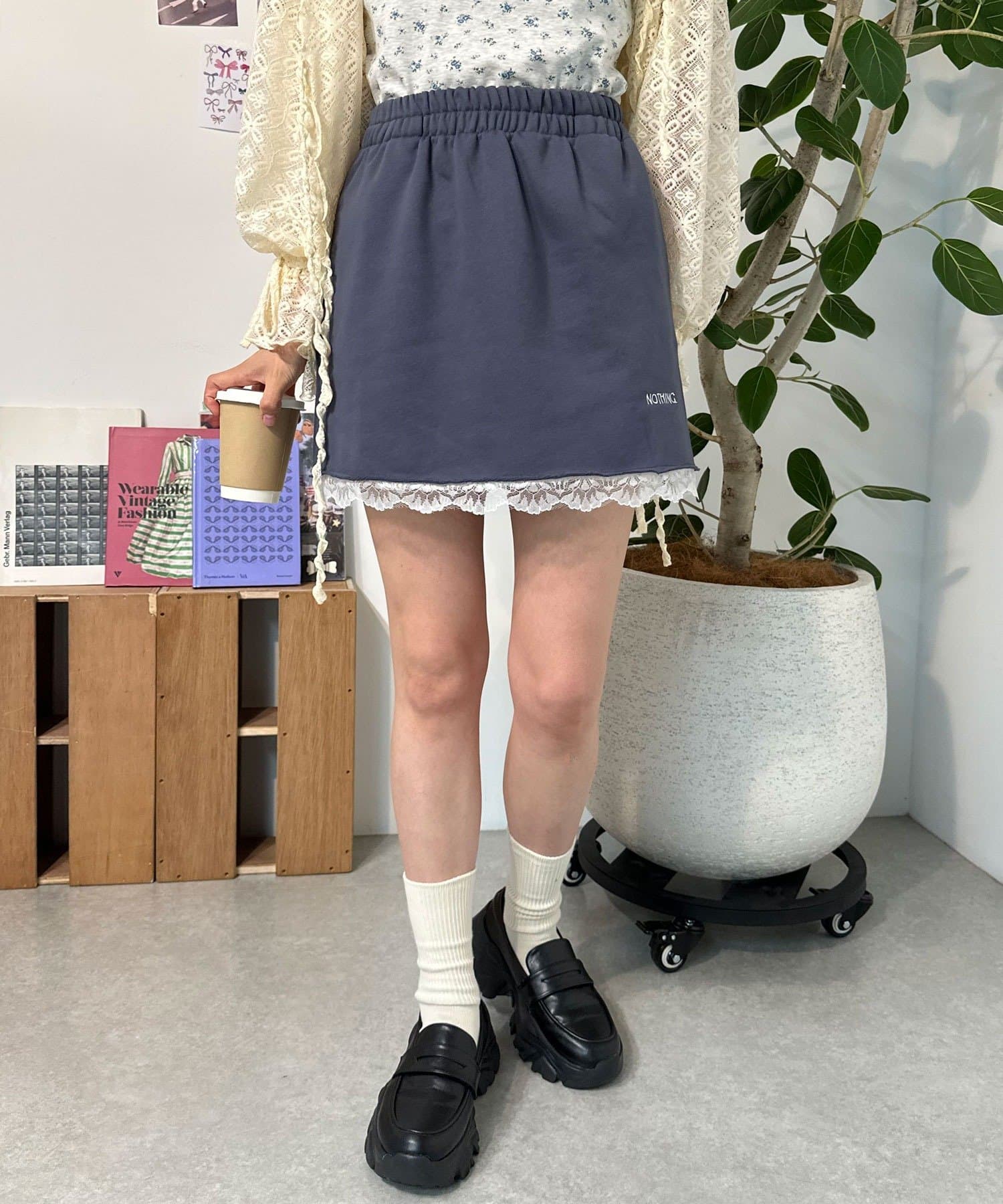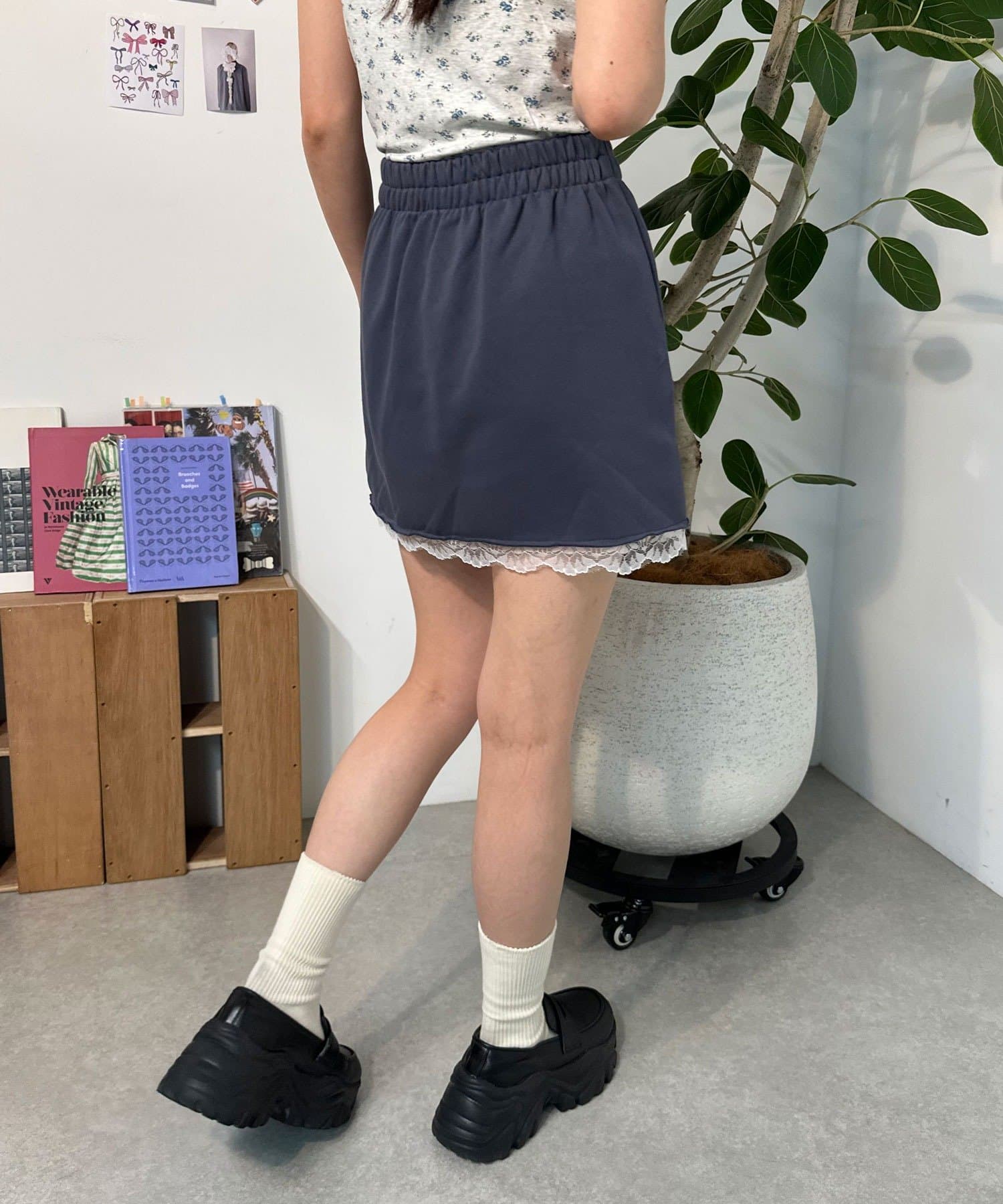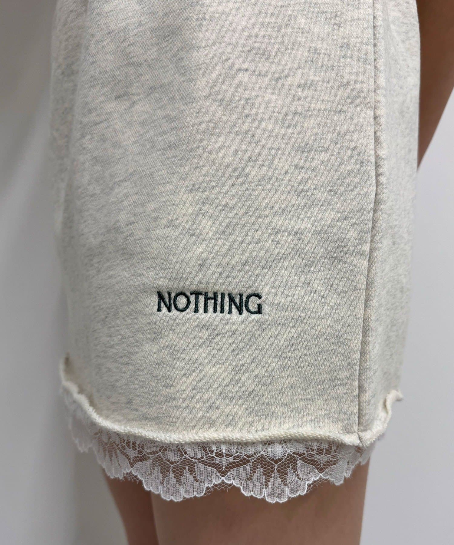 カジュアルなスウェット素材に、裾の繊細なレースをプラスしたミニスカート。