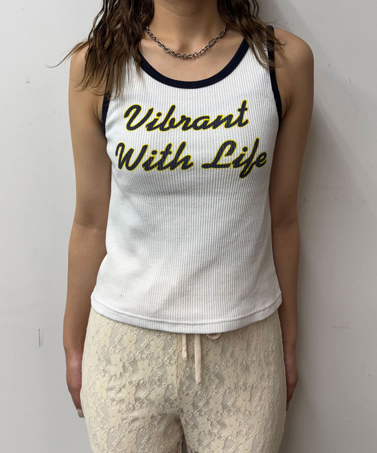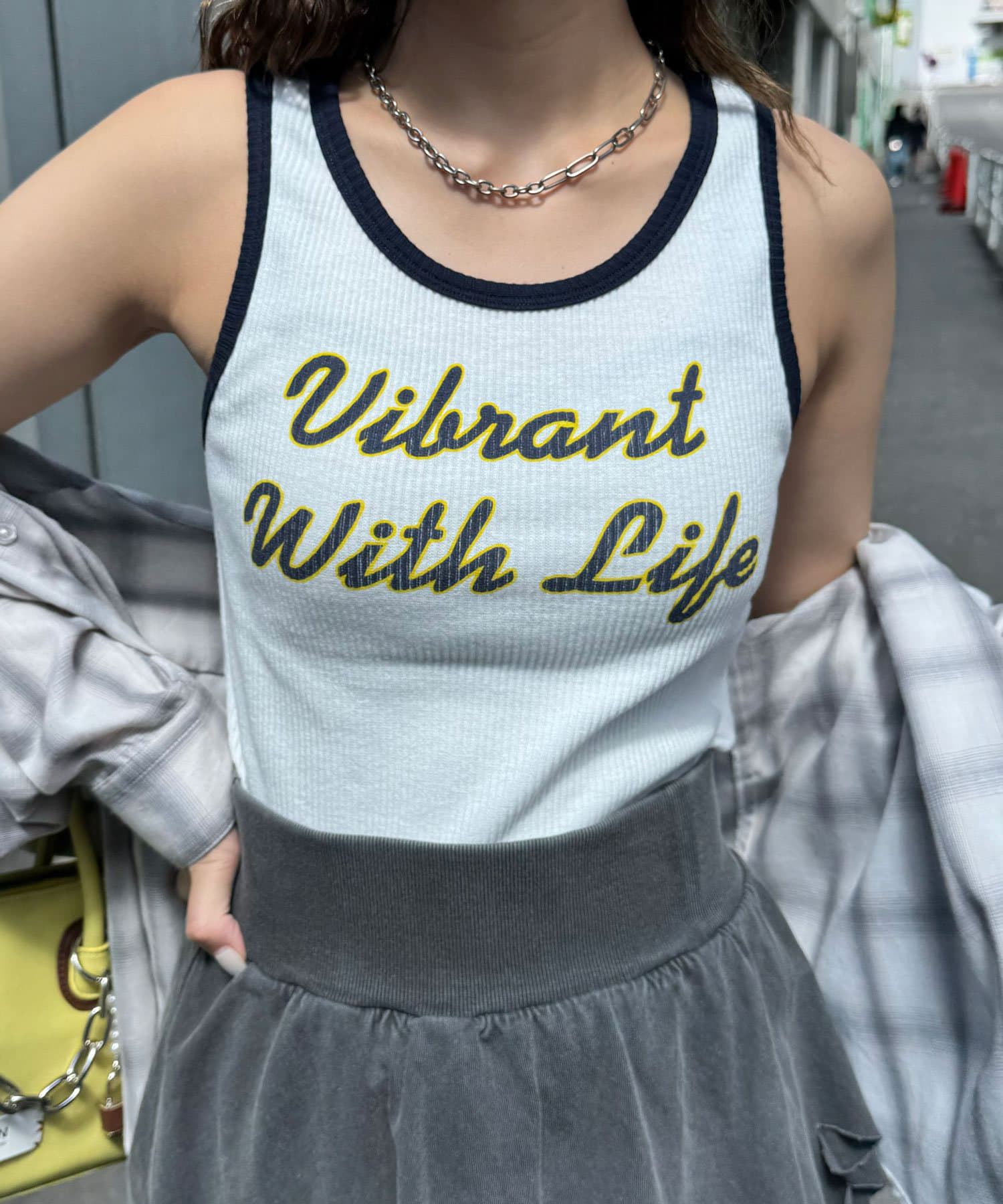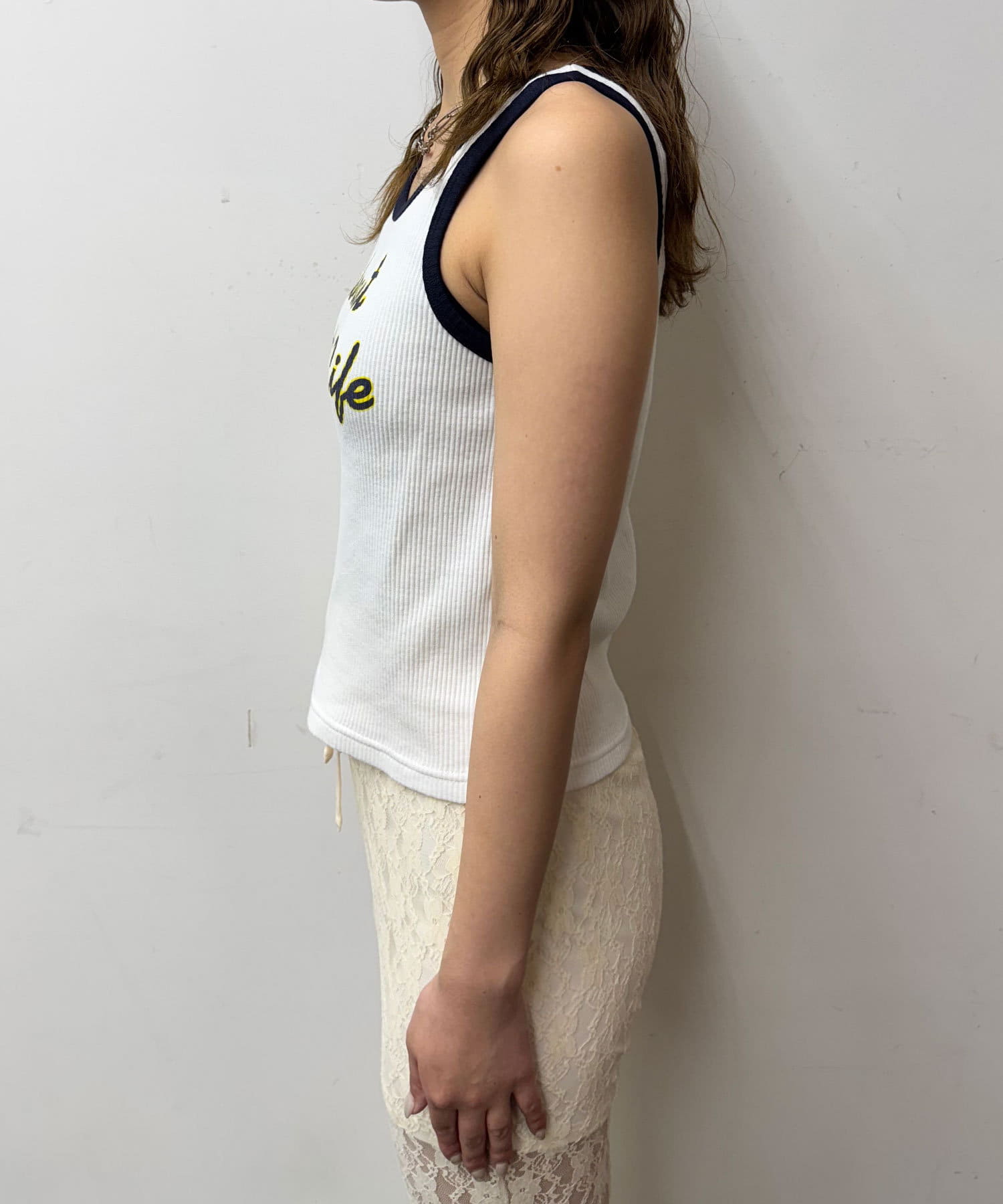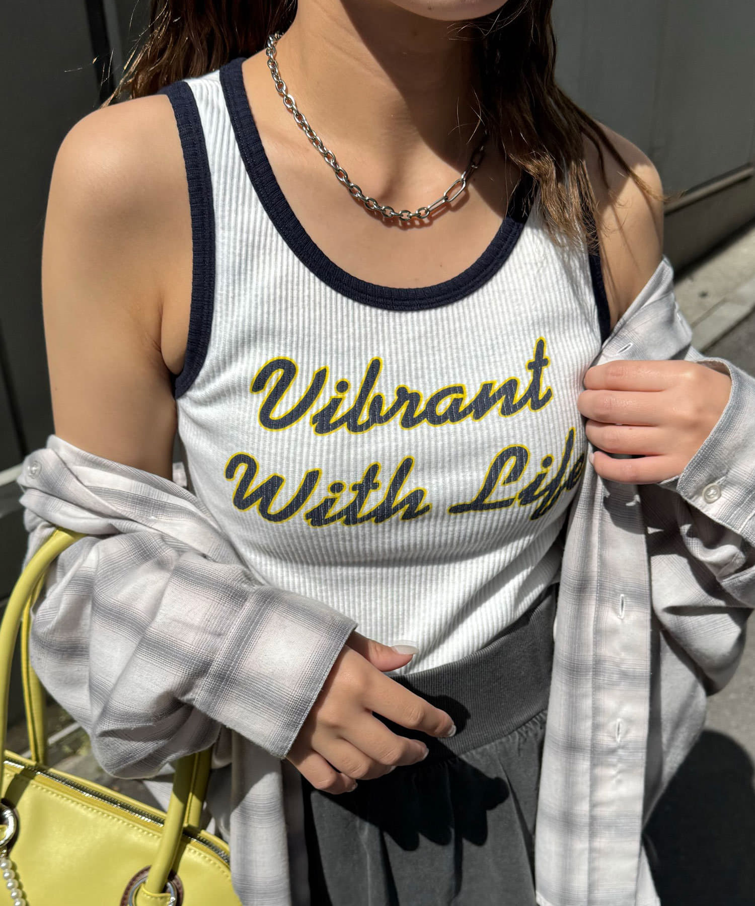 フロントのロゴデザインが視線を引く、リブ素材のタンクトップ。