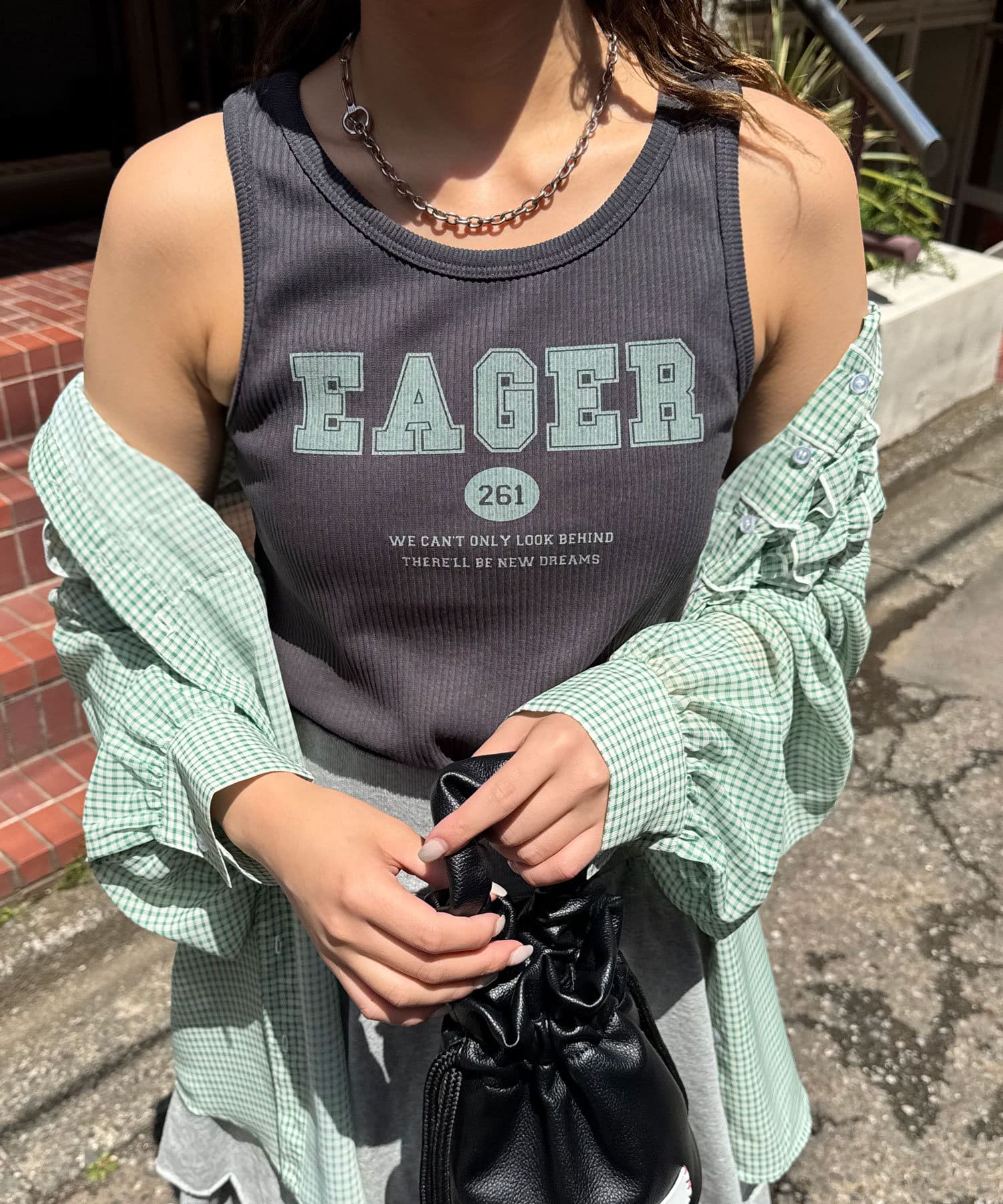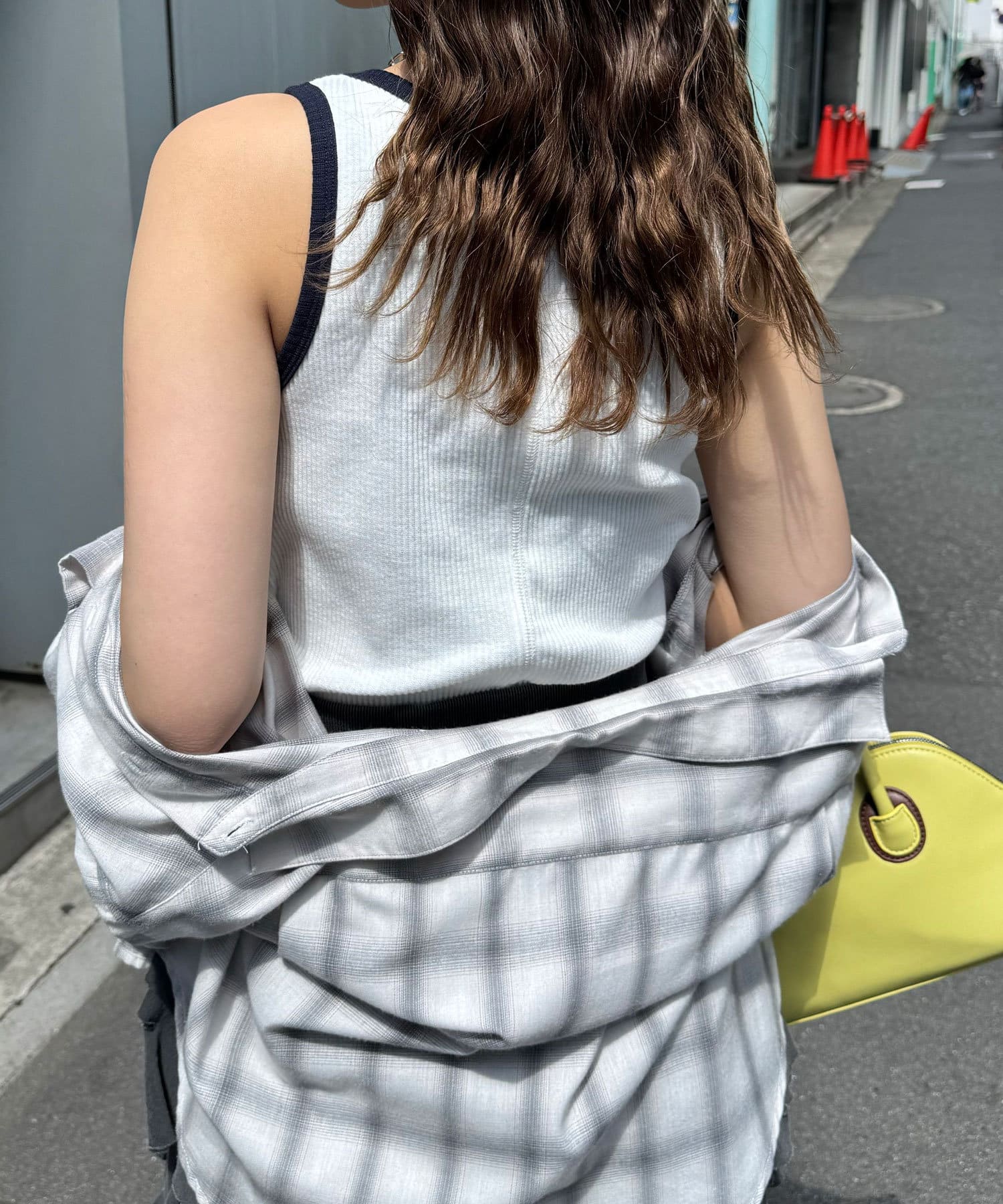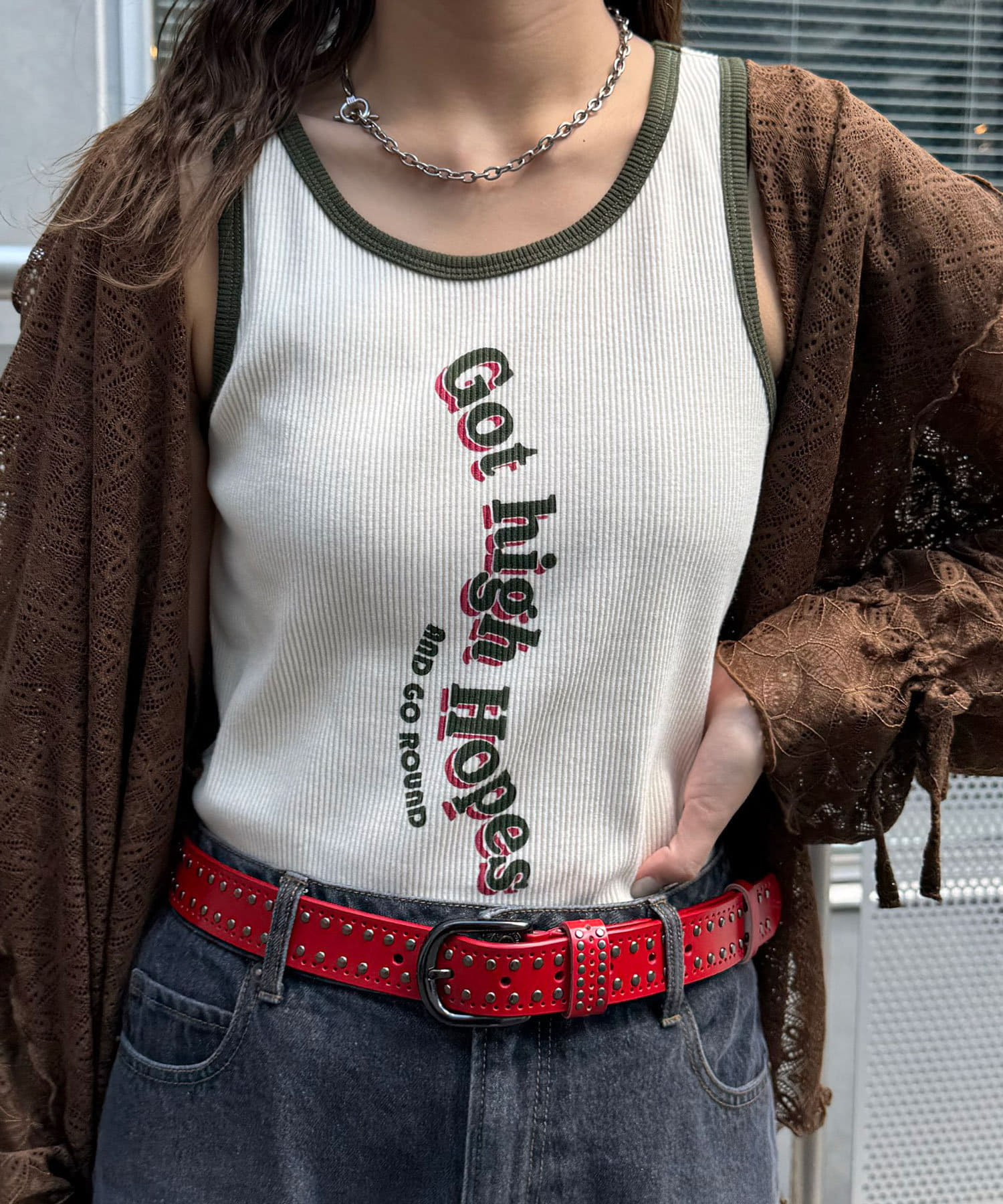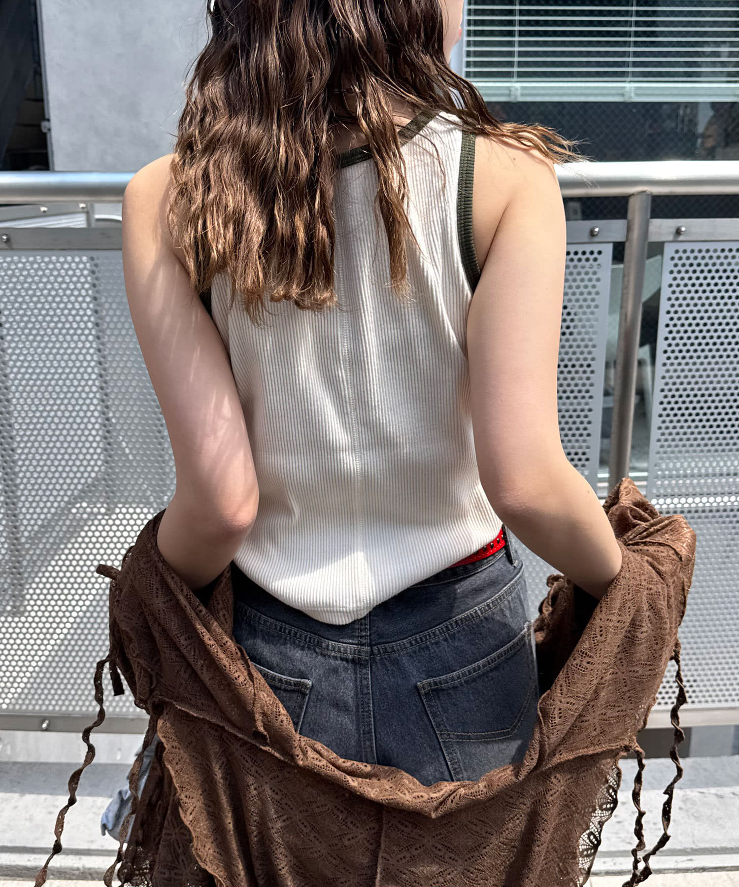 フロントのロゴデザインが視線を引く、リブ素材のタンクトップ。