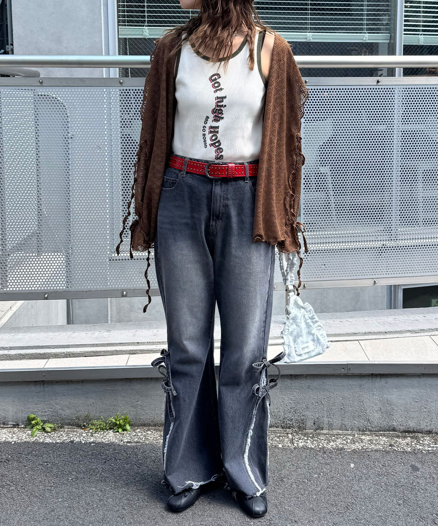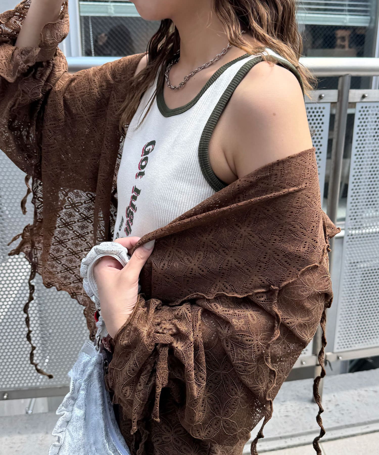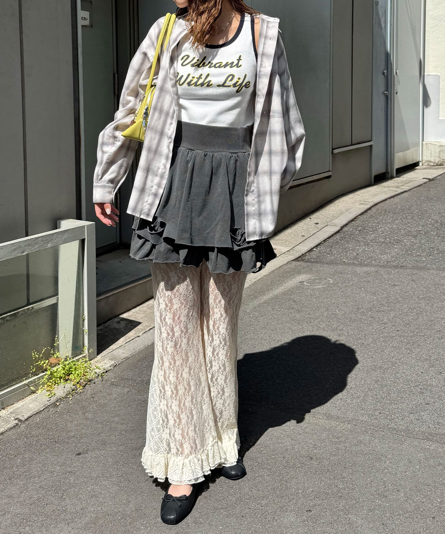 シアーカーディガンやメッシュトップスとレイヤードして、透け感を楽しむ着こなしに。