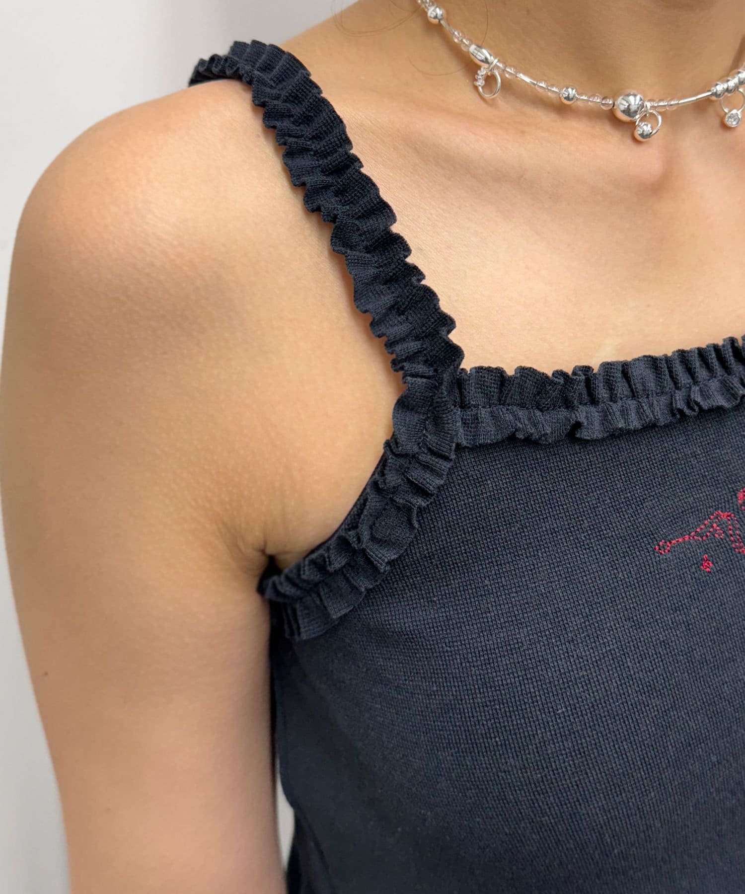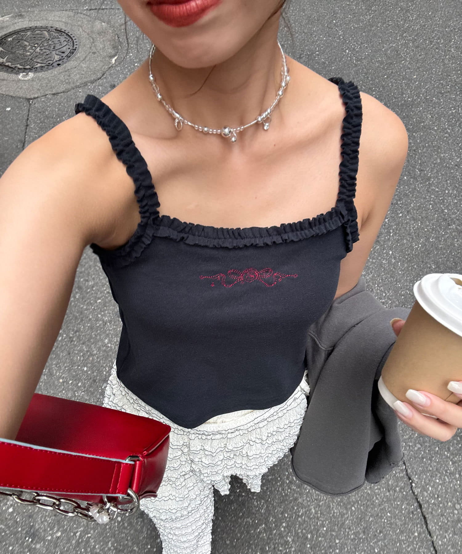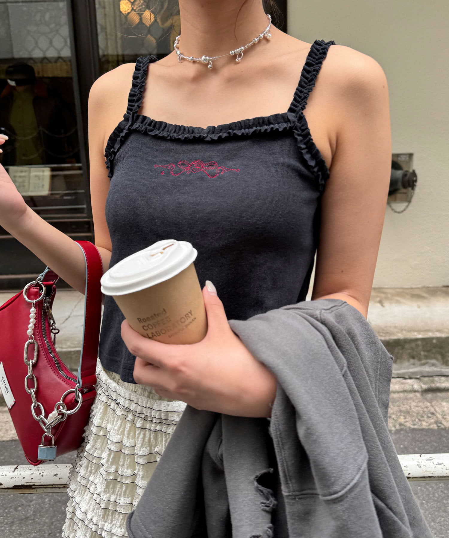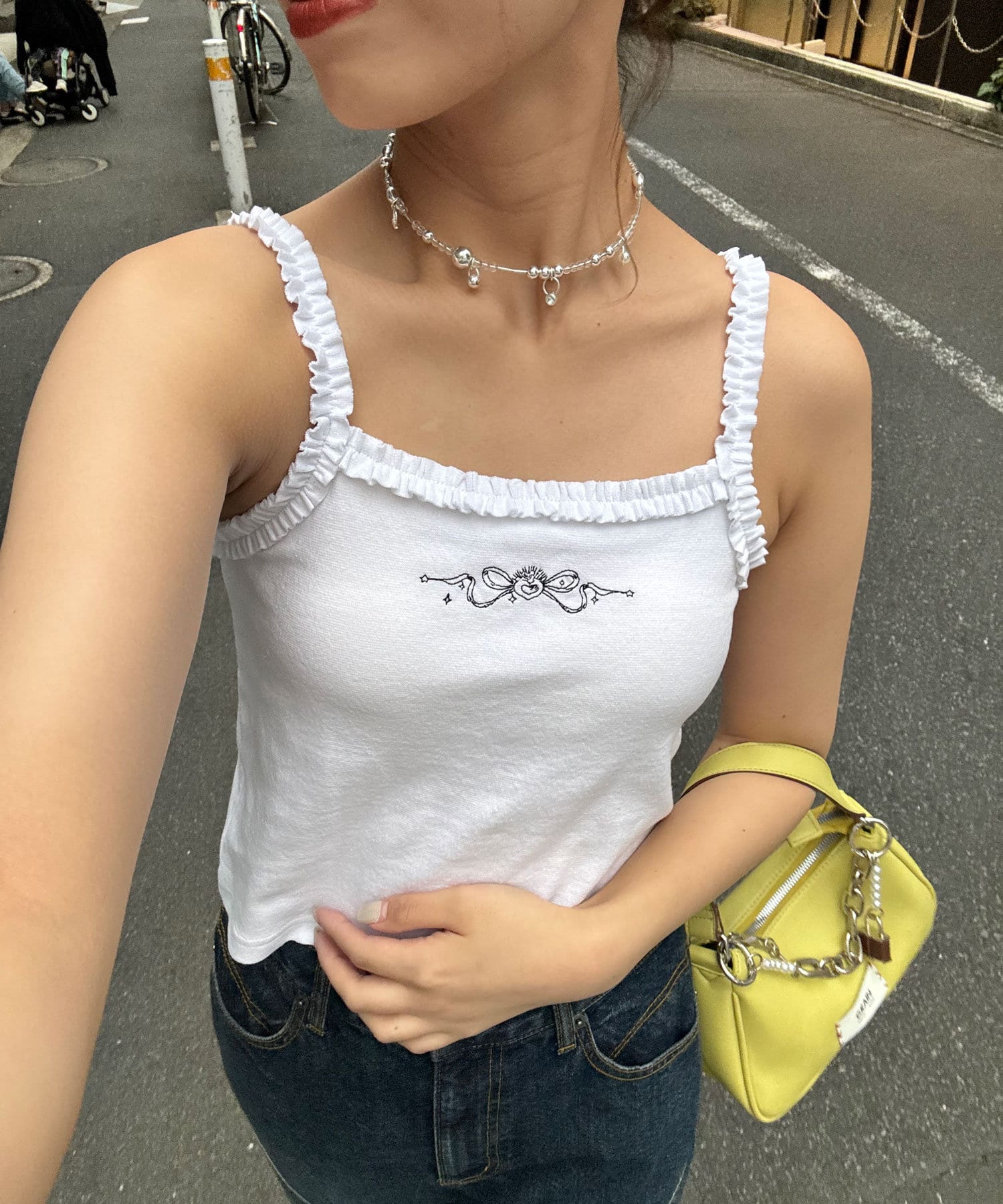胸元のフリルテープとワンポイント刺繍が目を惹く、カップ付きキャミソール。