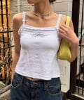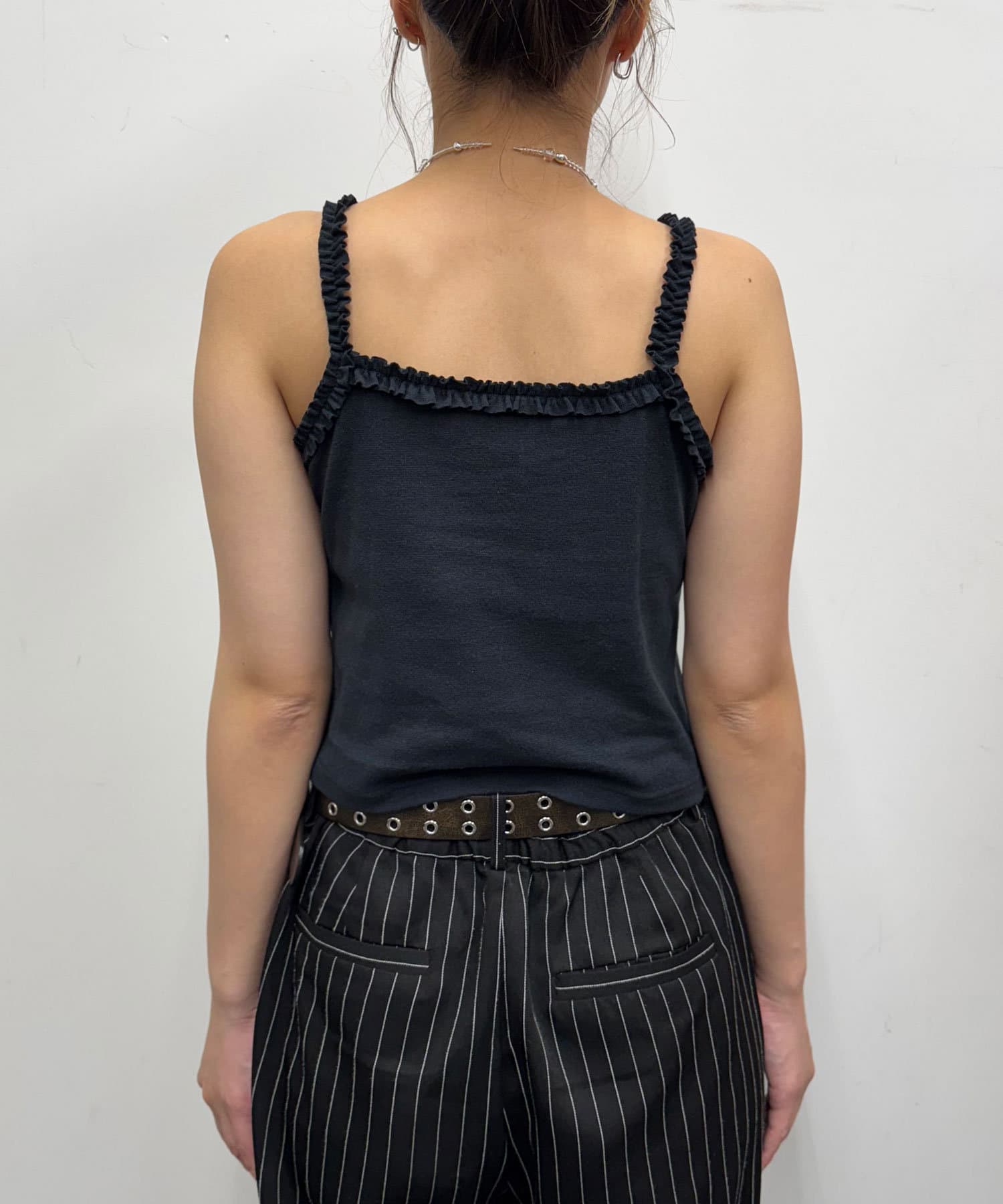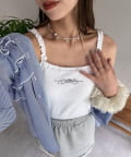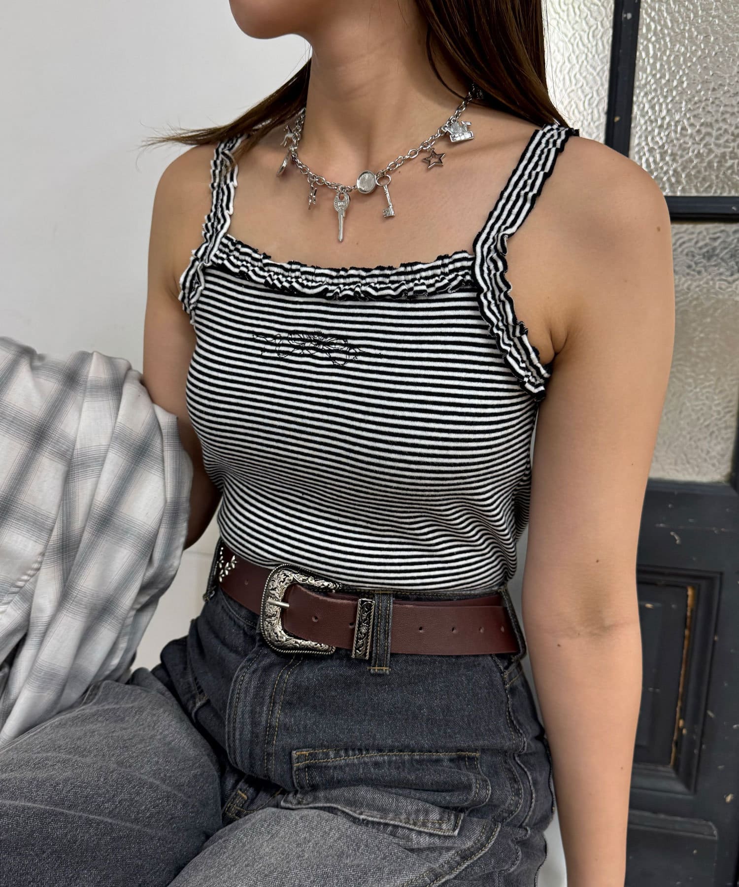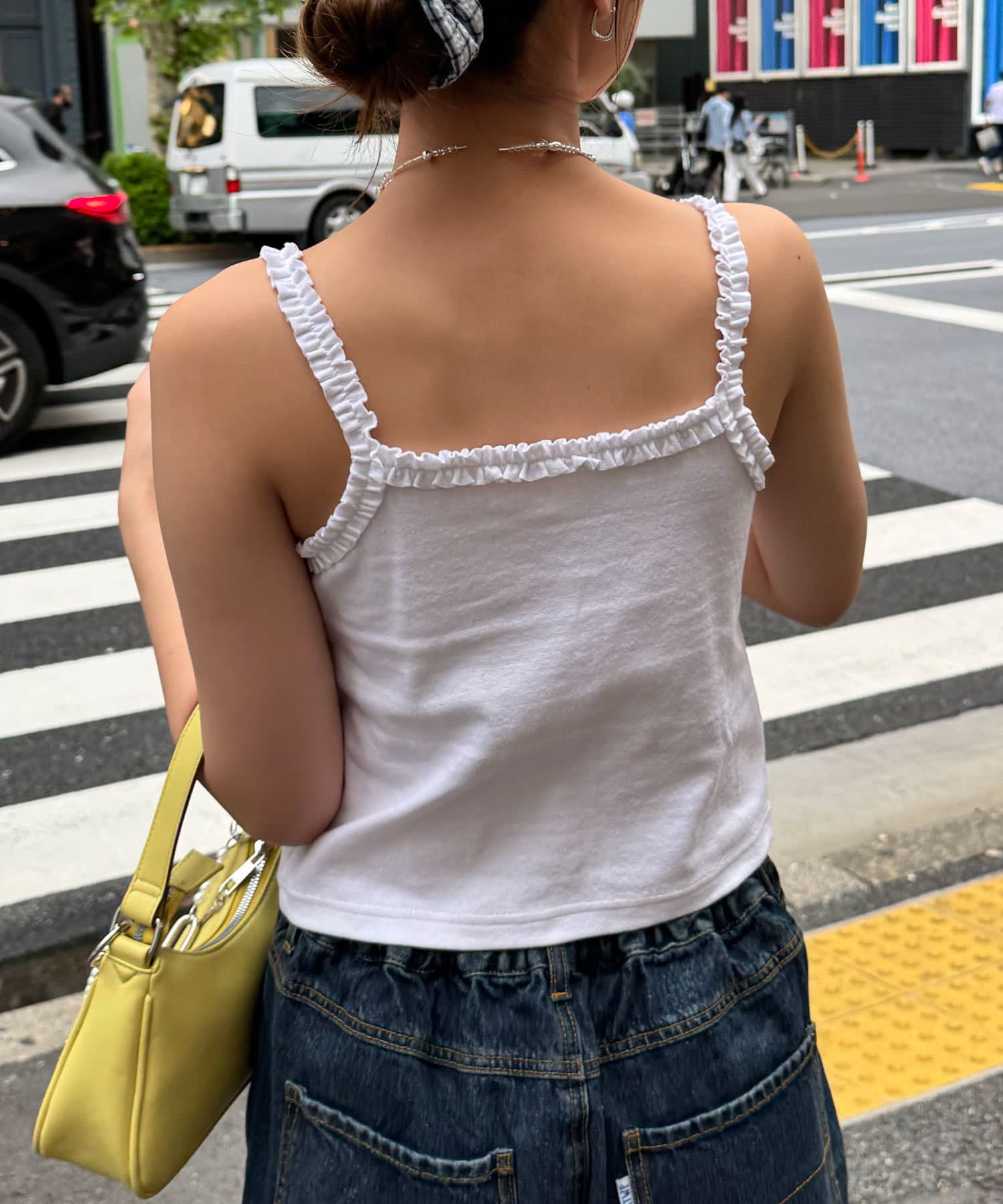 胸元のフリルテープとワンポイント刺繍が目を惹く、カップ付きキャミソール。