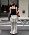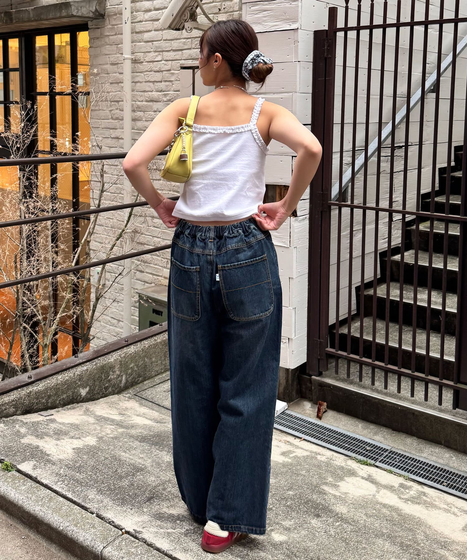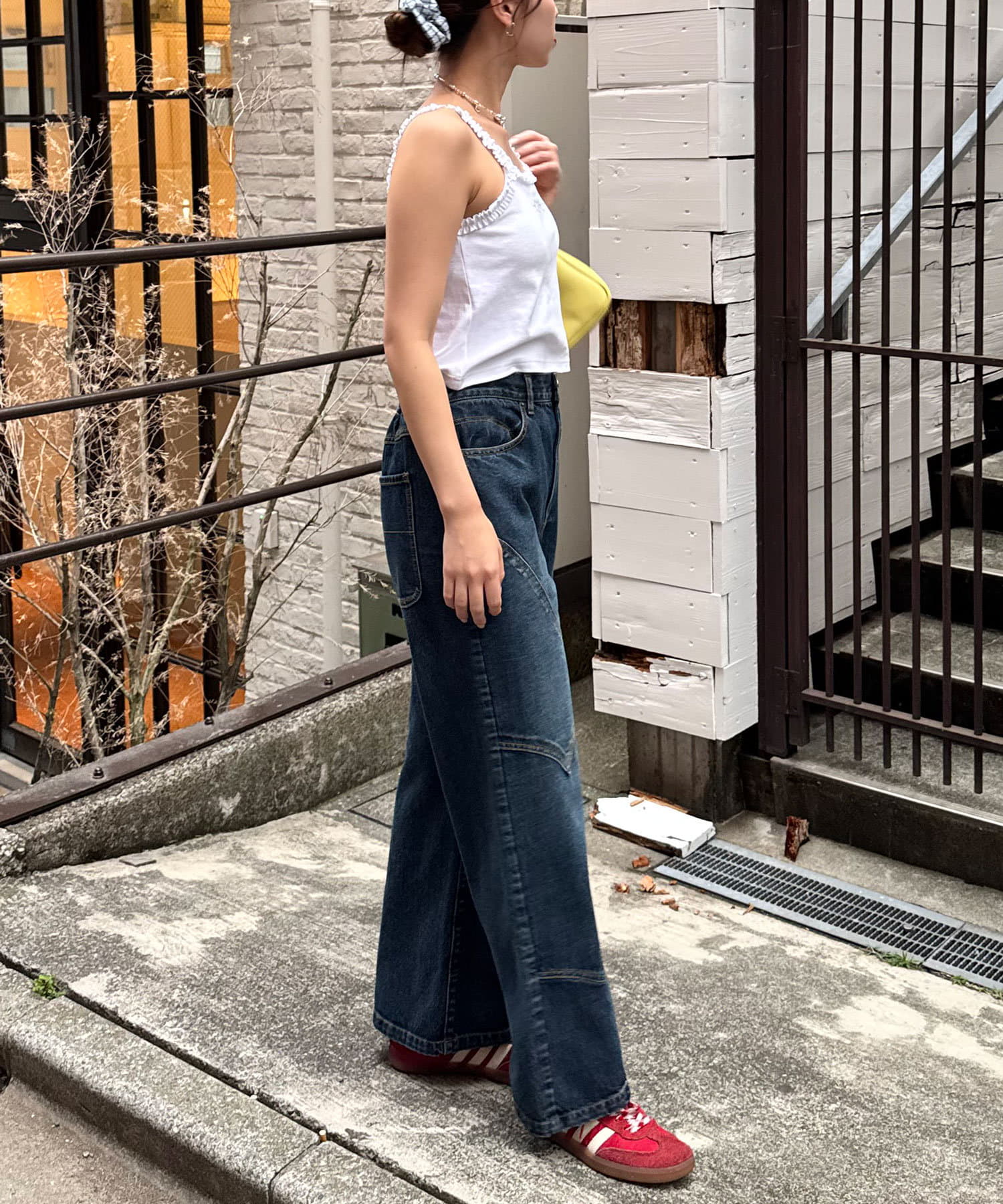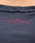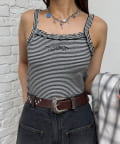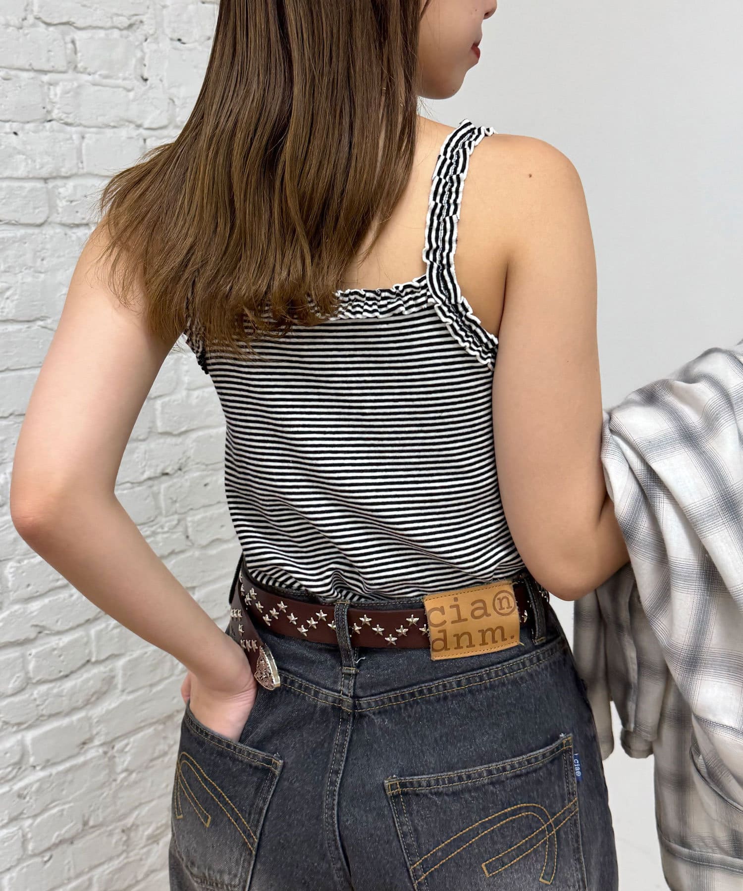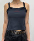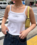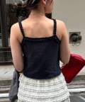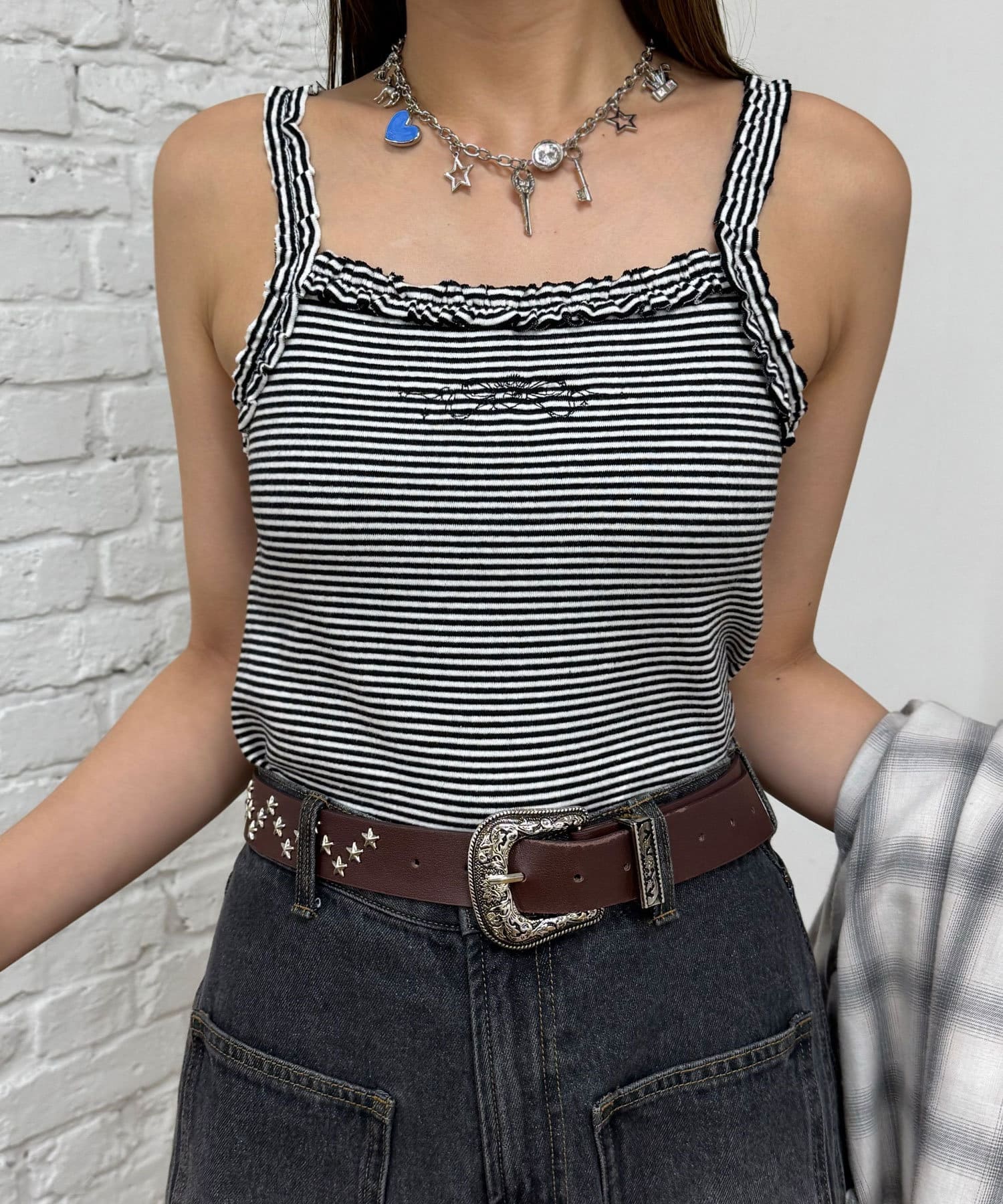 胸元のフリルテープとワンポイント刺繍が目を惹く、カップ付きキャミソール。