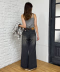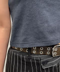 ローライズパンツやミニスカートに合わせて、90s風のヘルシー肌見せコーデに。