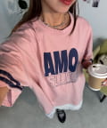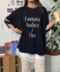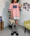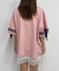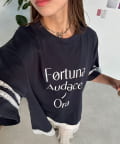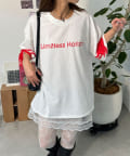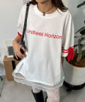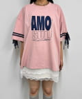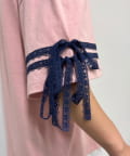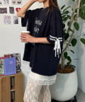 存在感のあるロゴプリントに、袖のリボン&レーステープで可愛らしさをプラスしたデザインTシャツ。