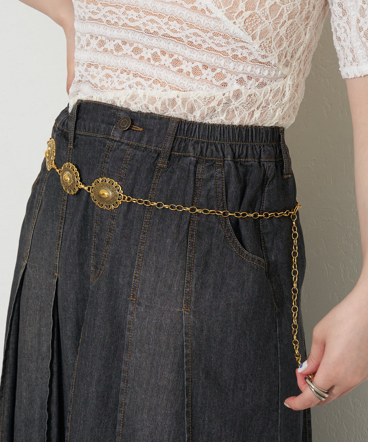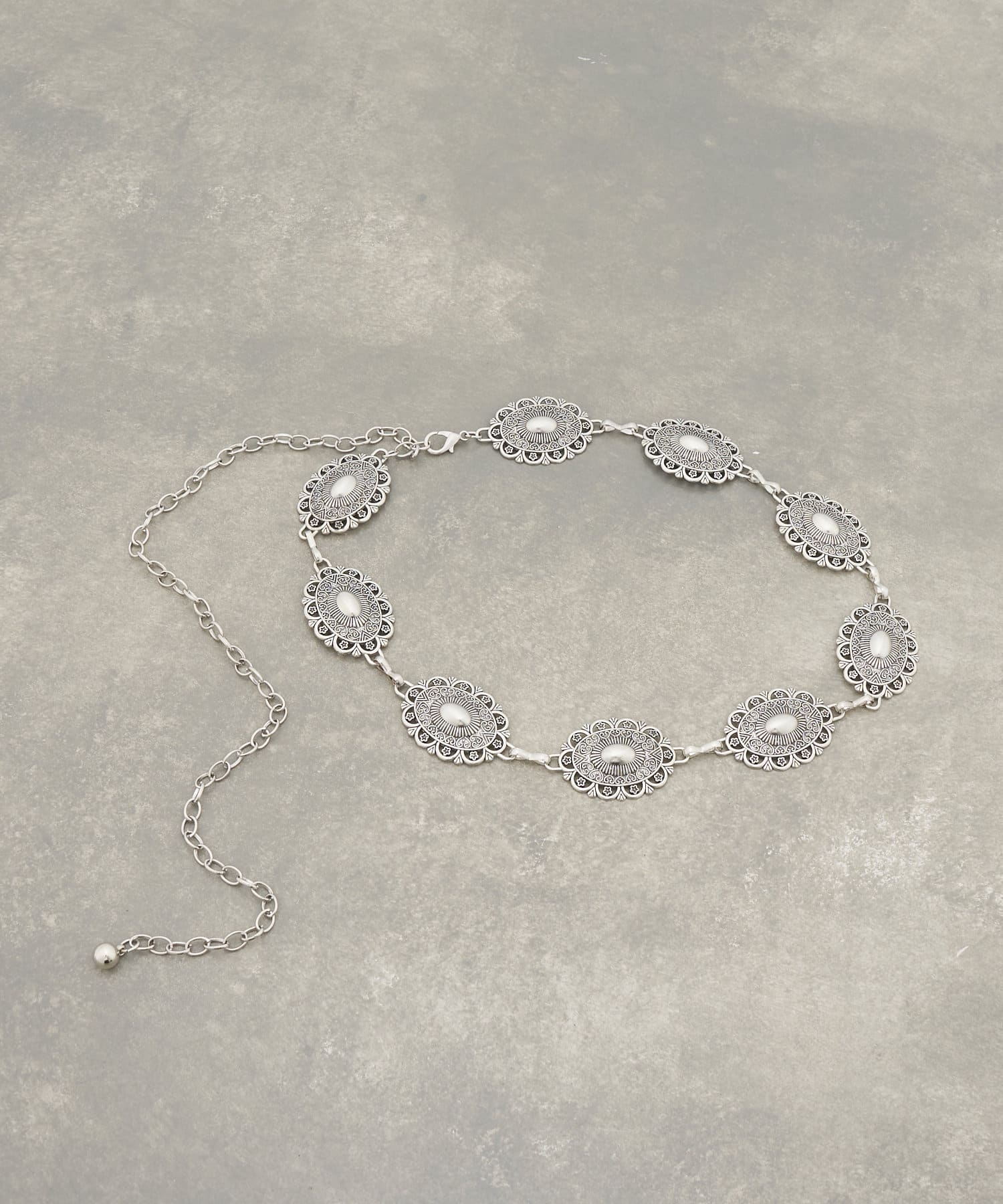 今っぽさを引き寄せる、コンチョモチーフのチェーンベルト。