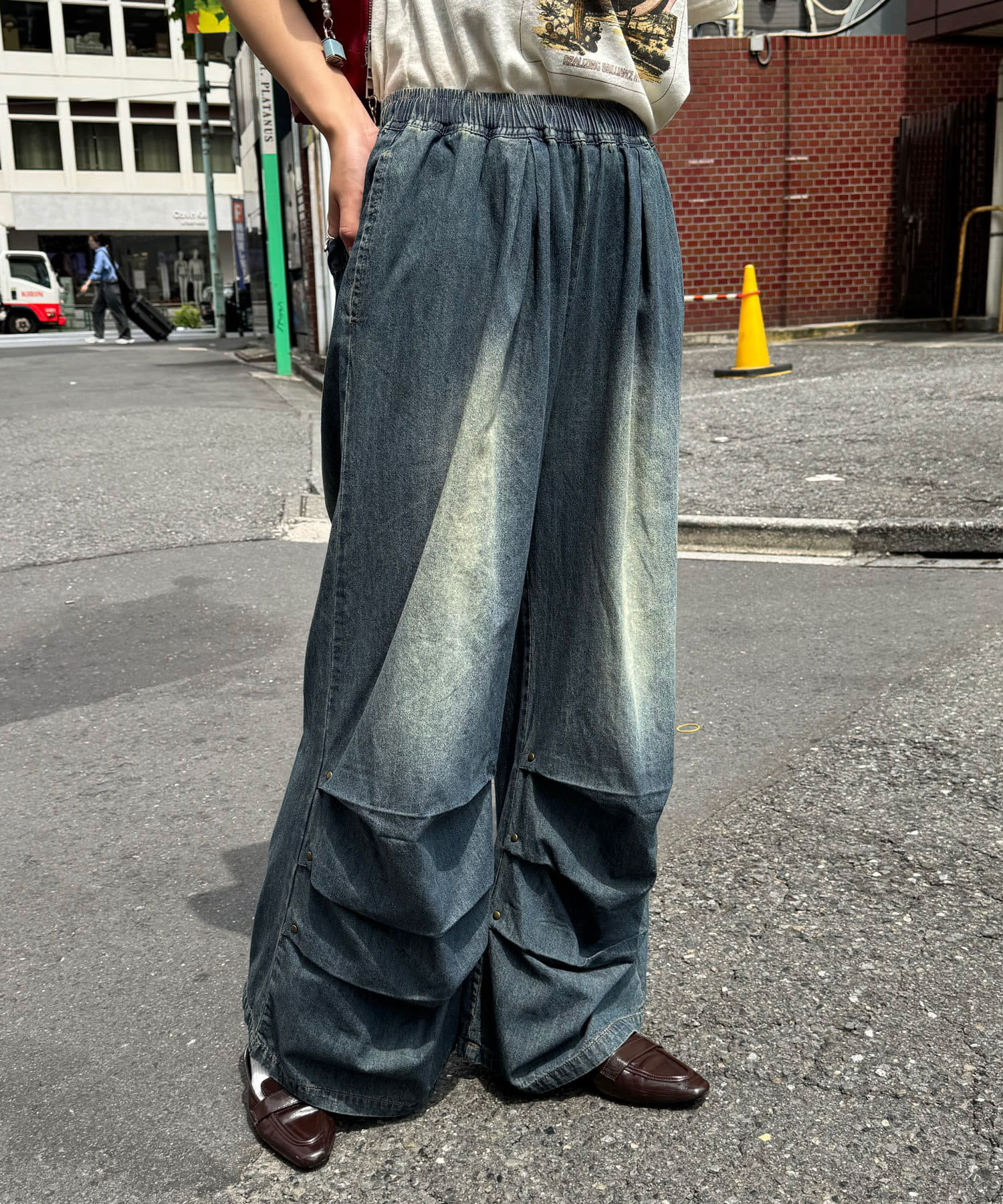 タックデザインに、小さなスタッズを添えたトレンドデニムパンツ。