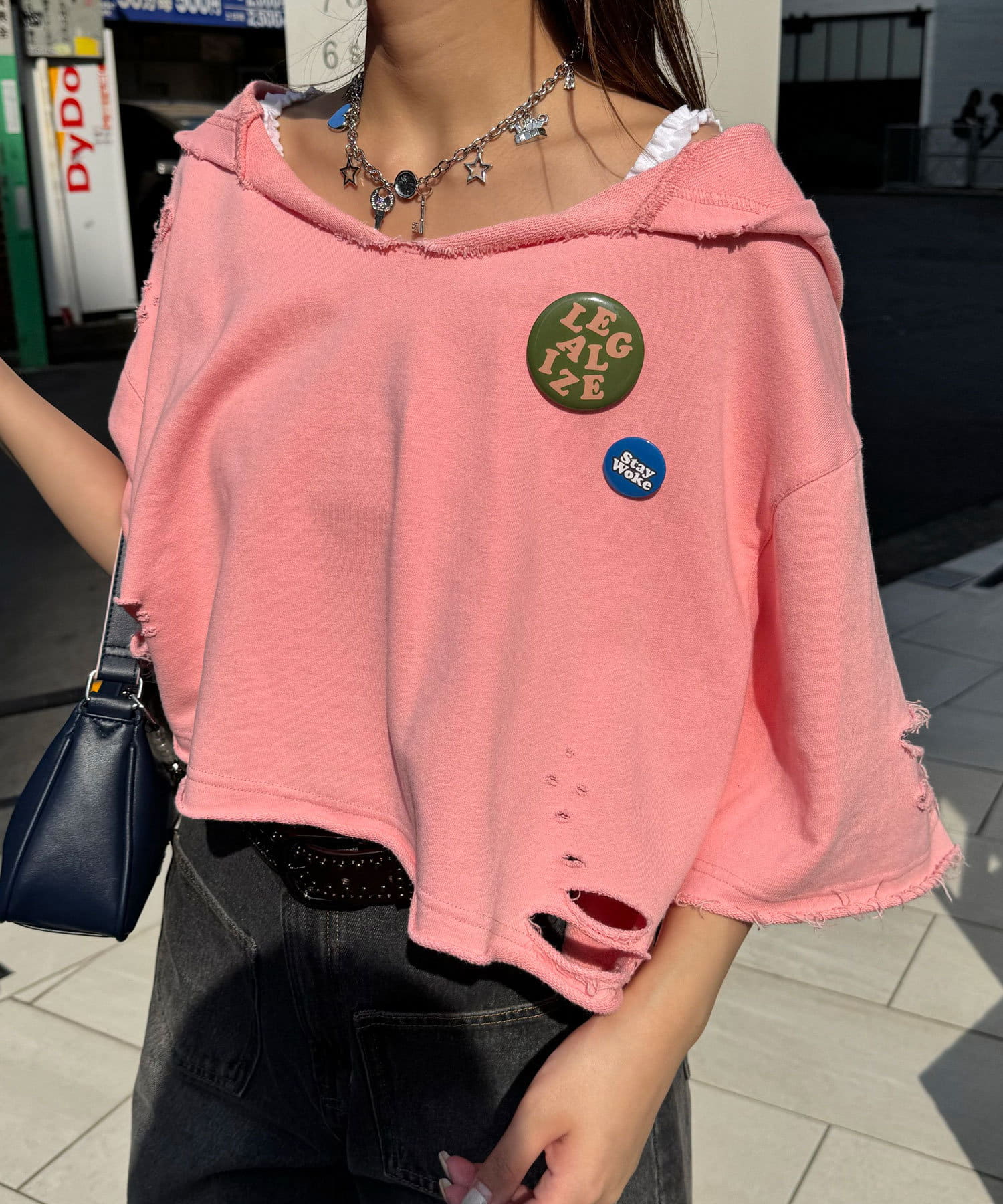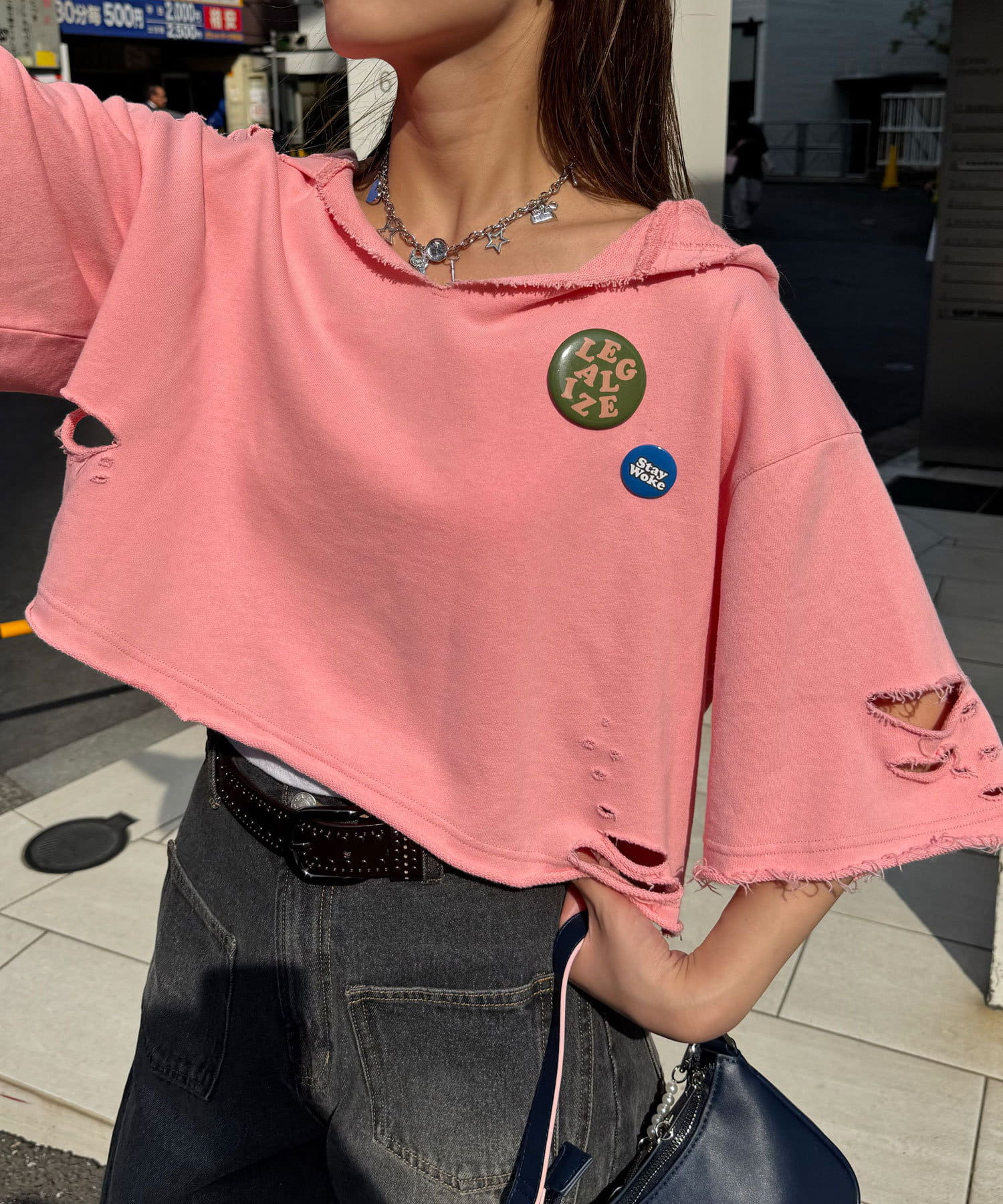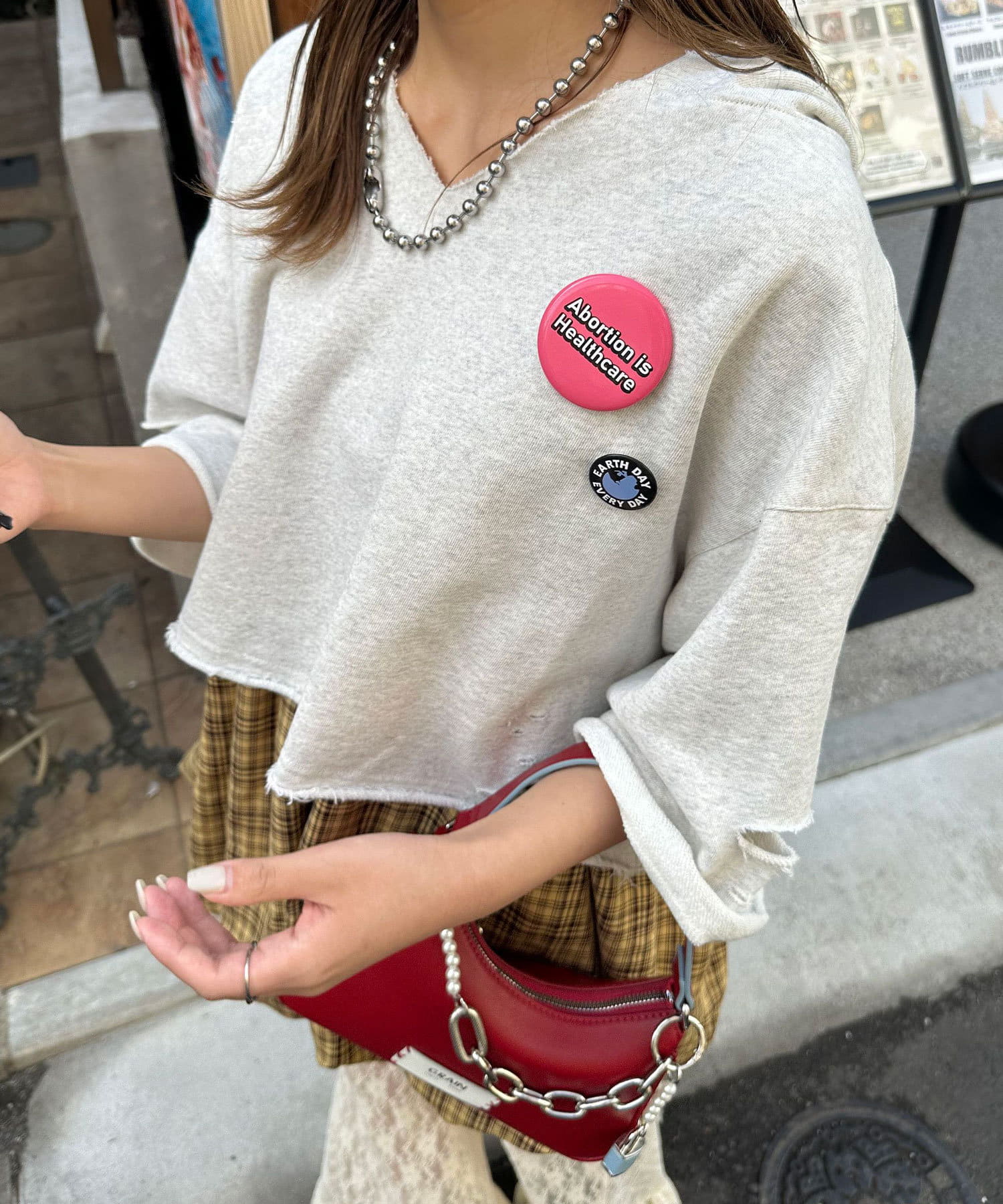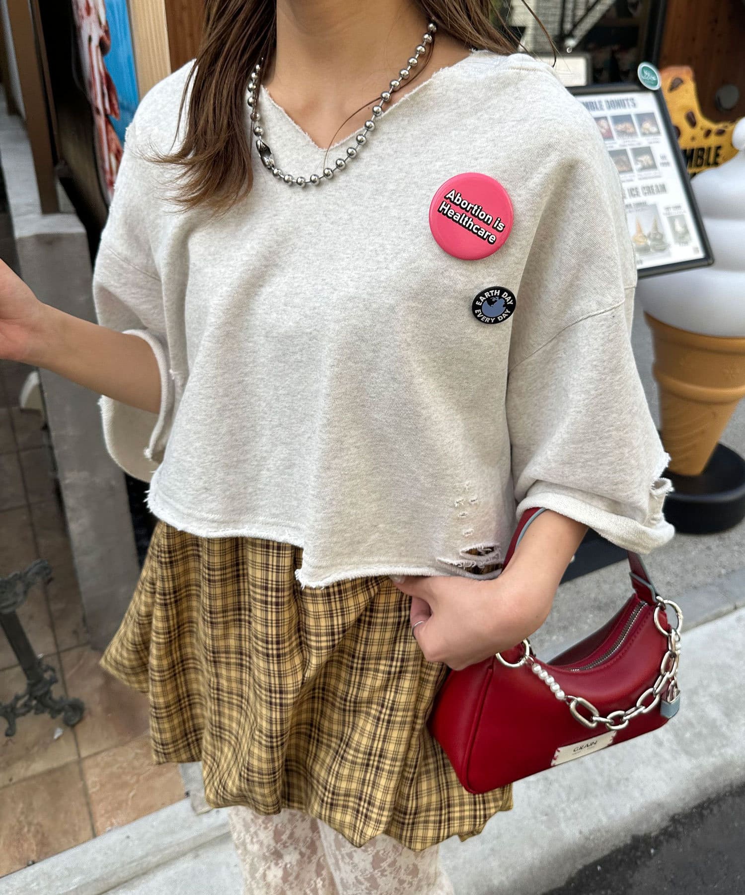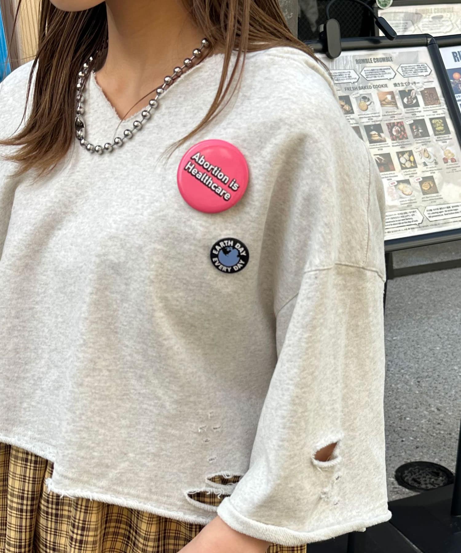ラフなのにおしゃれ見えする絶妙なダメージ加工と、セットの缶バッジでスタイリングに差がつく一枚です。