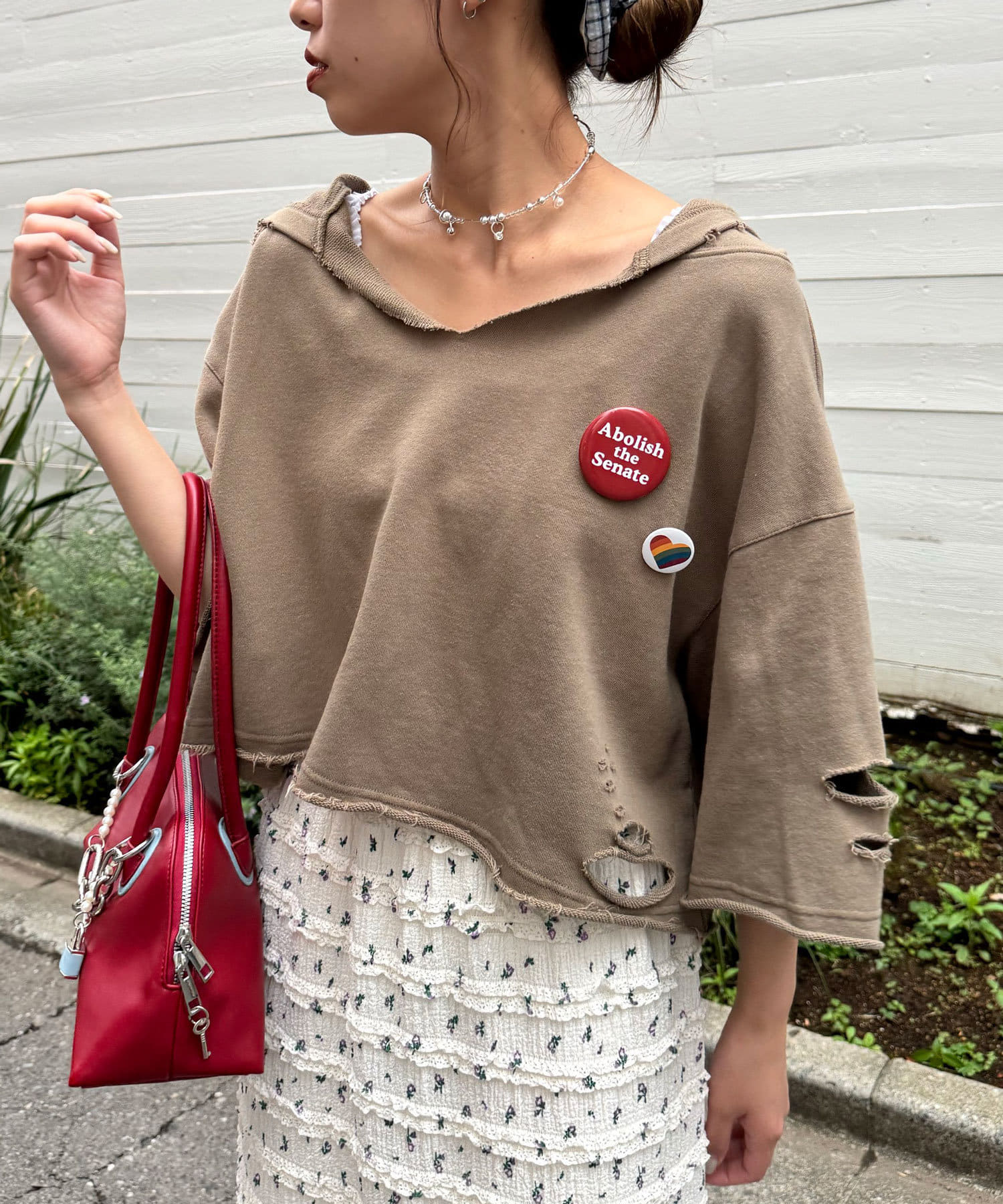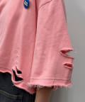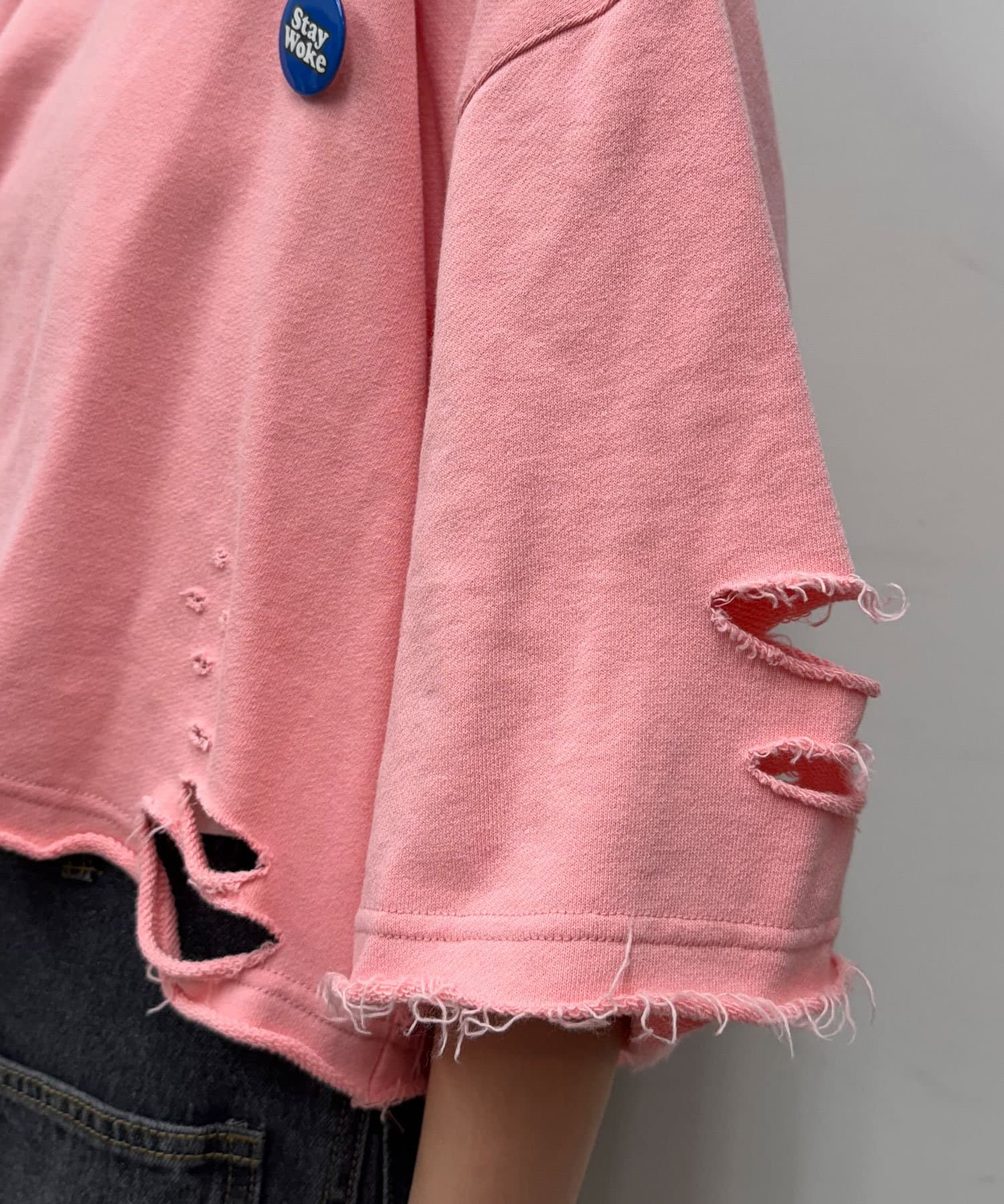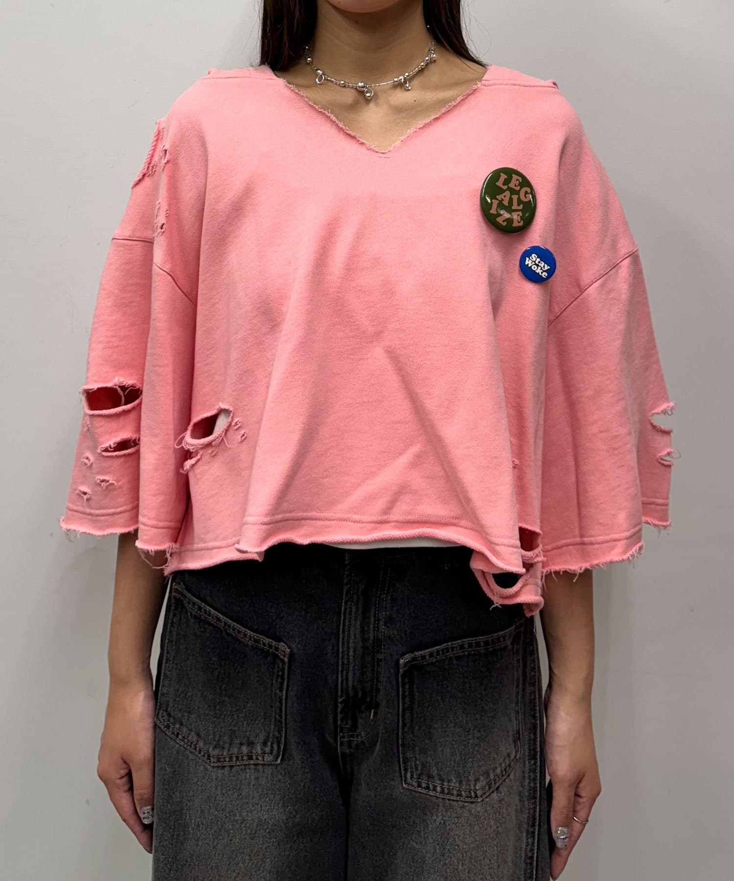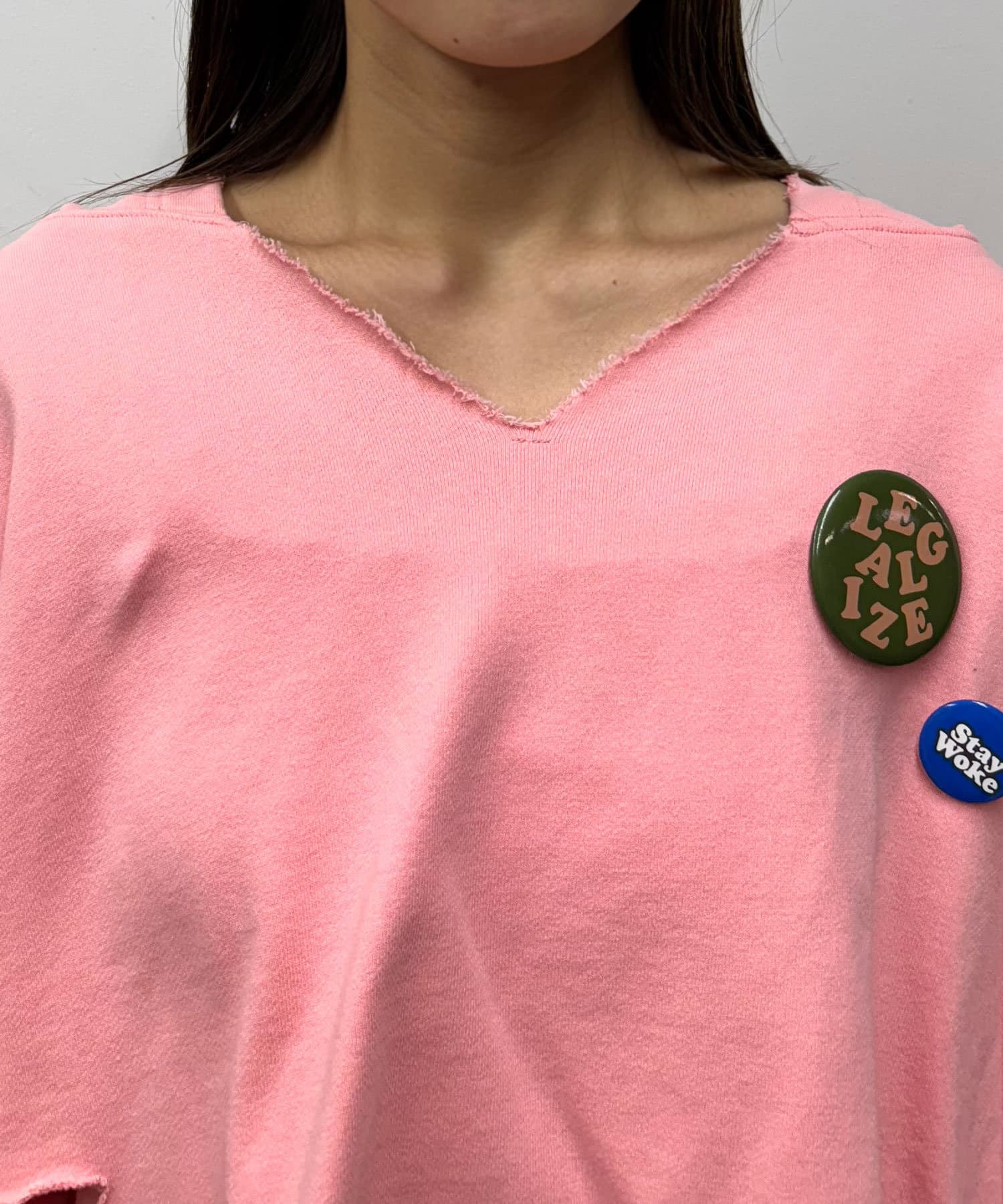 ラフなのにおしゃれ見えする絶妙なダメージ加工と、セットの缶バッジでスタイリングに差がつく一枚です。