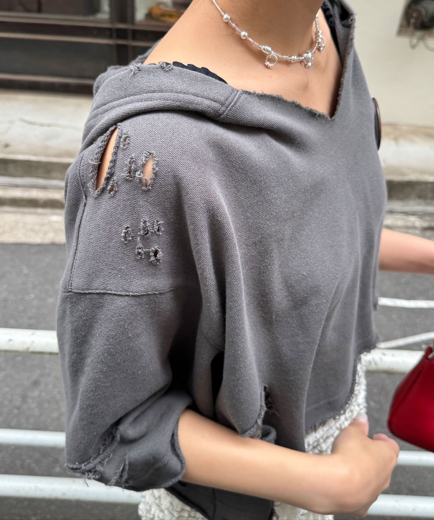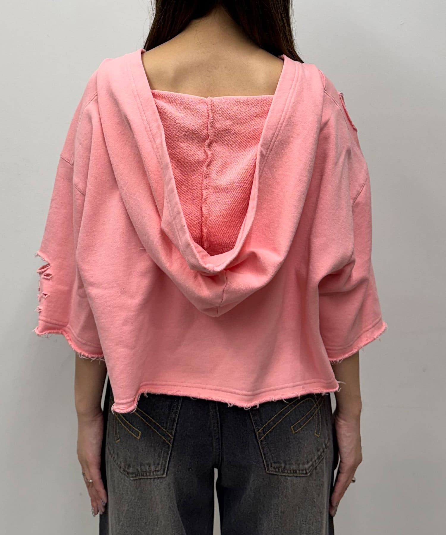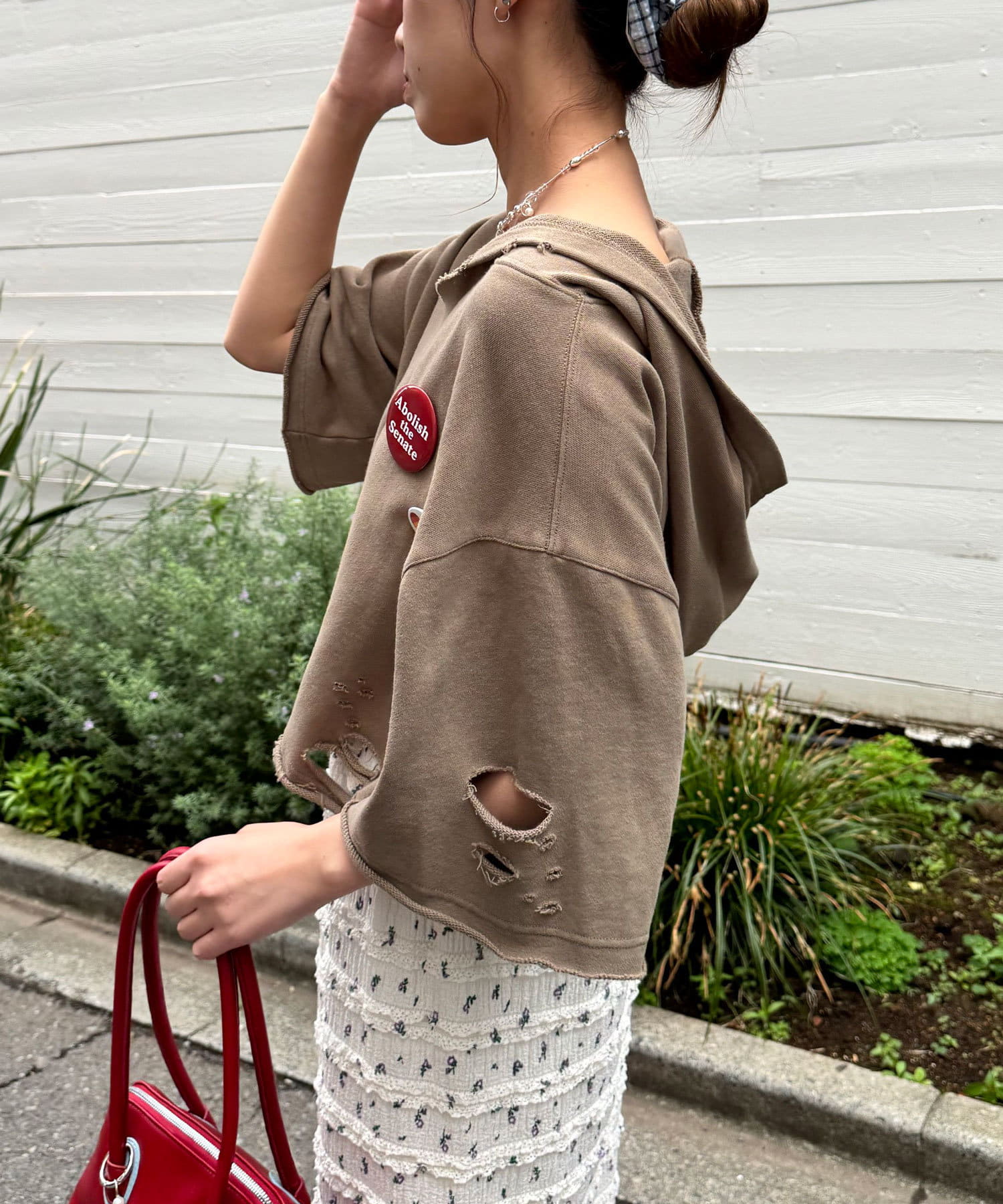 軽やかな裏毛素材で、夏でも快適に着られるダメージスウェットフーディー。