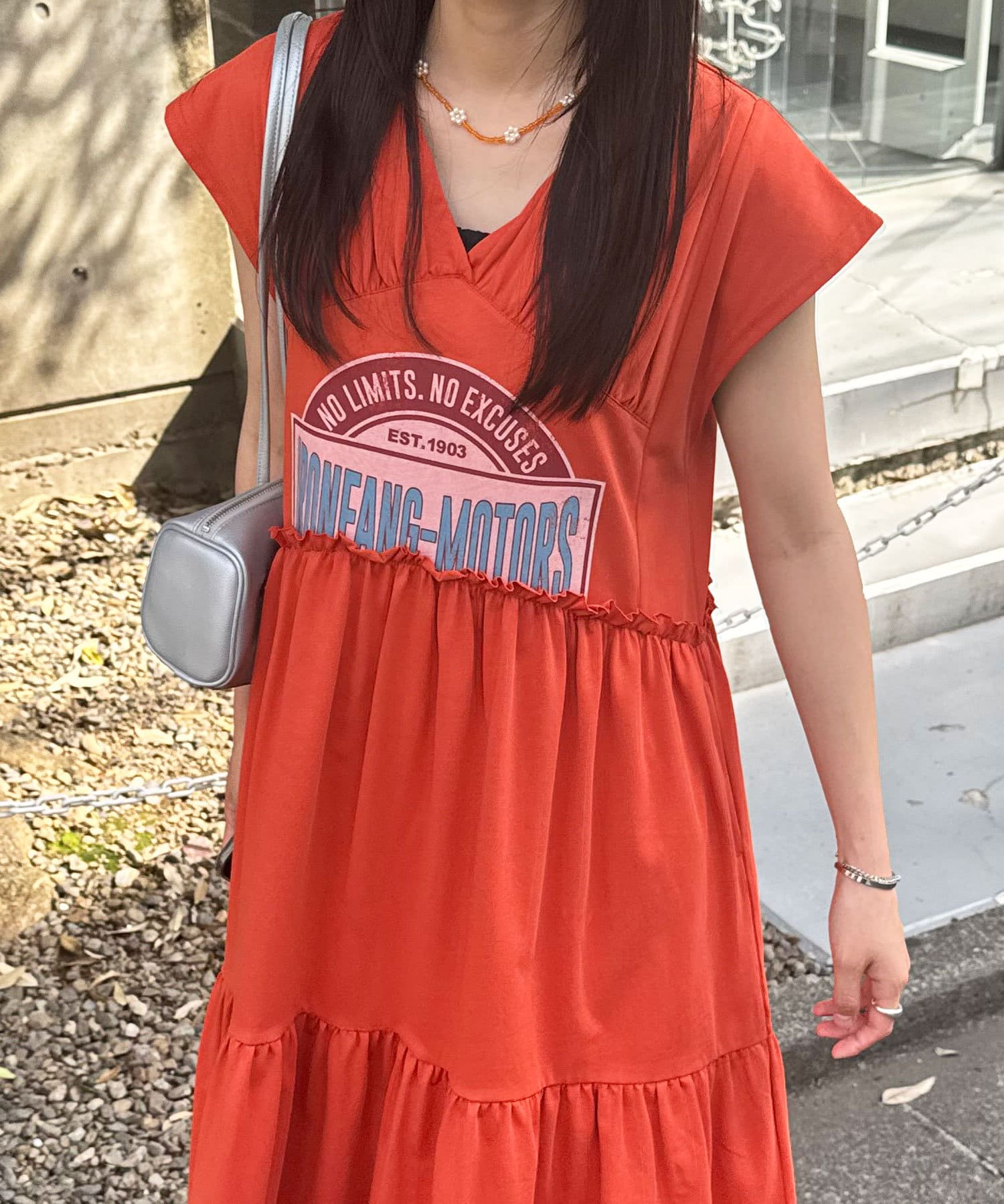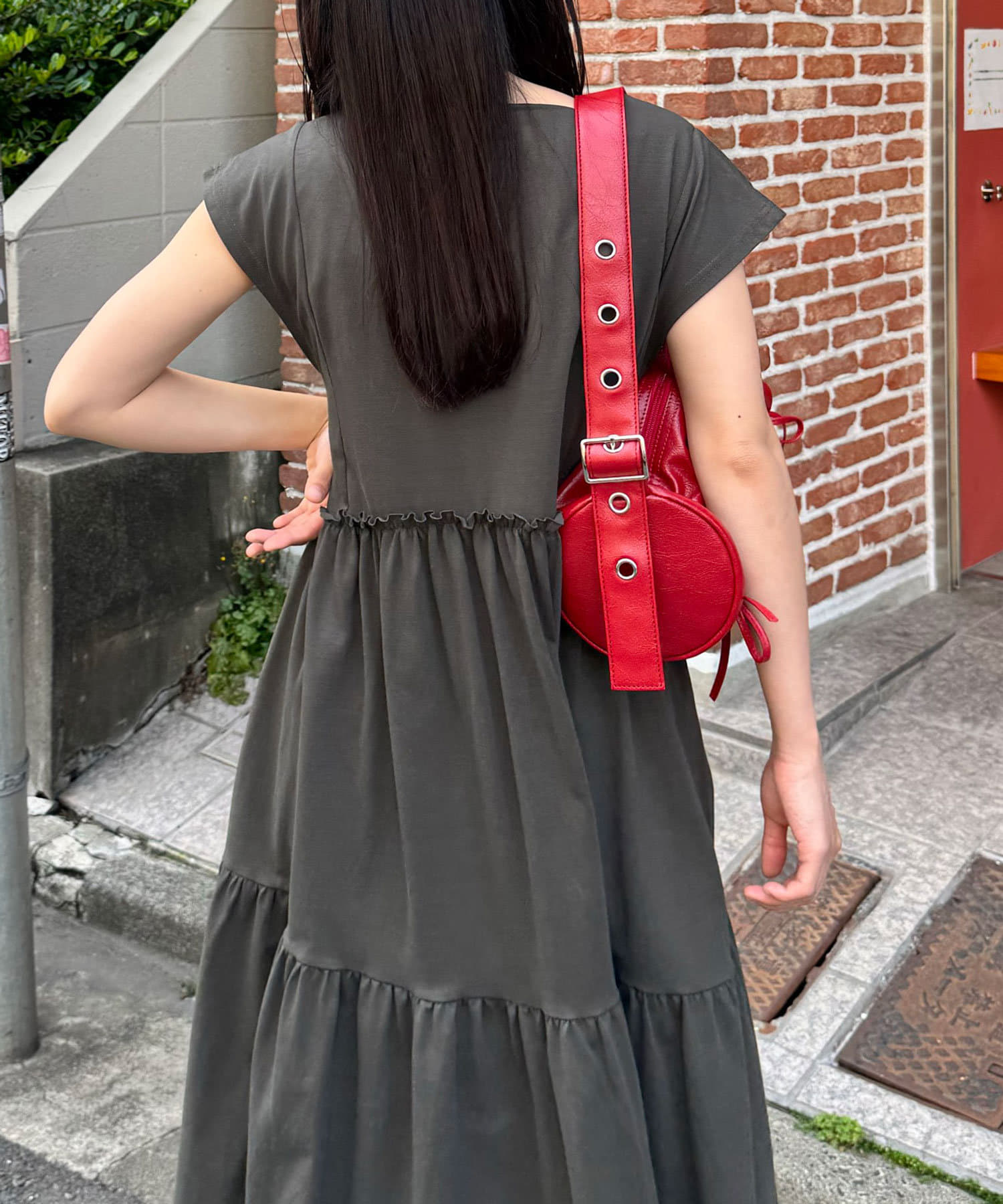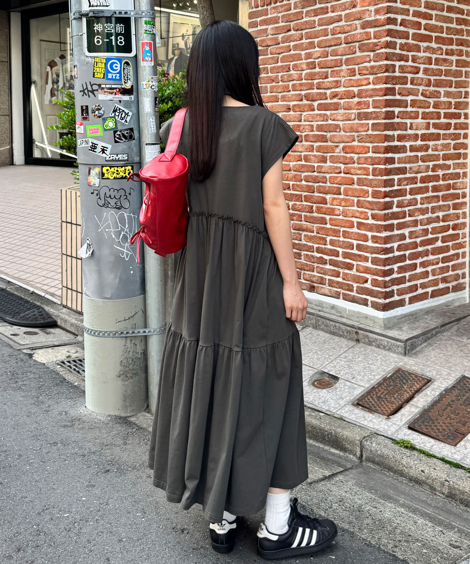 Vネック×高めのギャザー切り替えで、スタイルアップもばっちり。