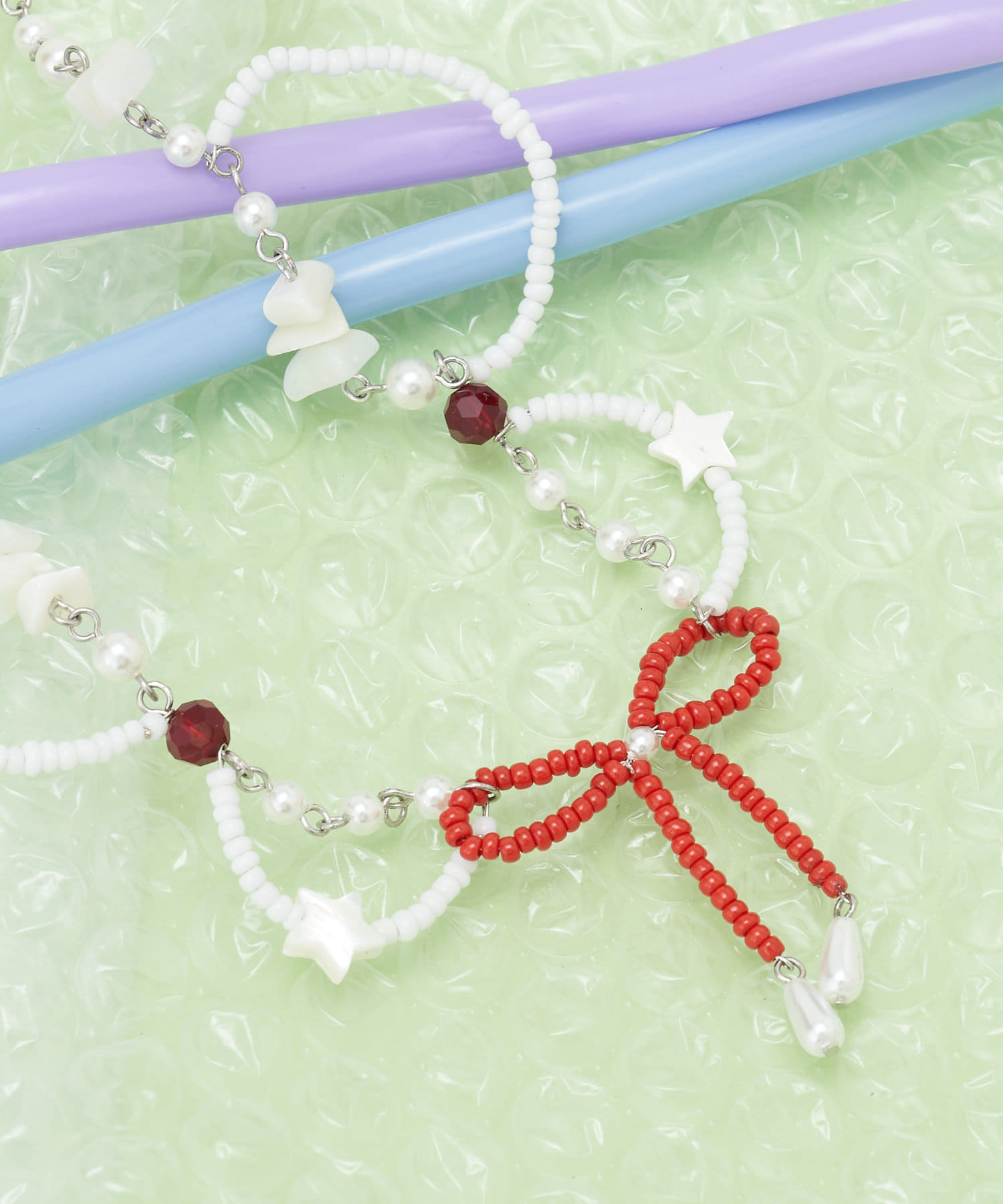 首元にときめきを添えるリボンビーズネックレス
