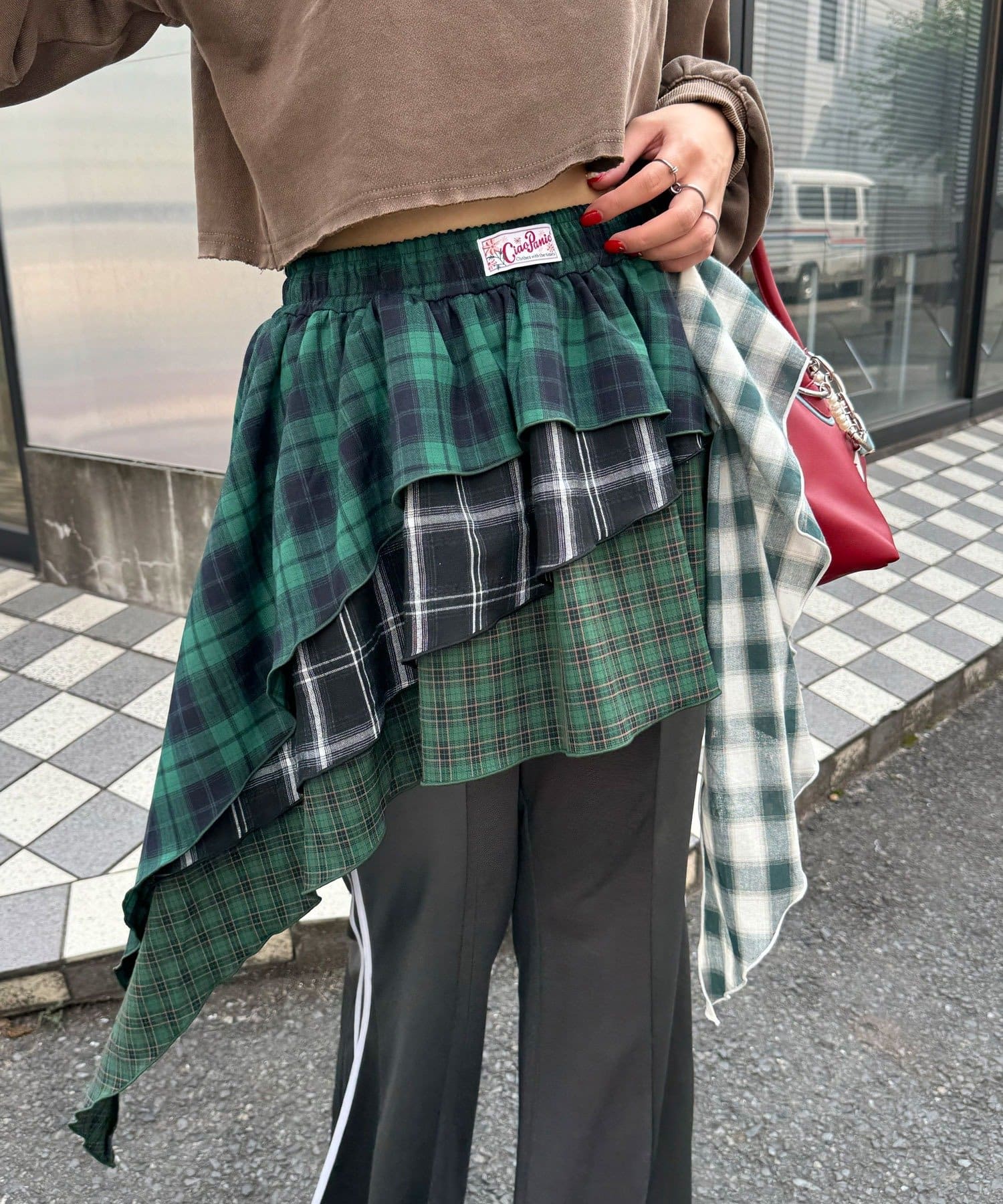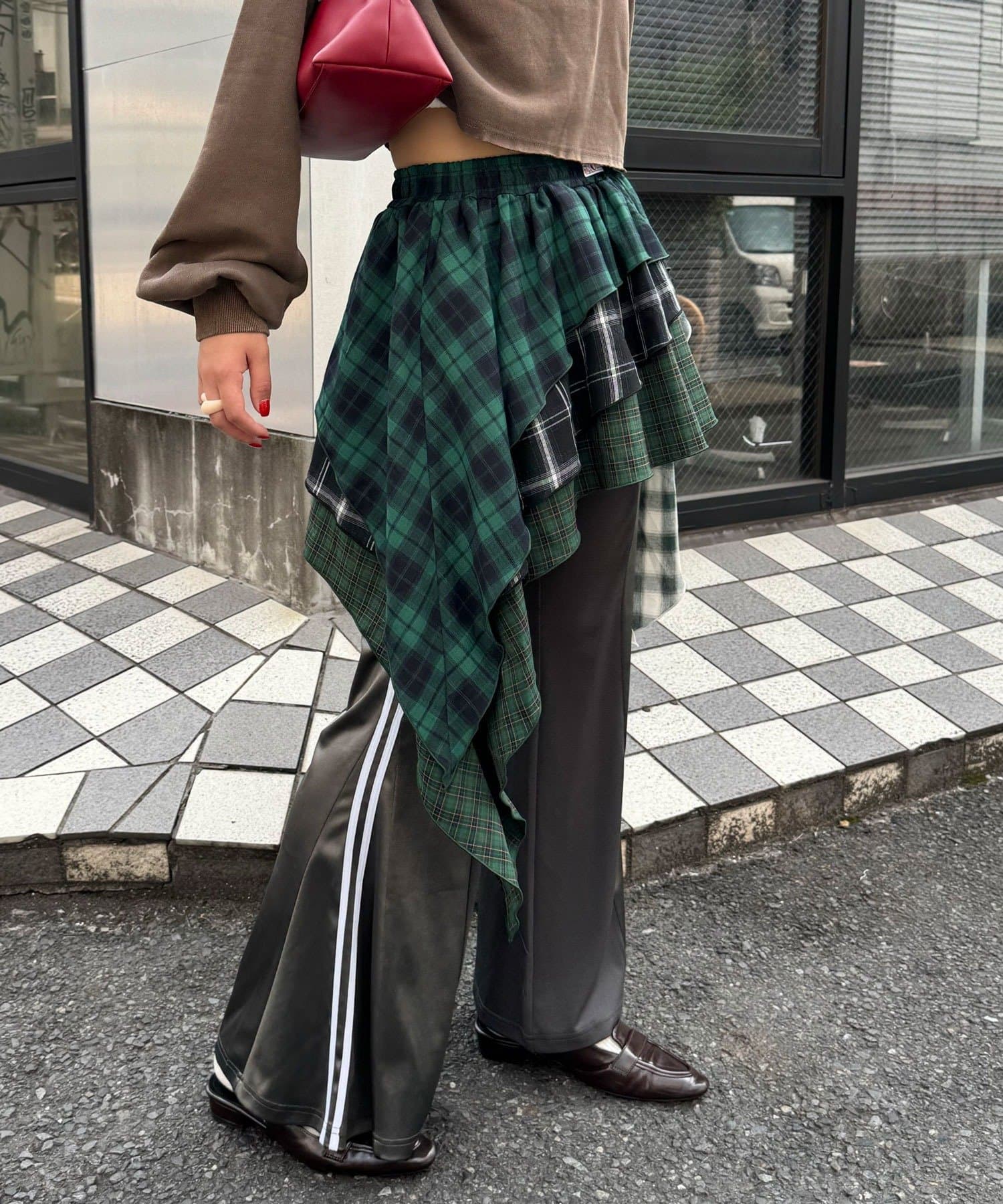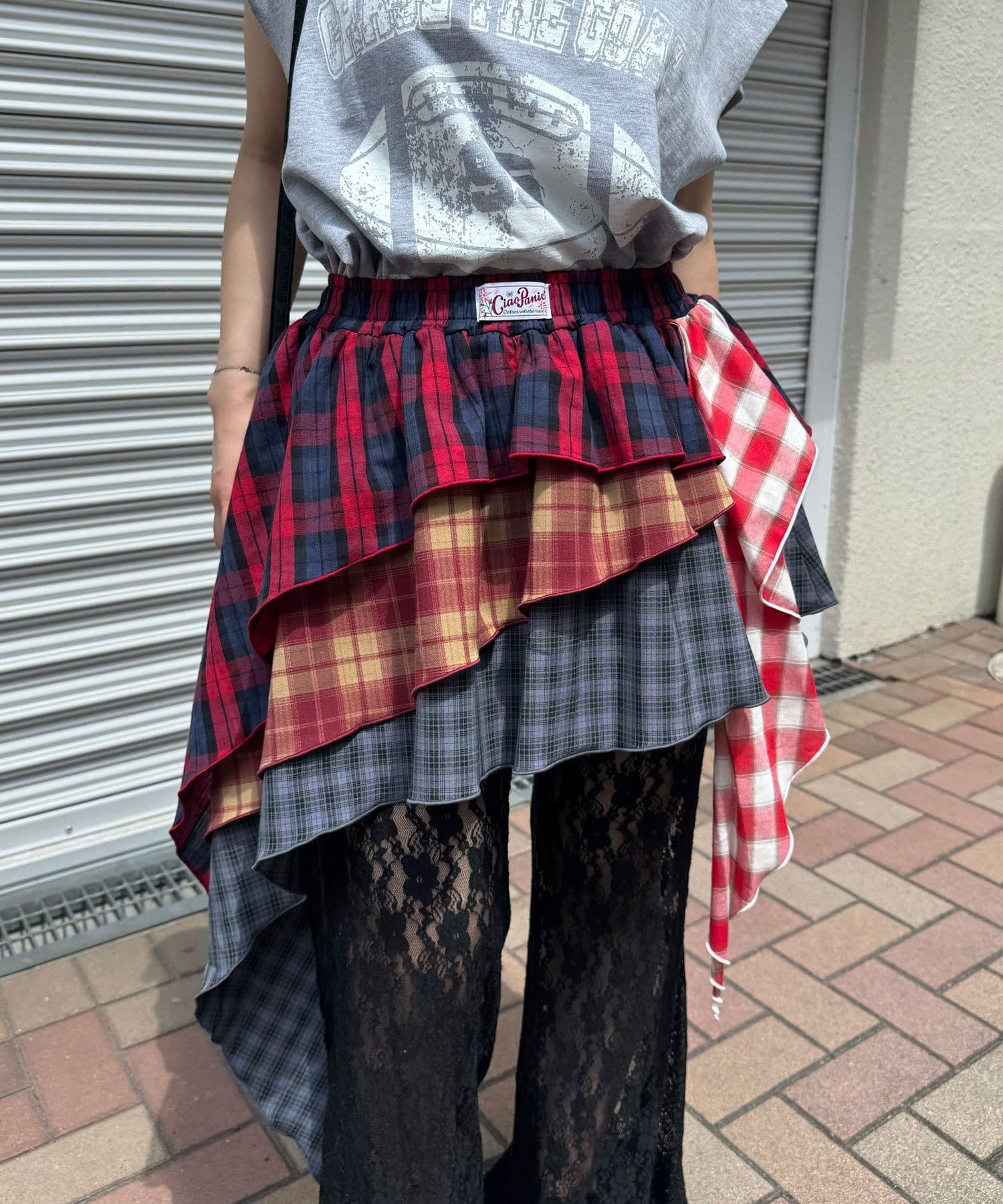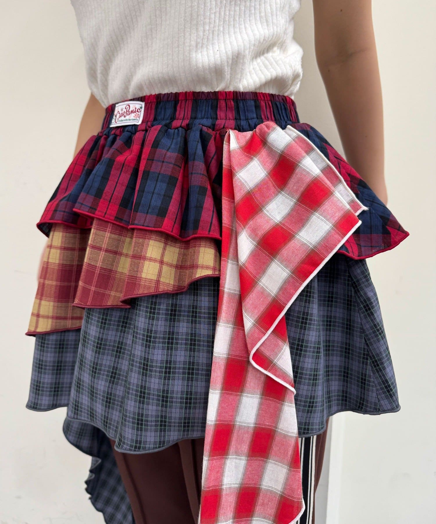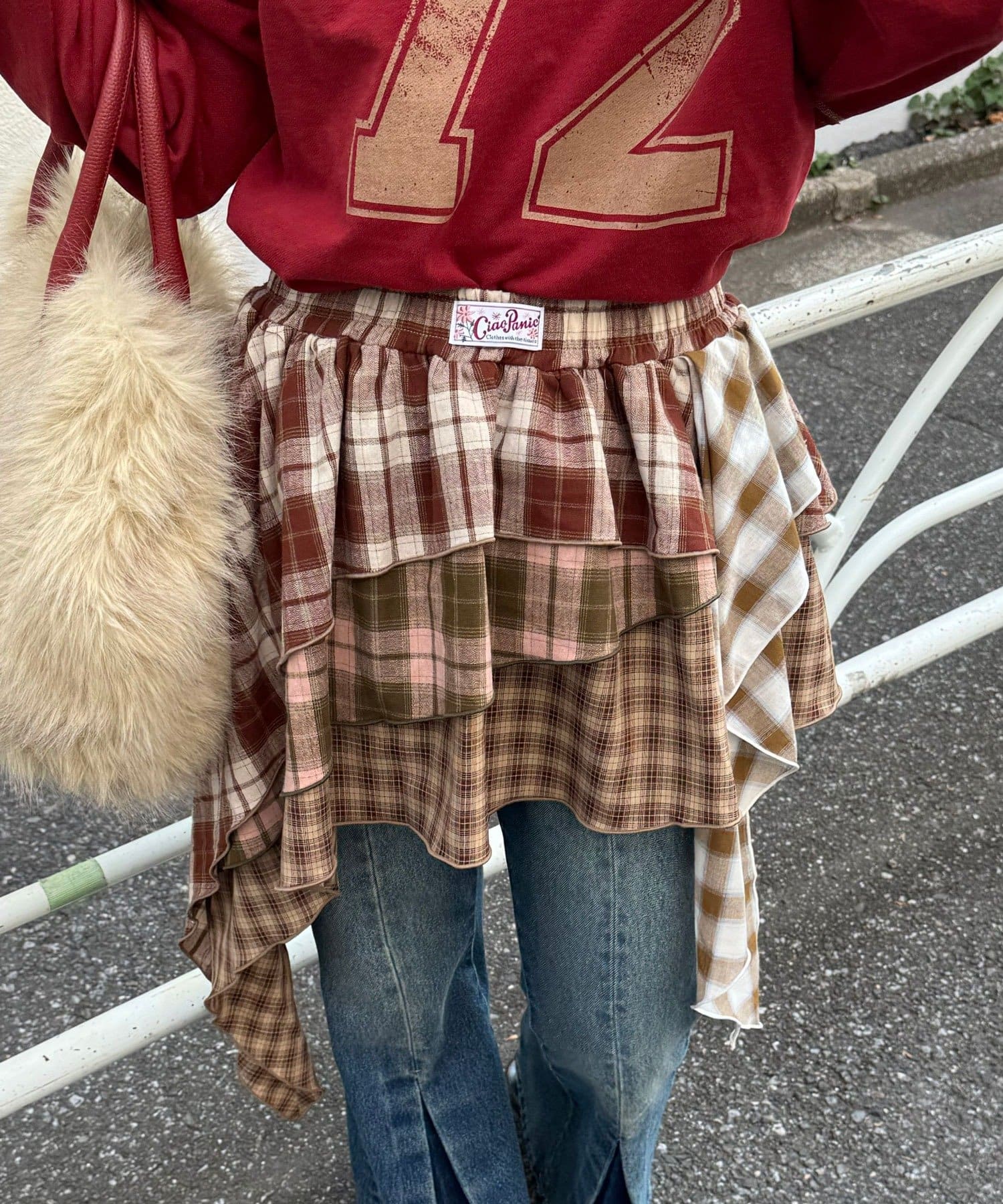 4種類のチェック柄を組み合わせた、視線を集めるティアードミニスカート。