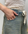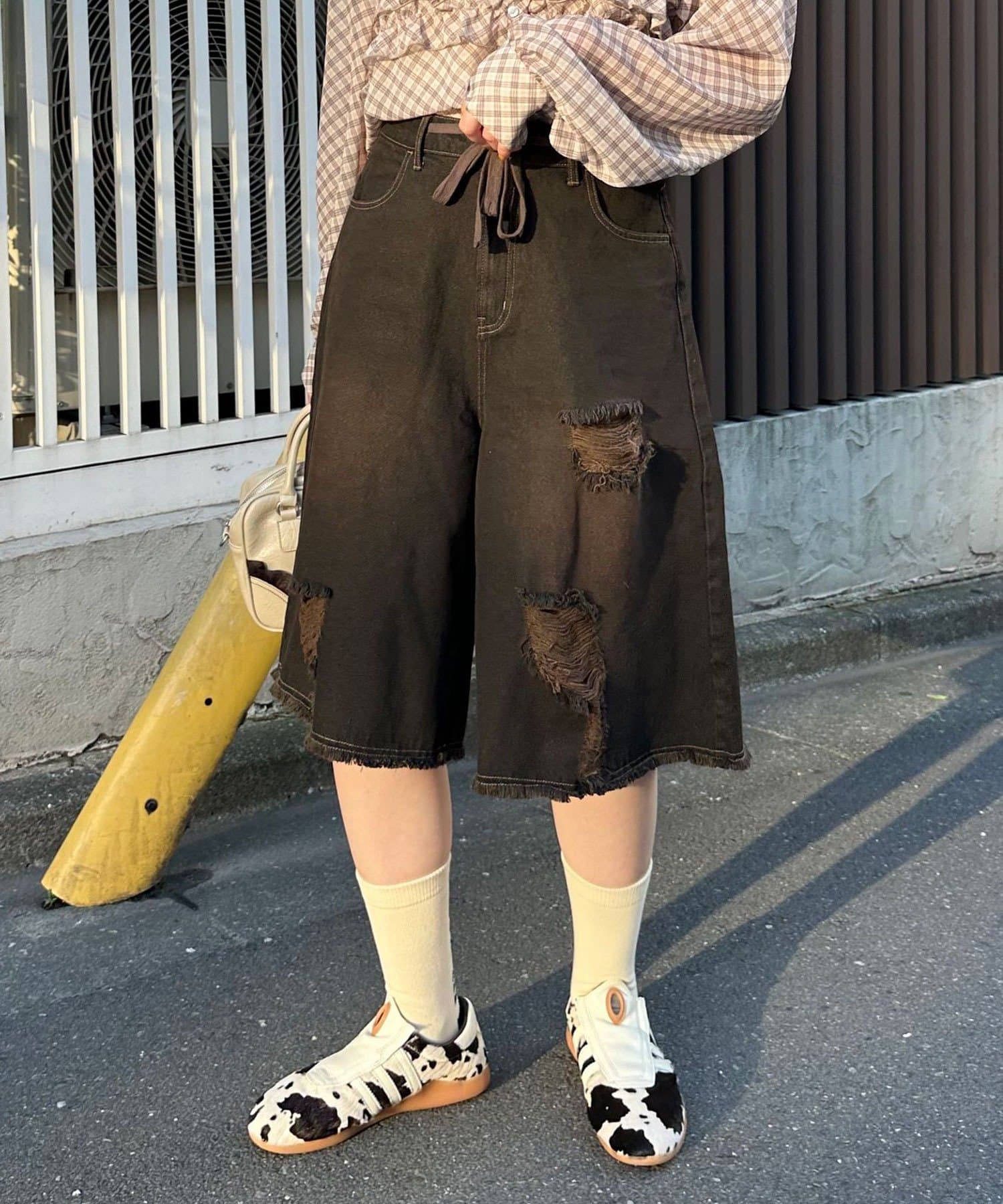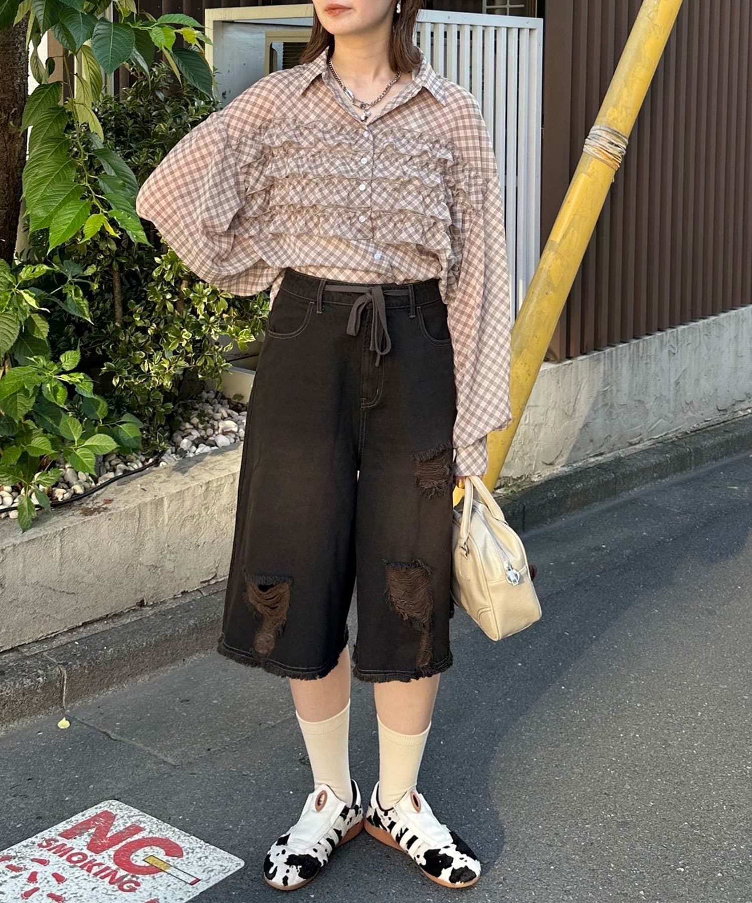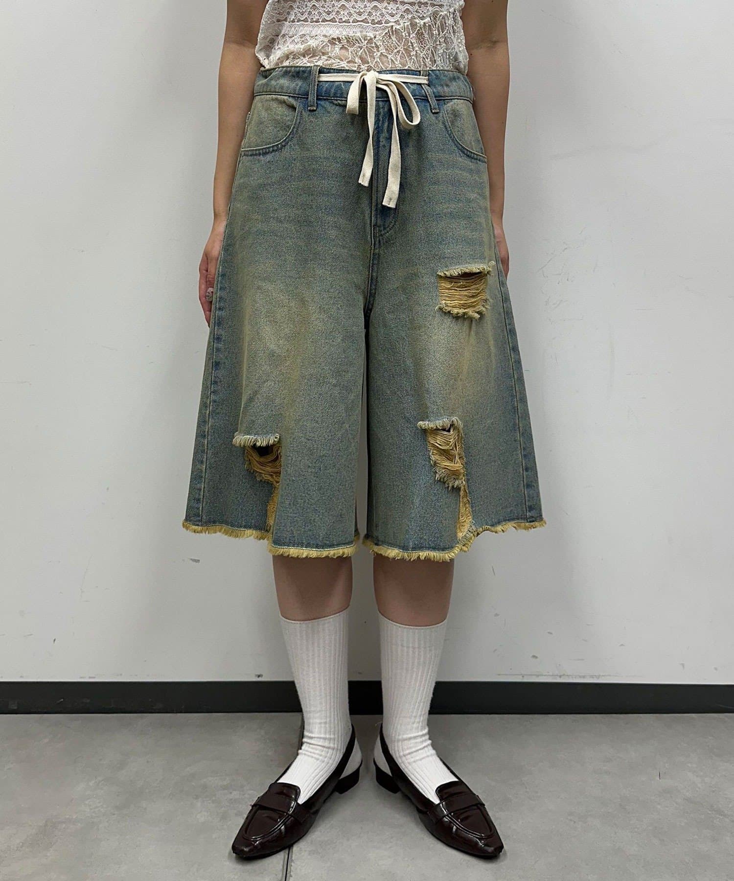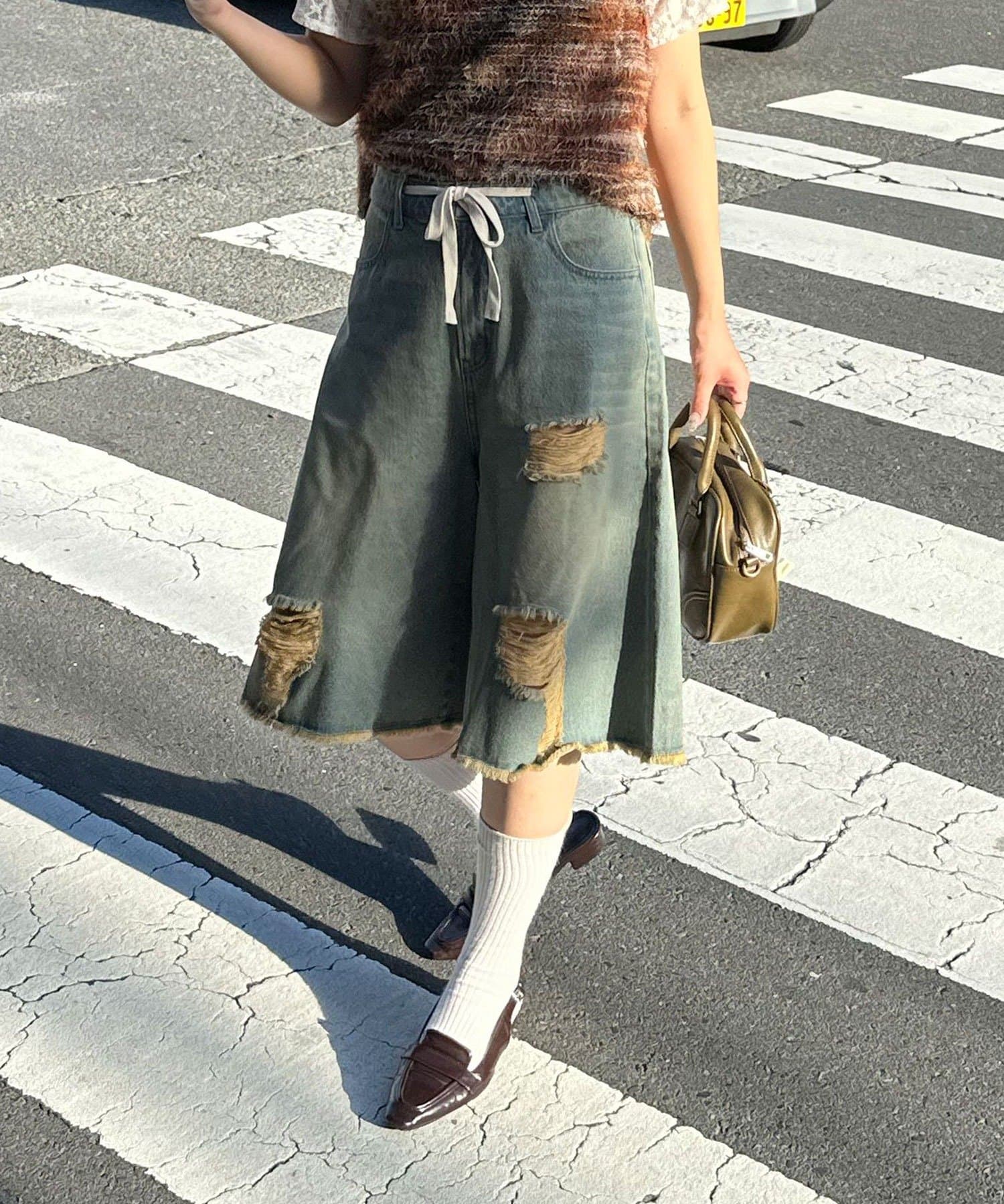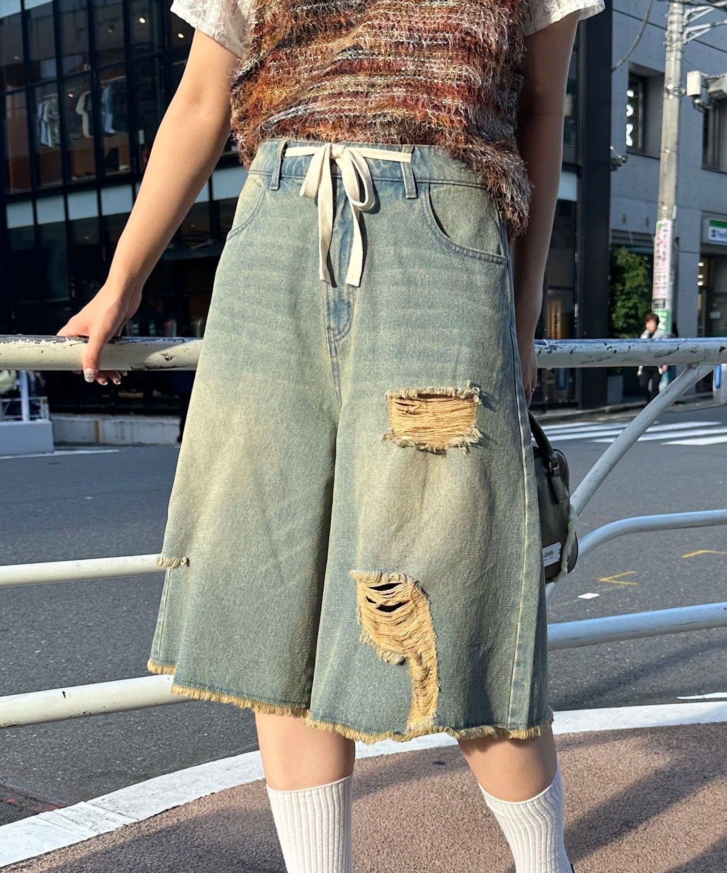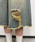 大胆なダメージとフリンジ加工で、1枚で主役になれる存在感たっぷりのデザイン。