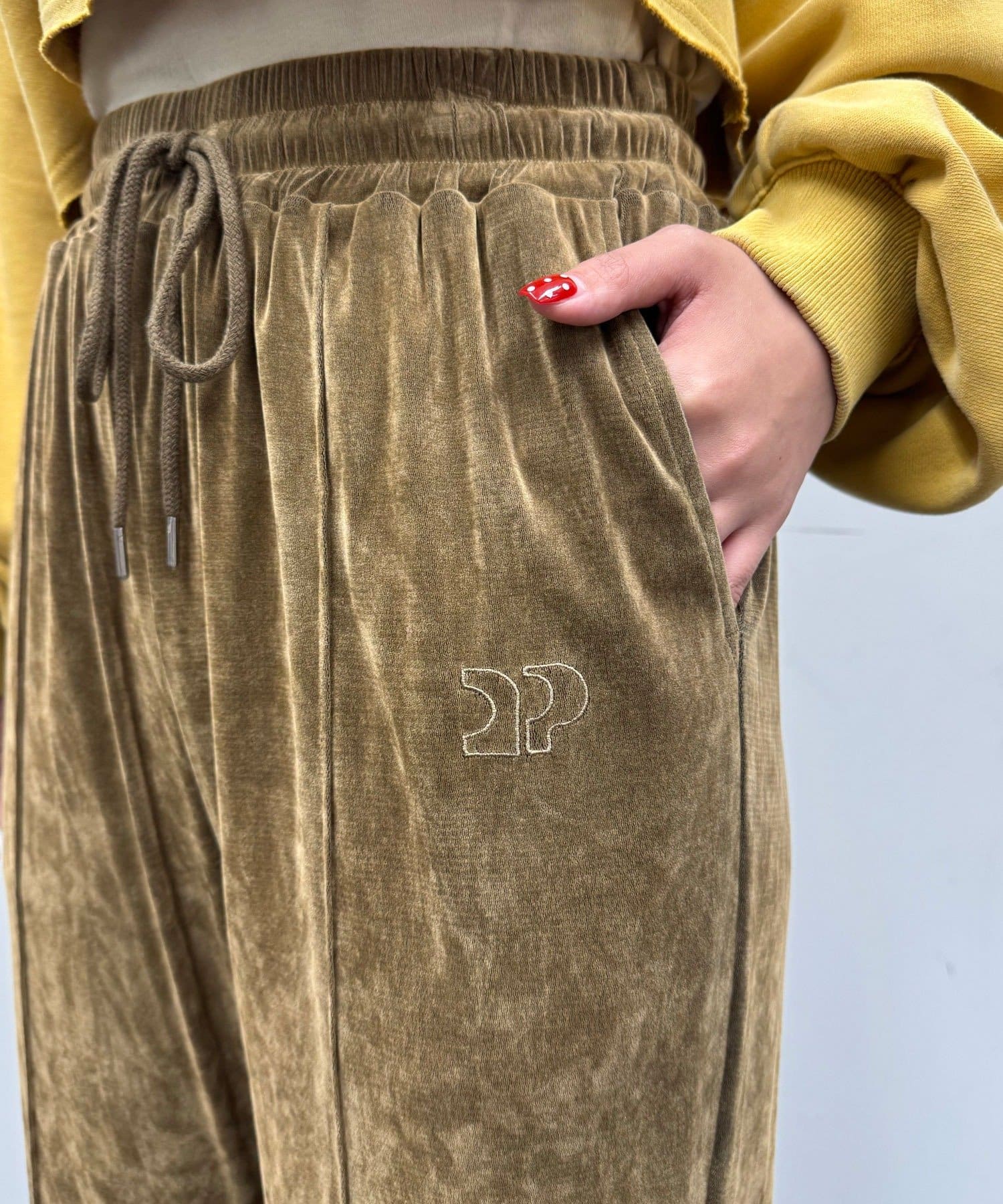 ウエストはゴム&紐で調整でき、ワンポイント刺繍がさりげないアクセントに。