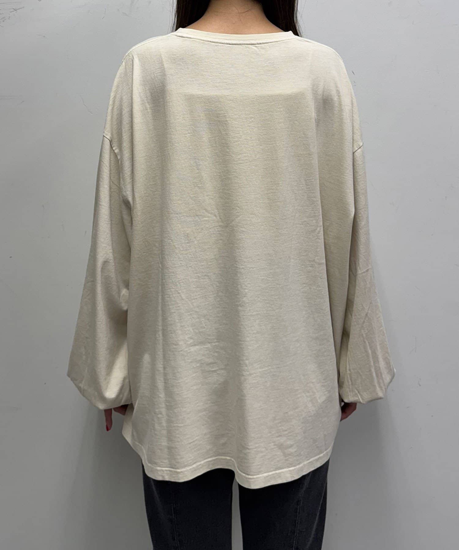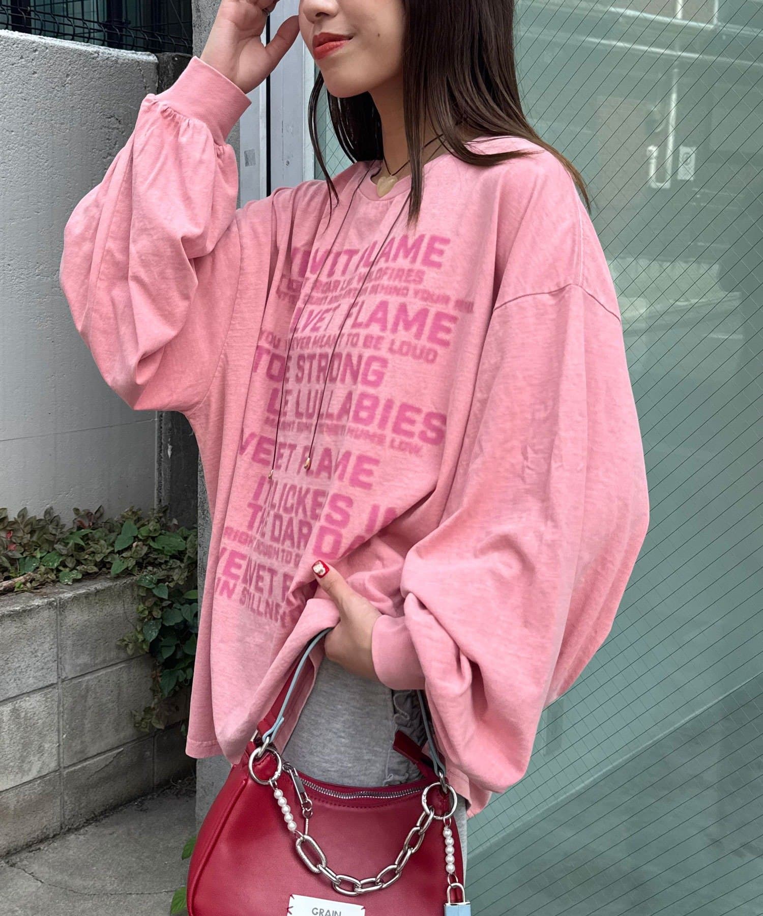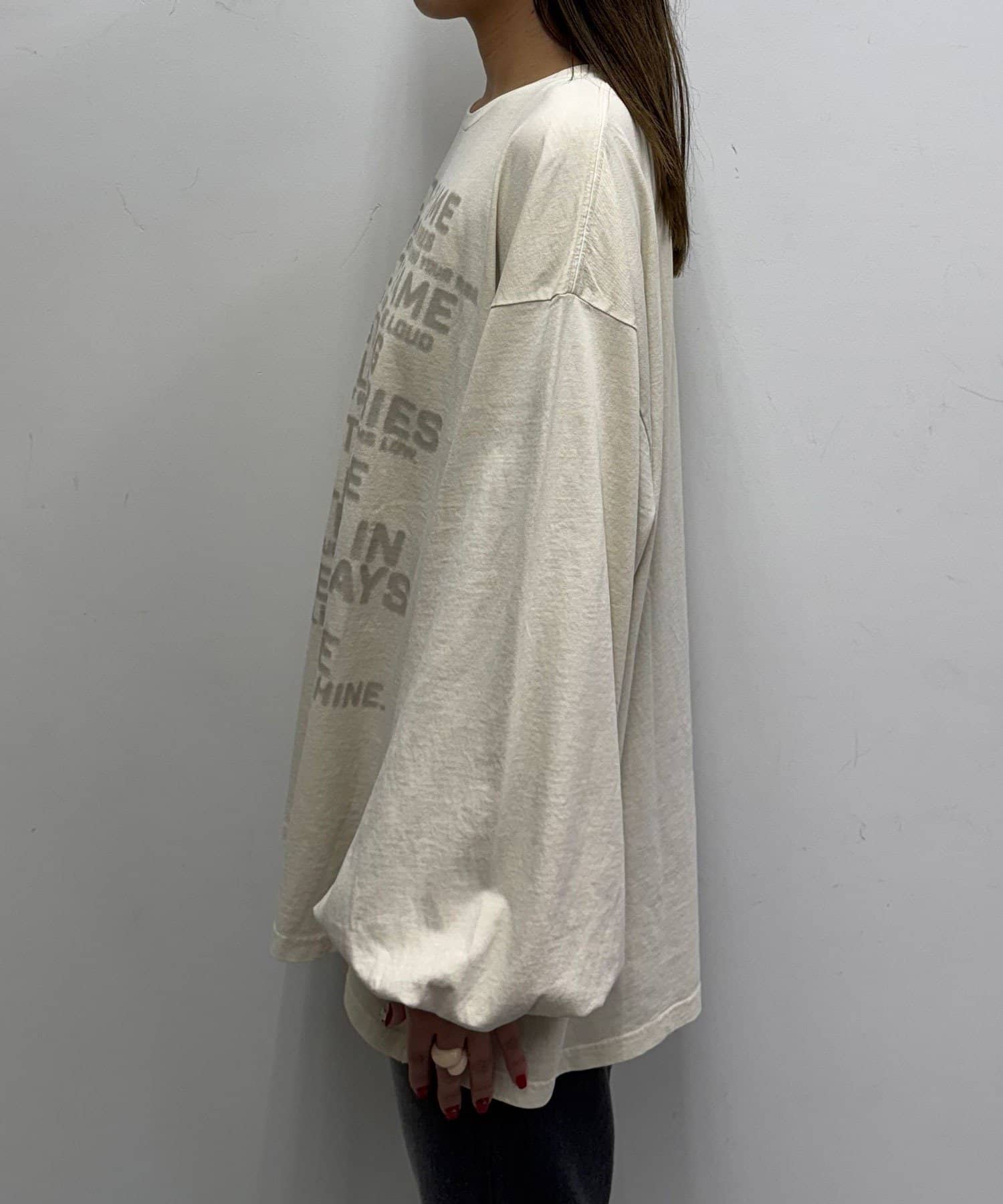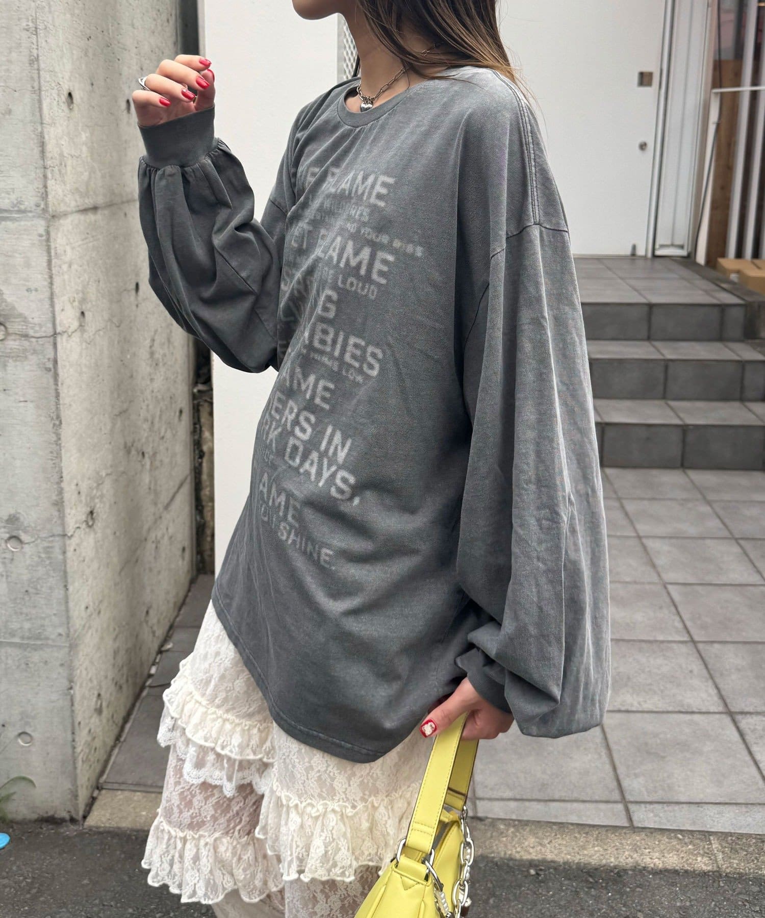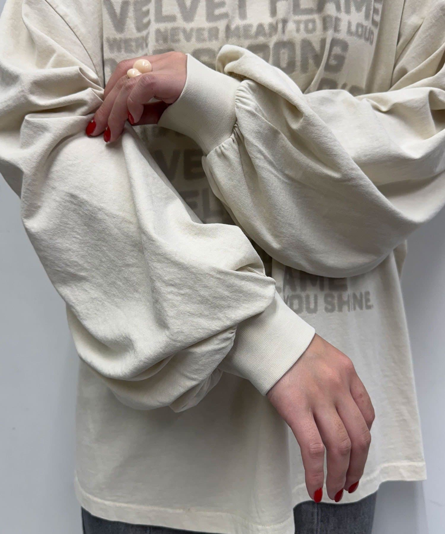 大胆なメッセージロゴとボリュームスリーブがアクセントになり、ゆるっと着るだけでサマになるデザインです。