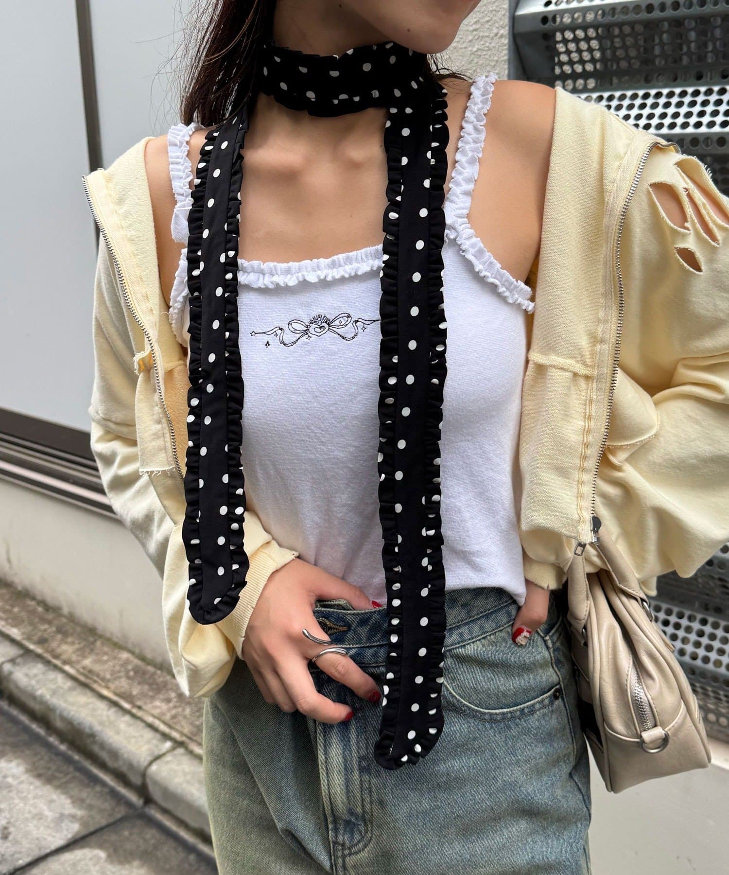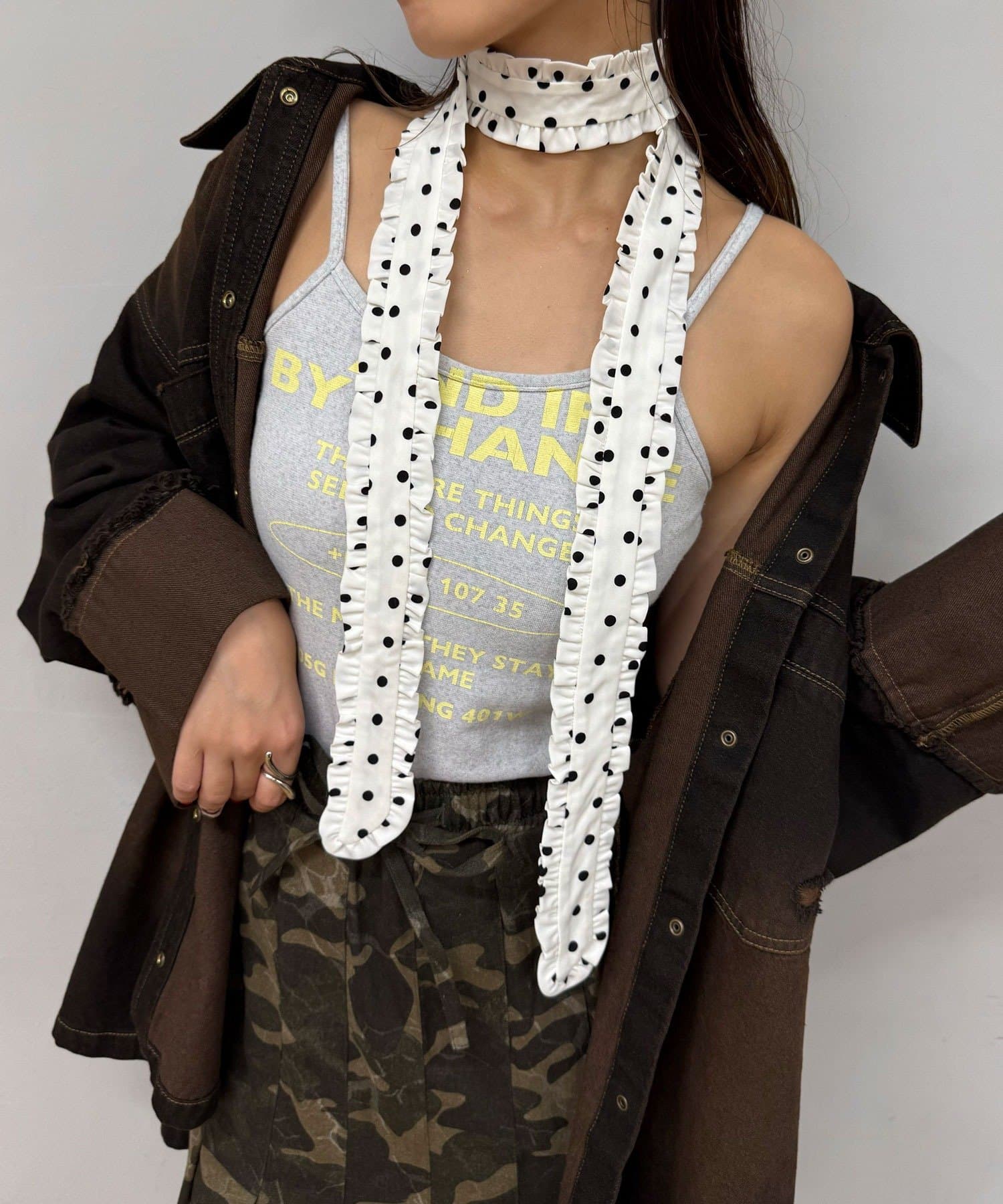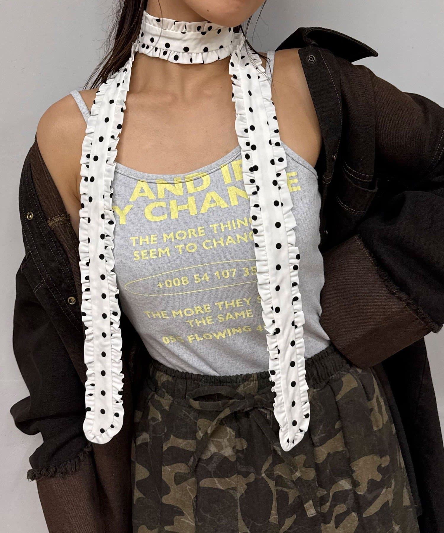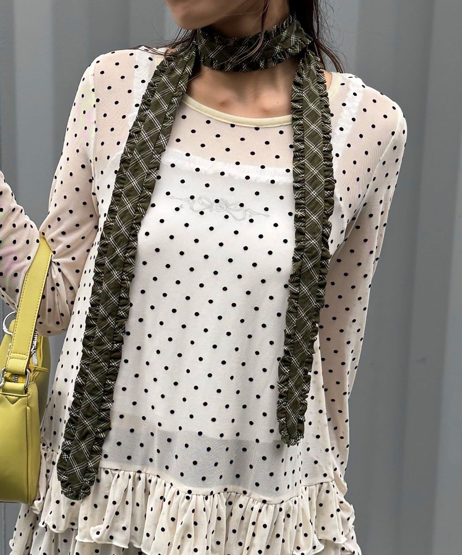 フリルネクタイは、ニットやカーディガンにチョーカー巻きで取り入れると◎