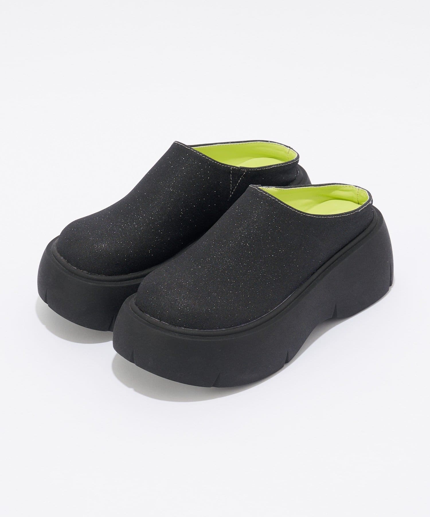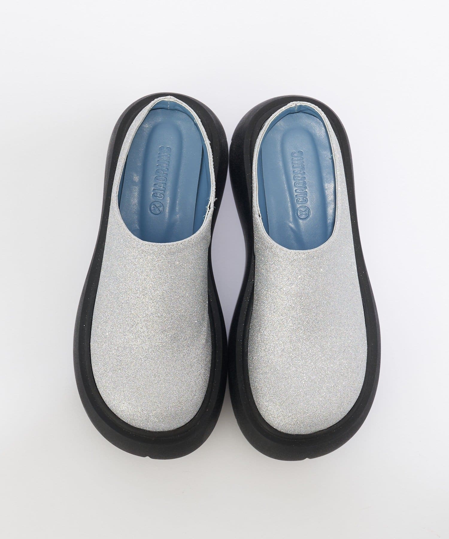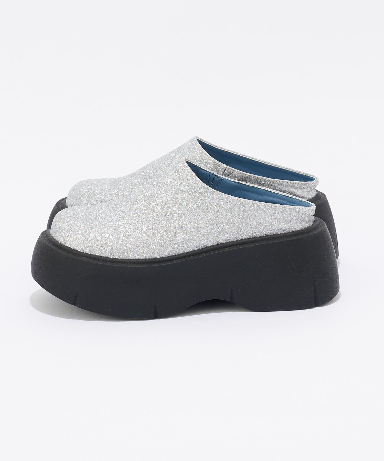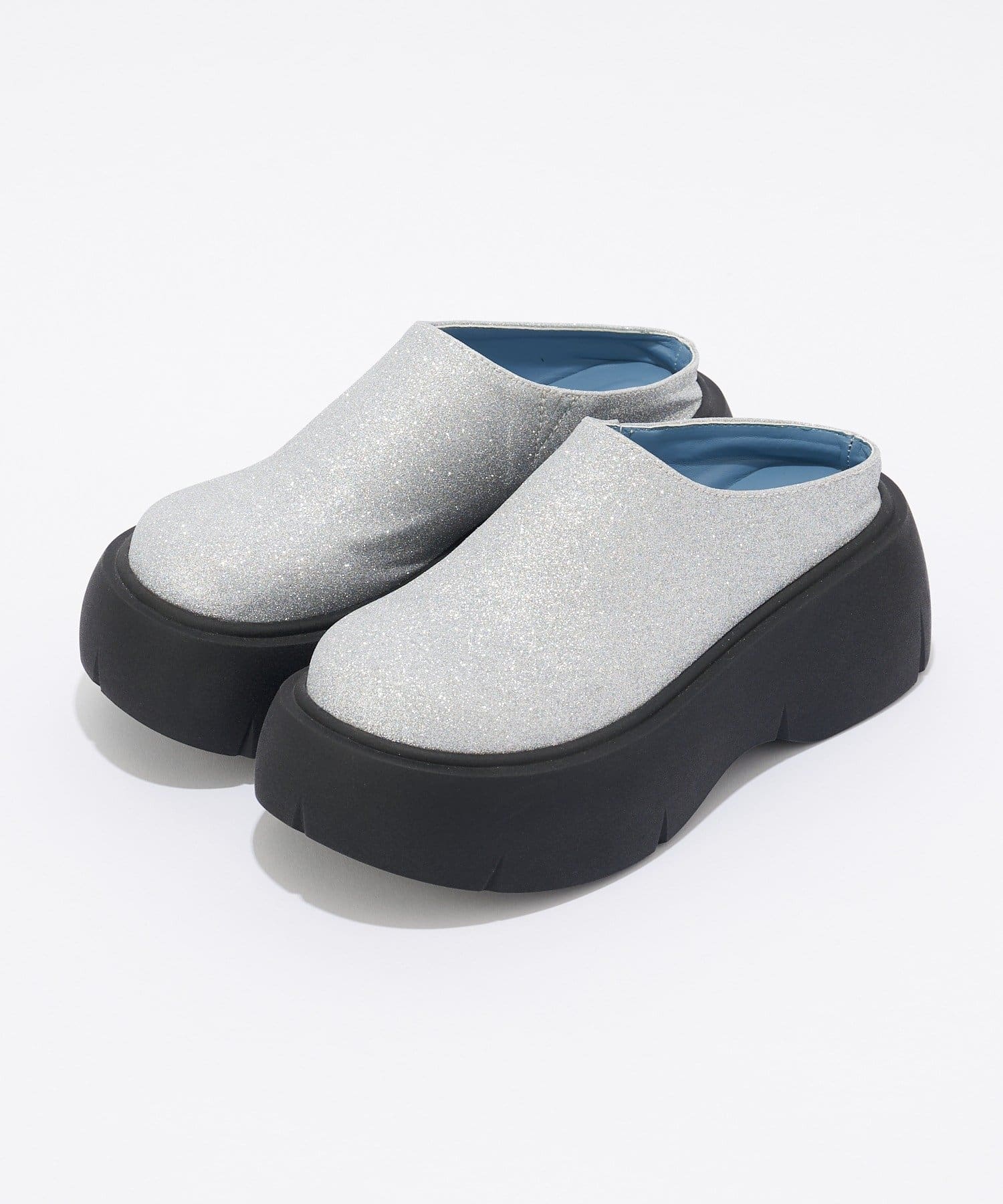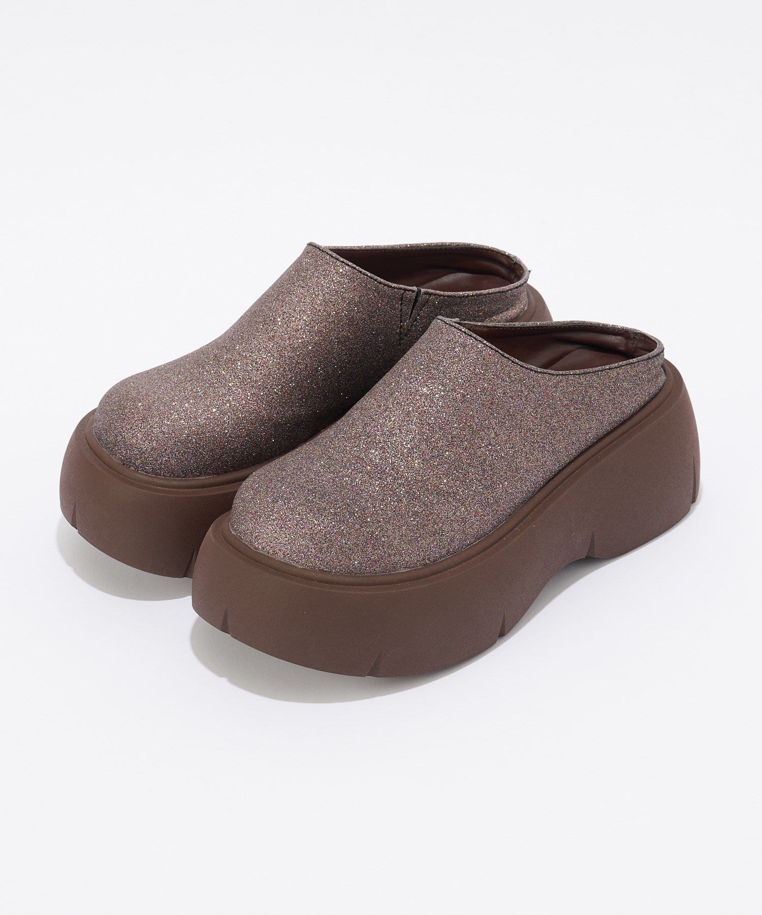 細かいラメがさりげなく輝く厚底サボサンダル。