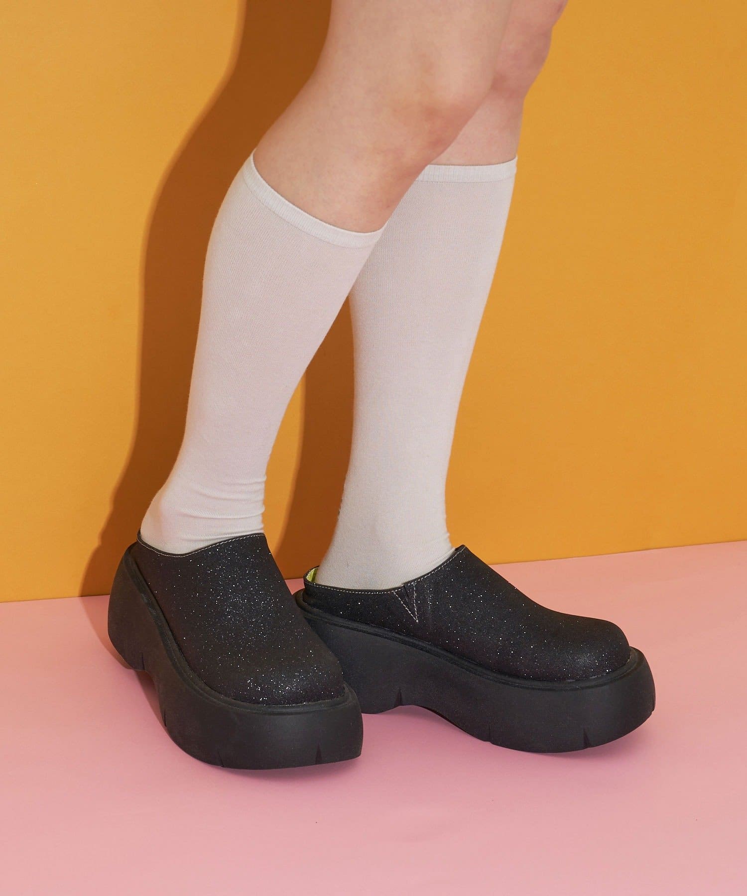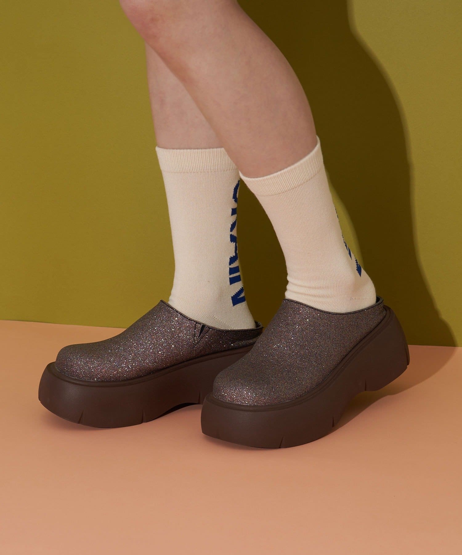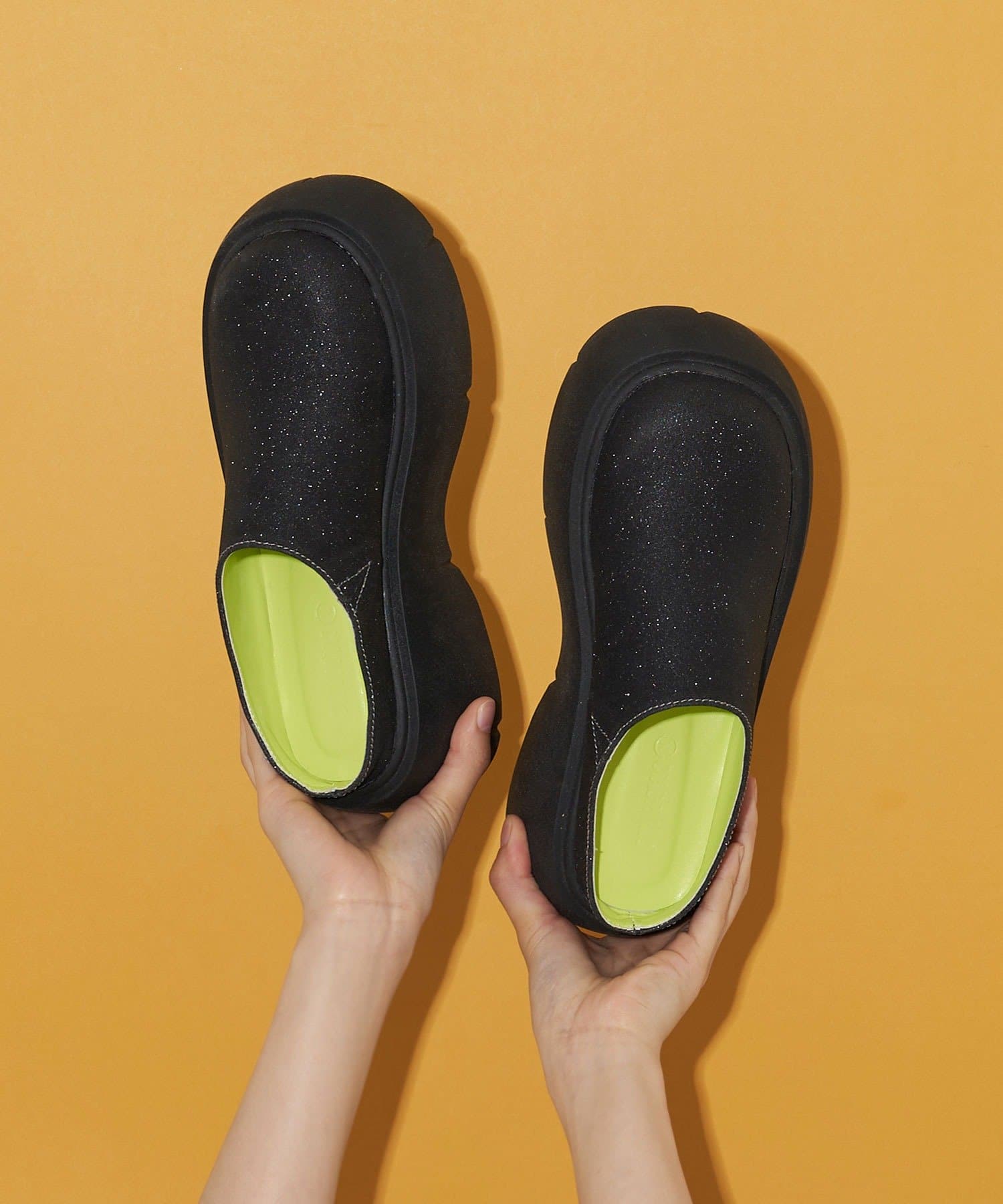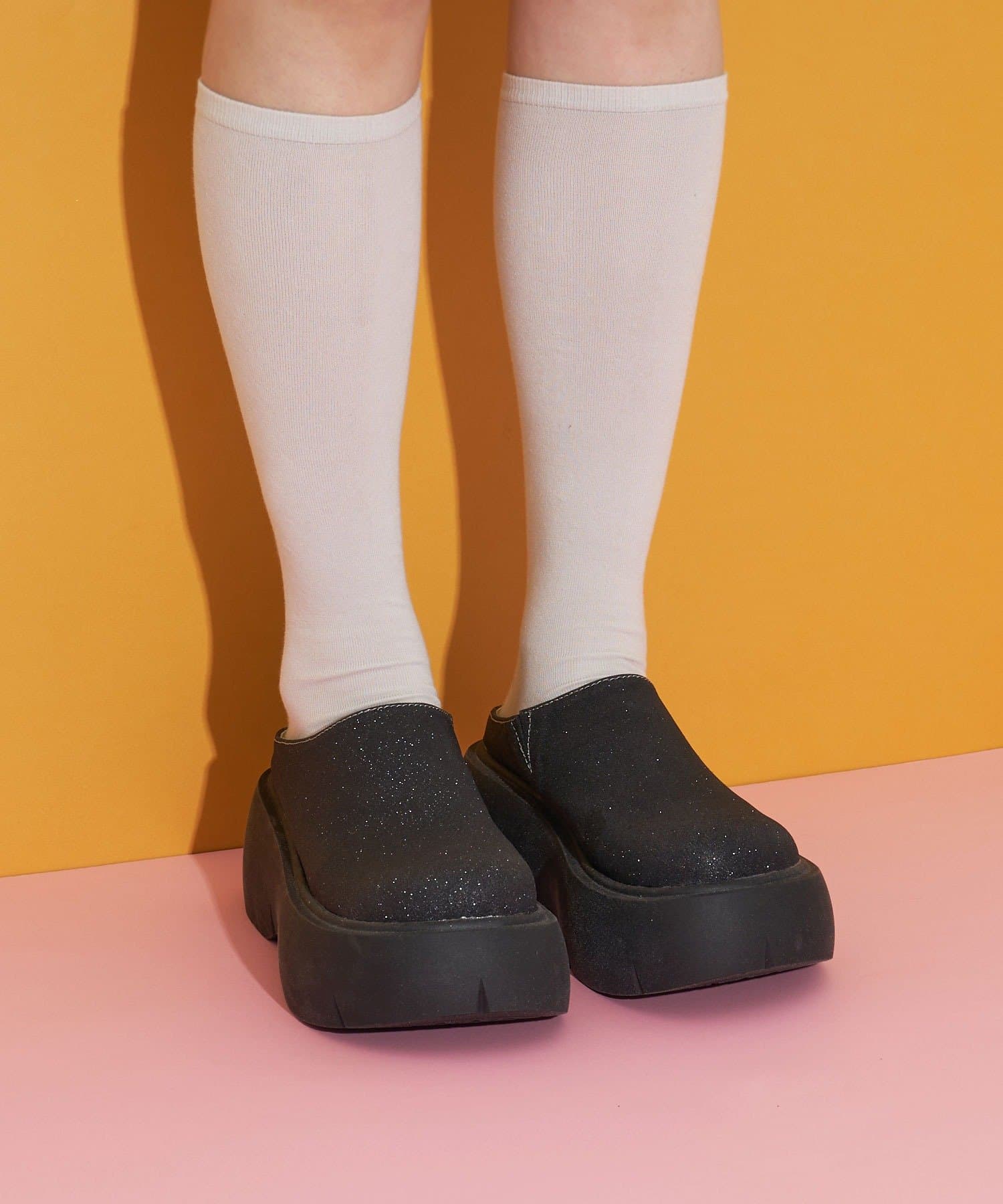 細かいラメがさりげなく輝く厚底サボサンダル。