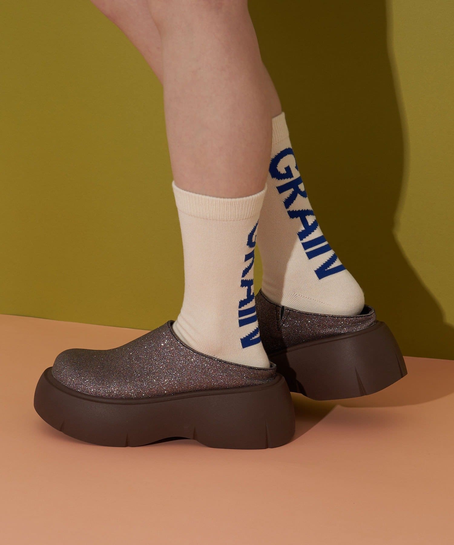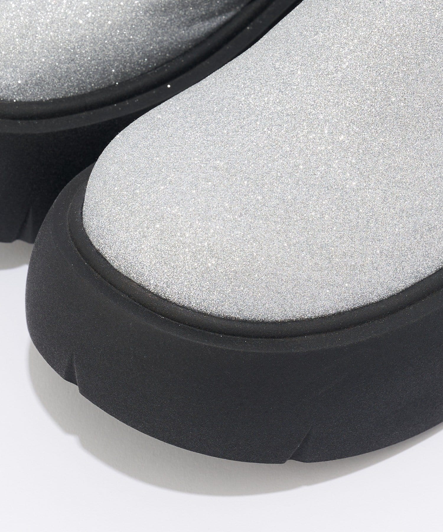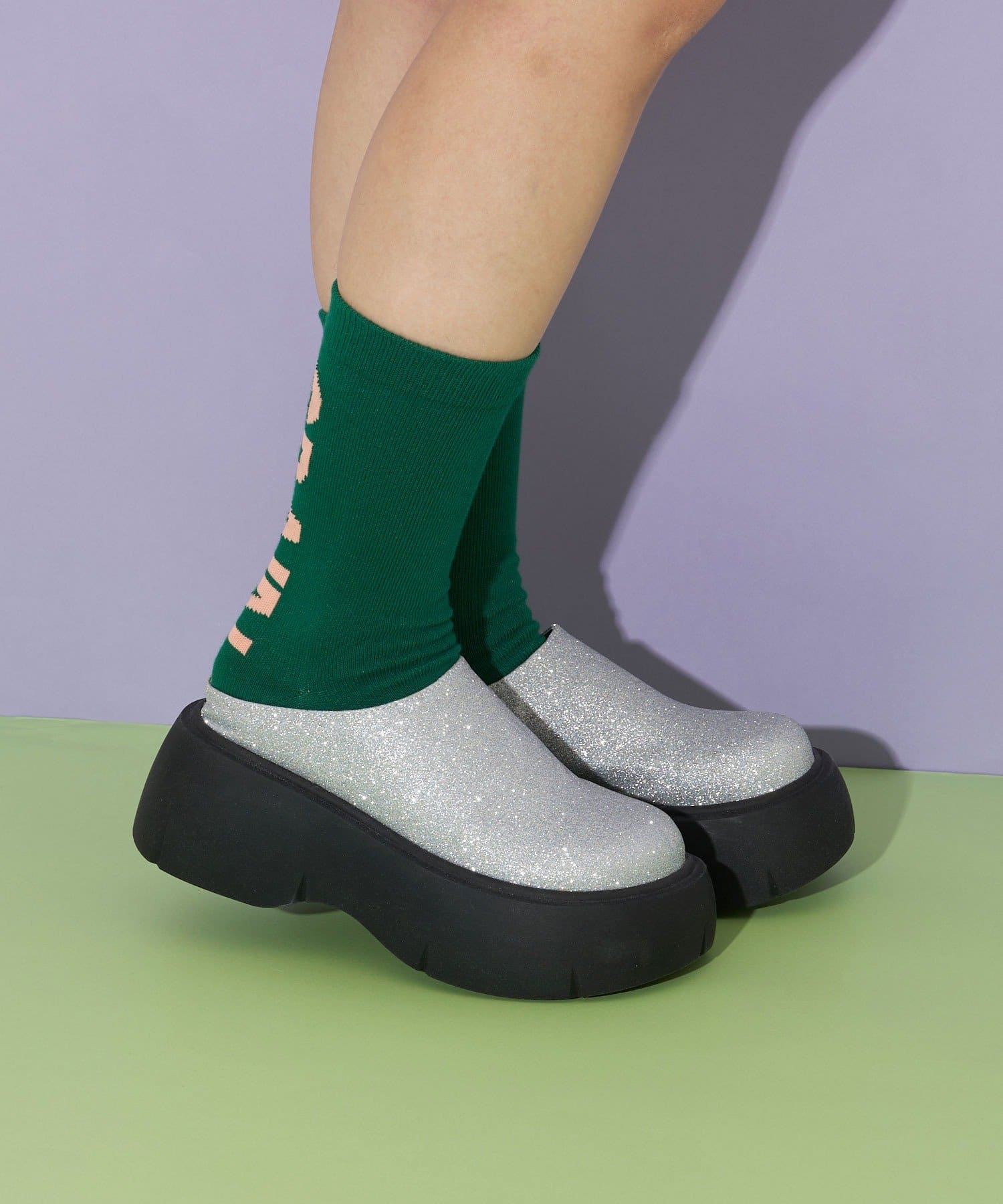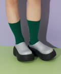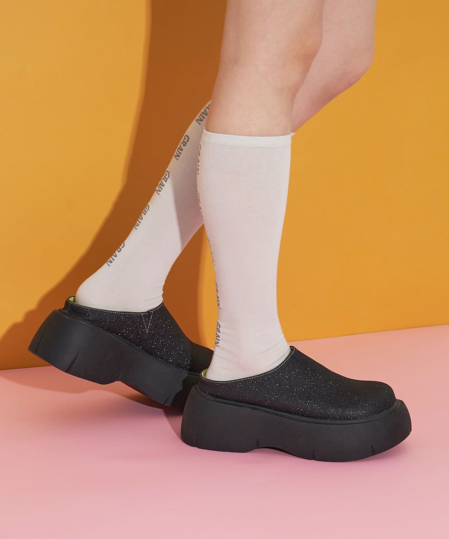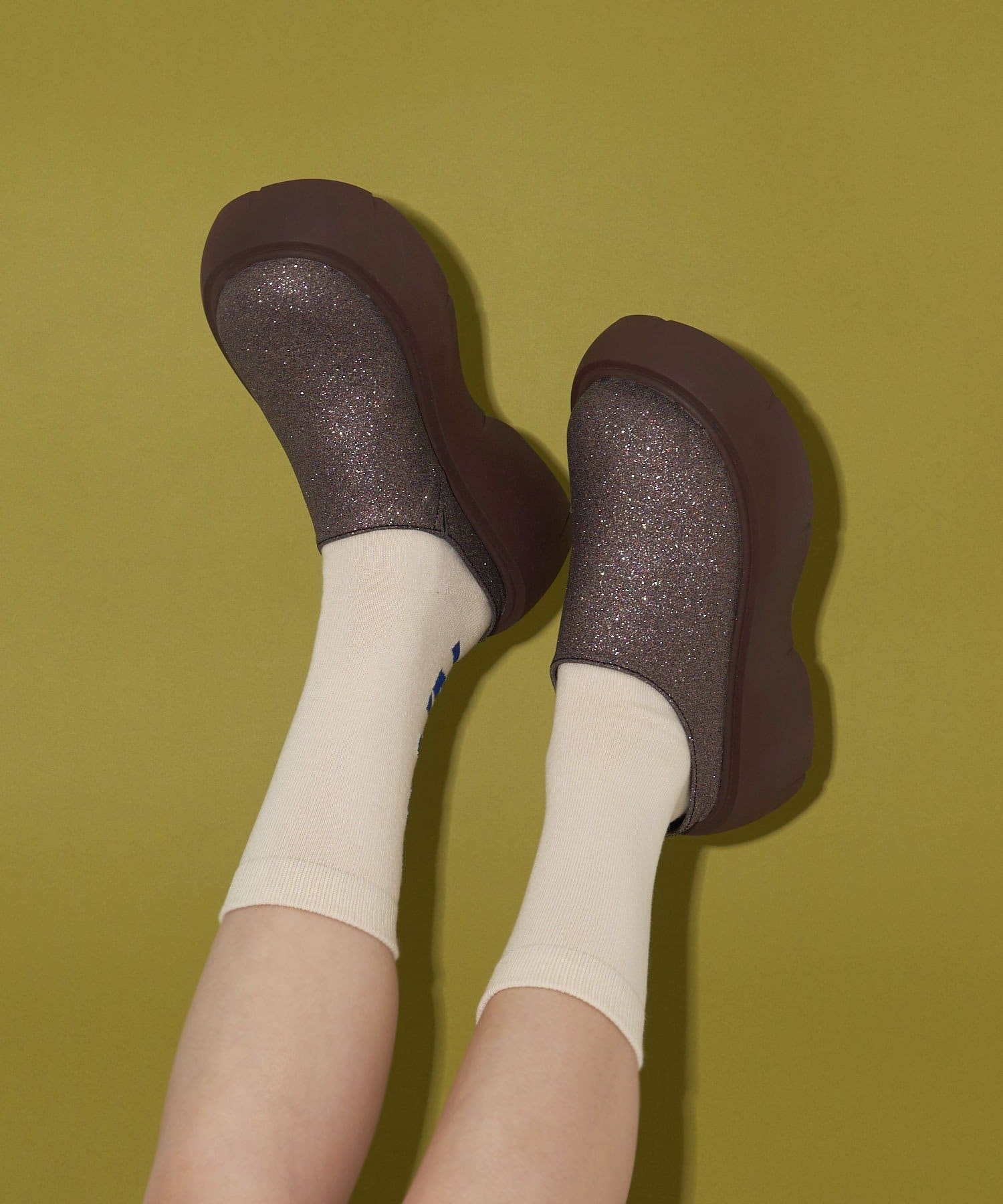 細かいラメがさりげなく輝く厚底サボサンダル。