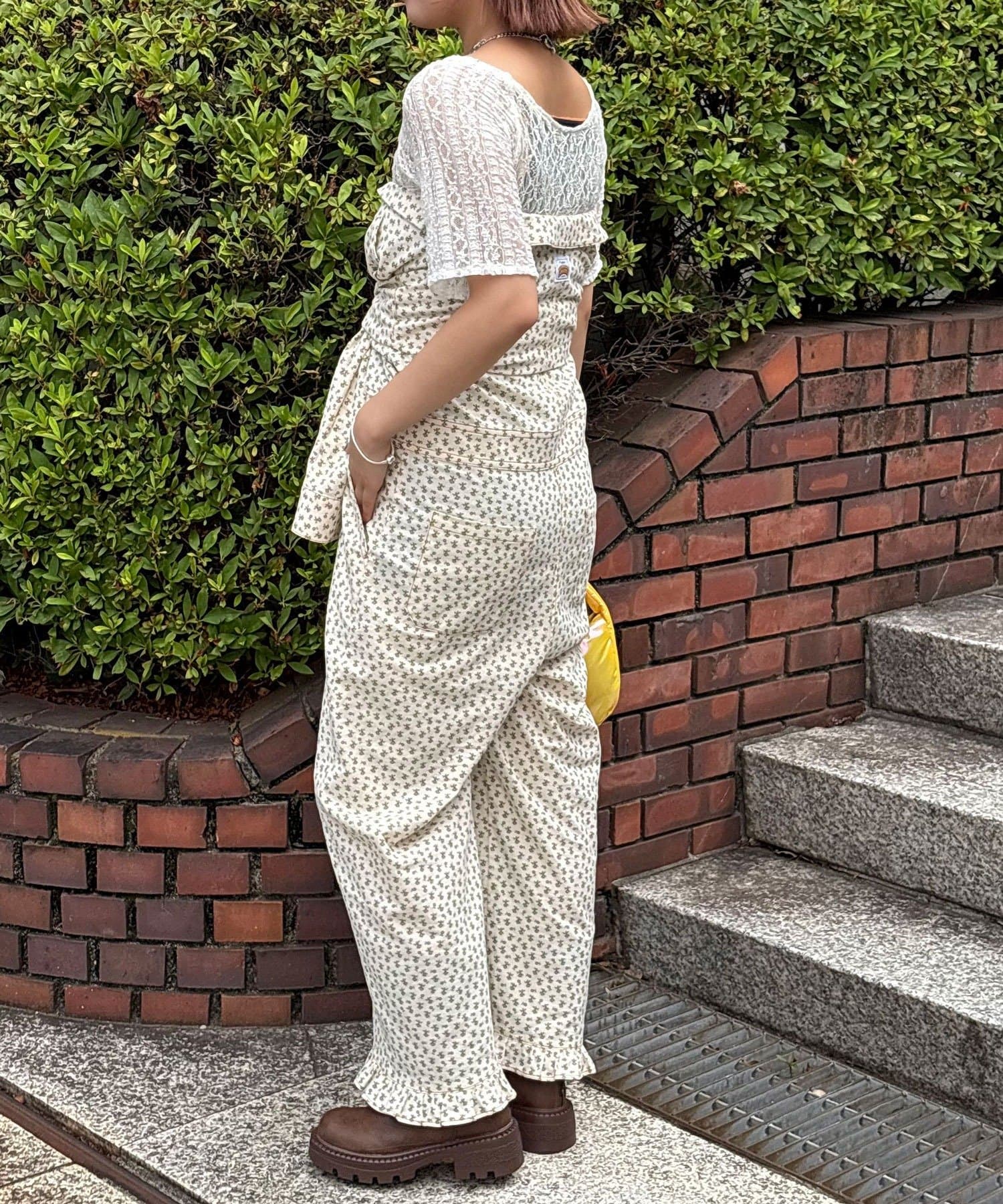 甘めな小花柄に裾のフリルが揺れるフェミニンなジャンプスーツ。