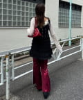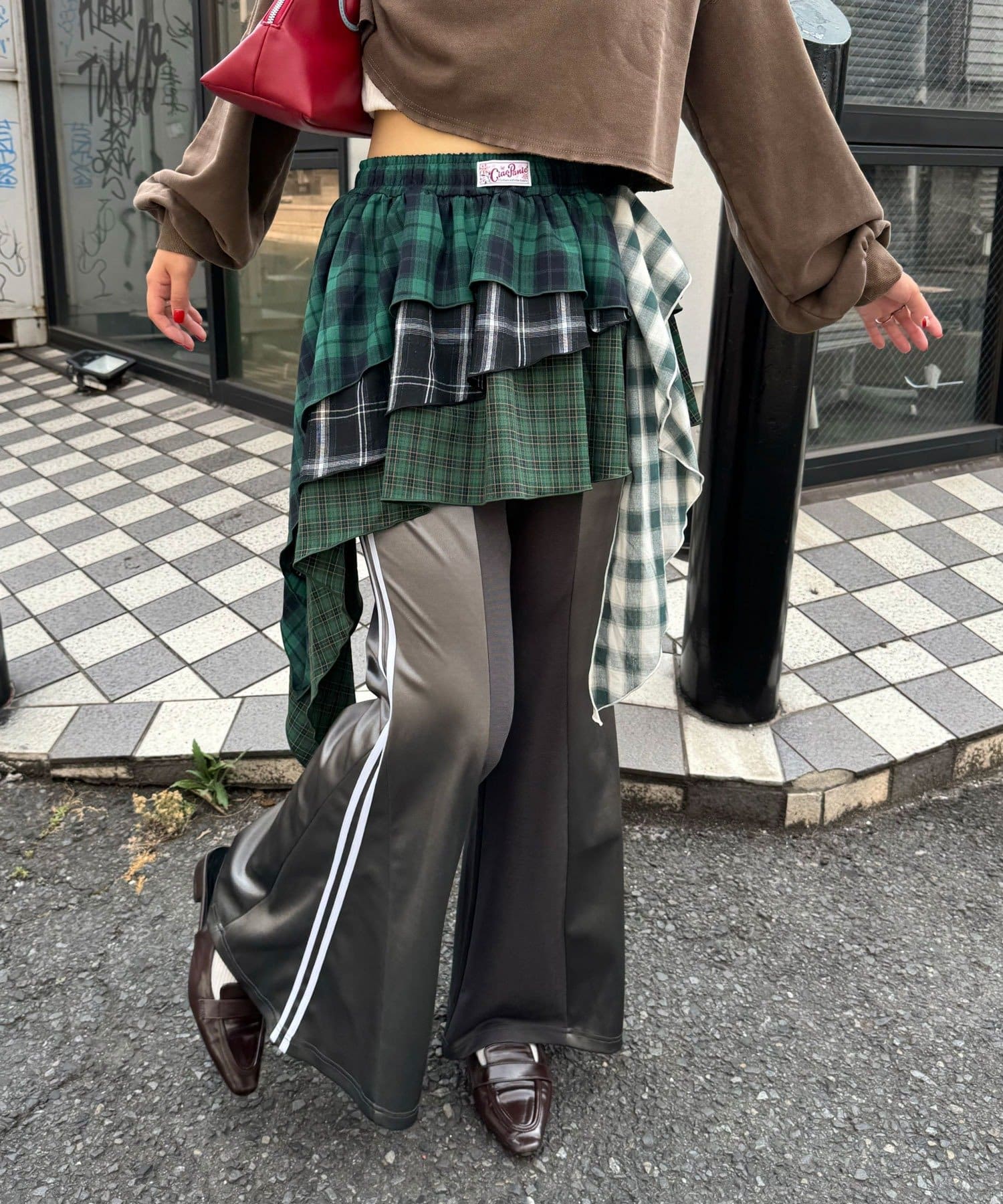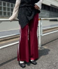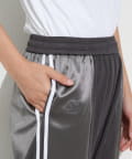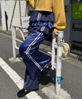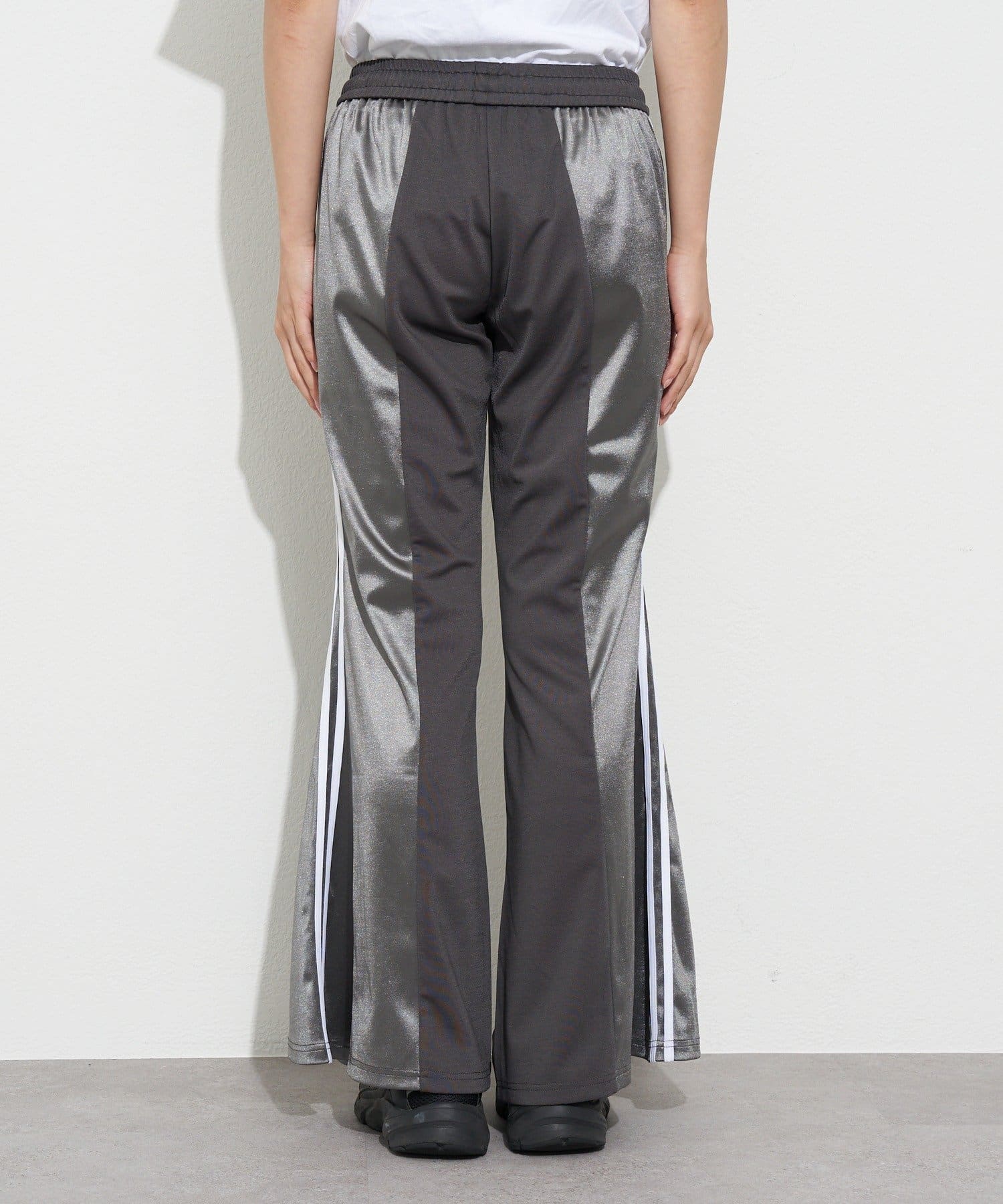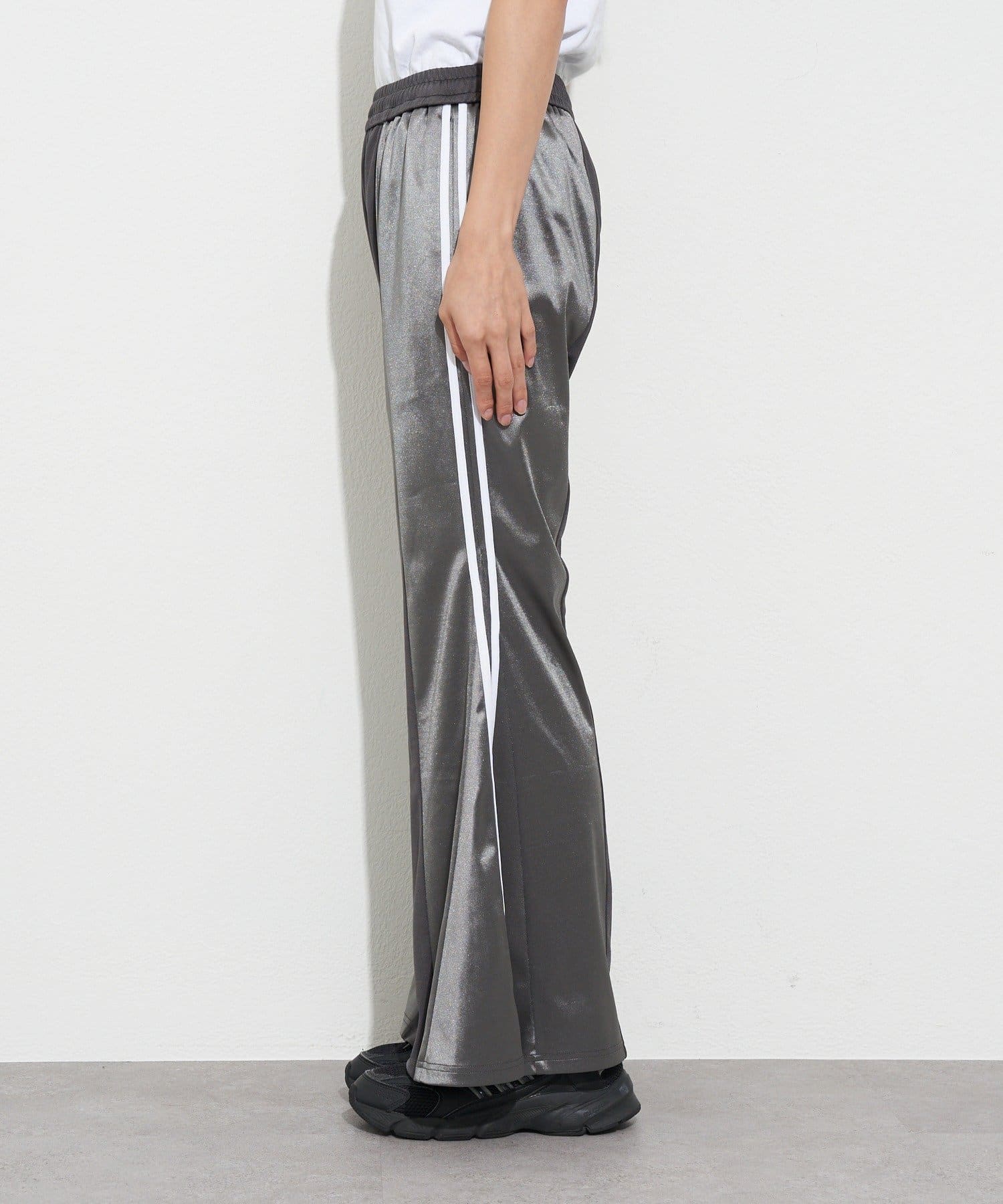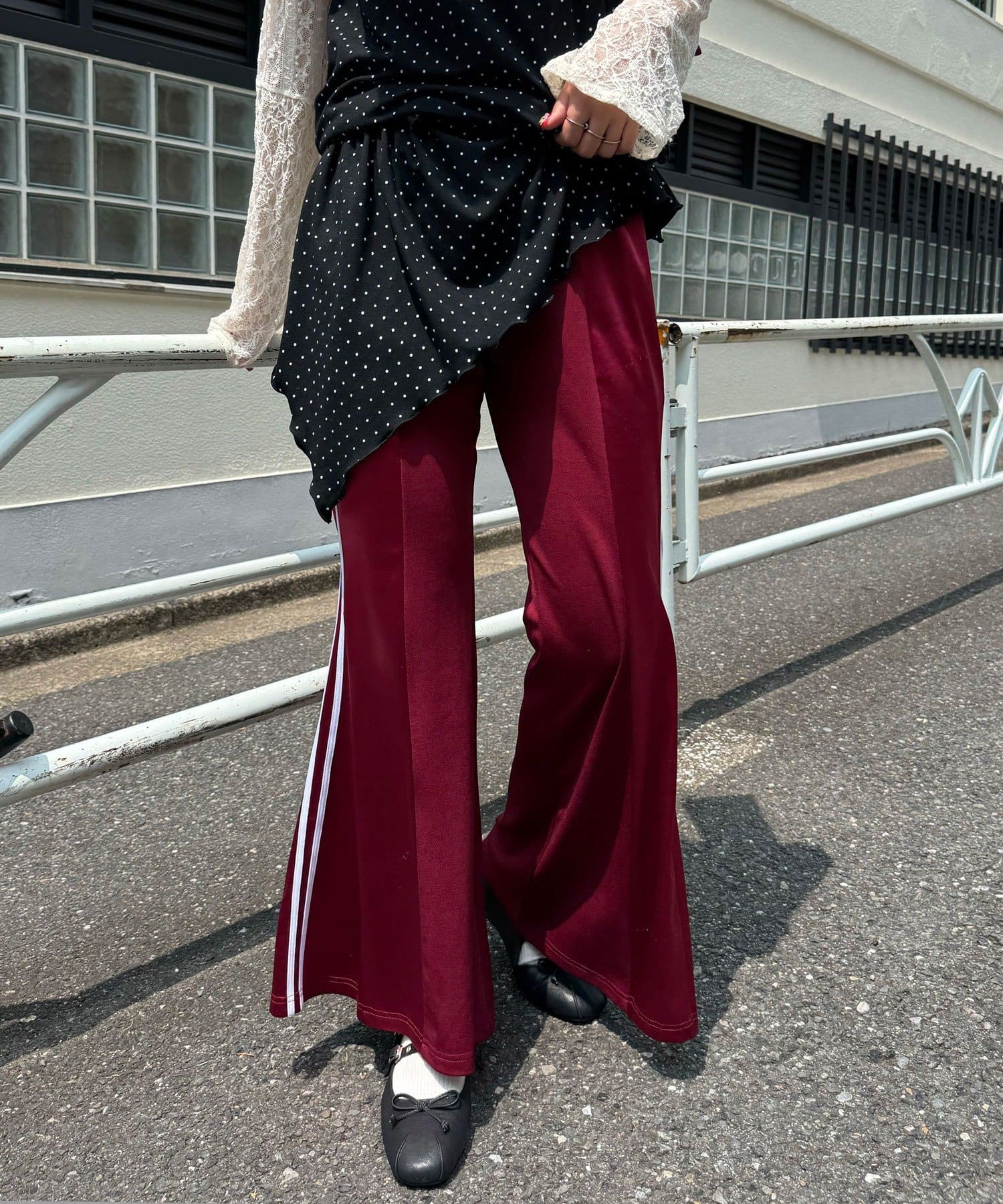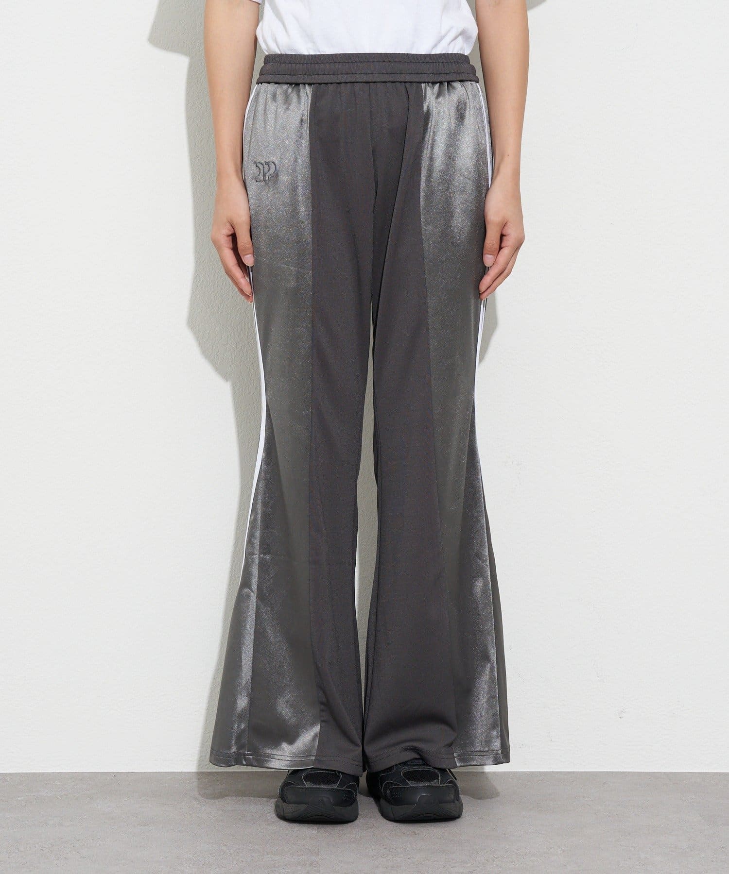 ツヤ感のあるサテンとマットなジャージー素材をドッキングした、視線を奪うトラックフレアパンツ。