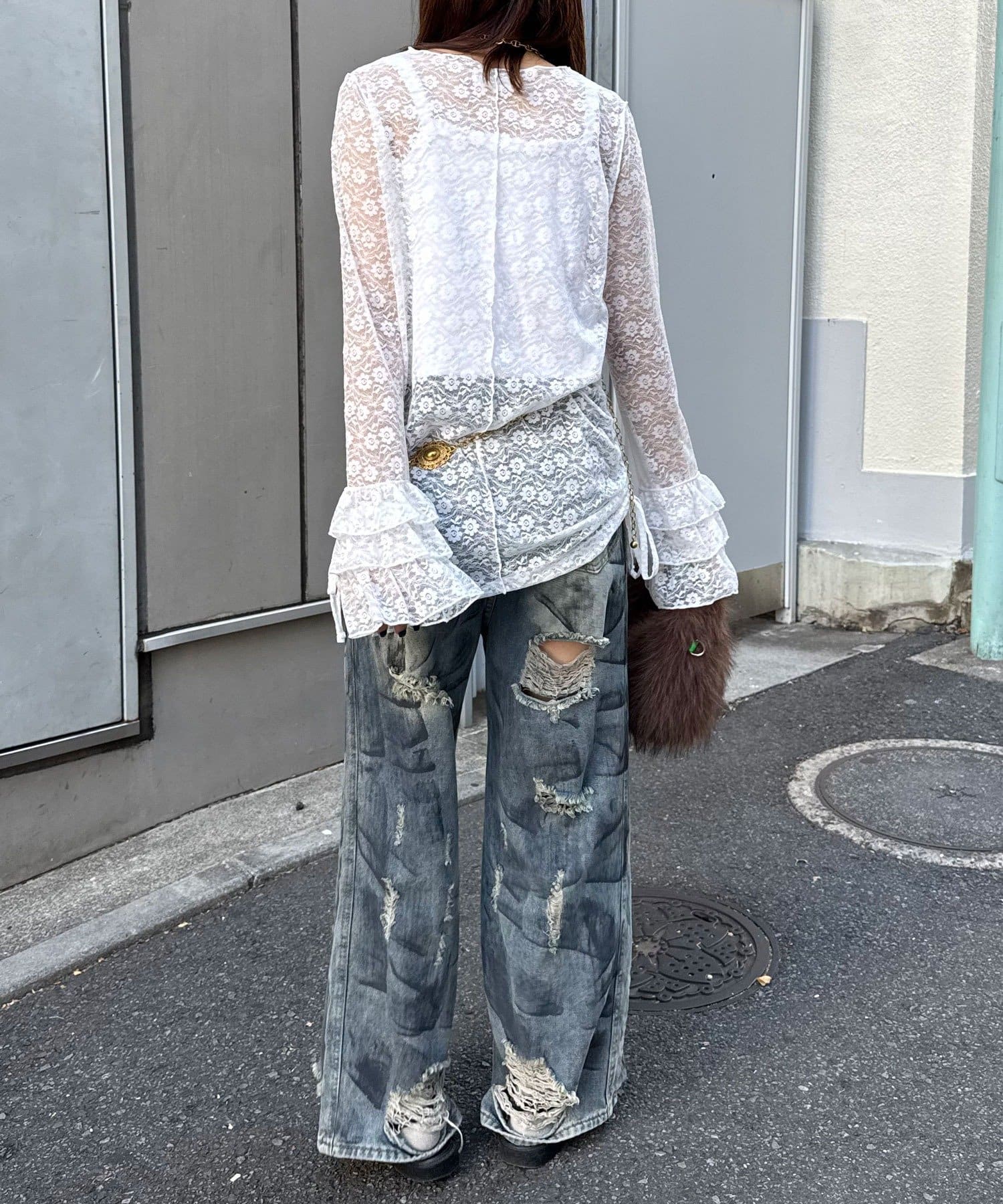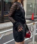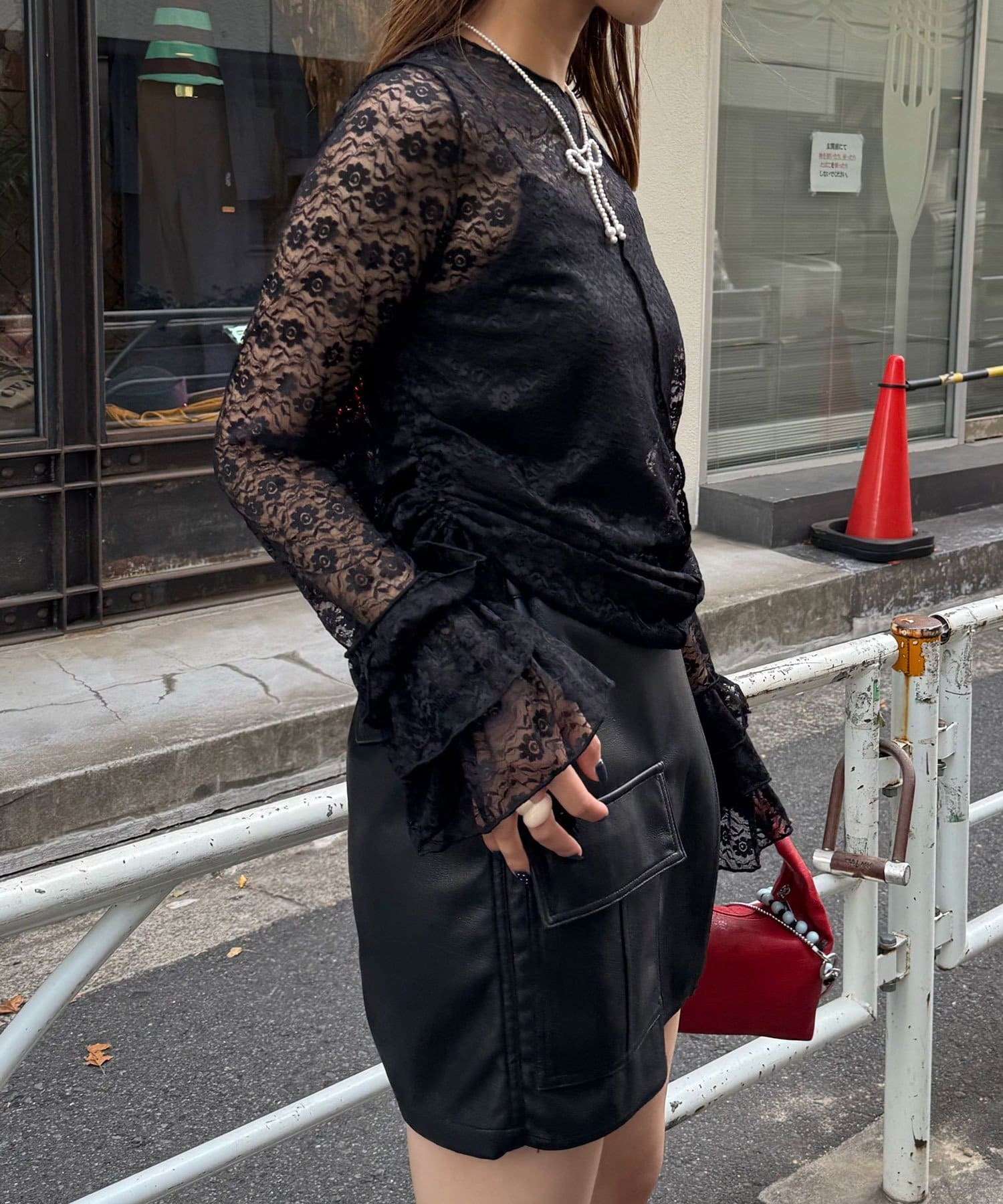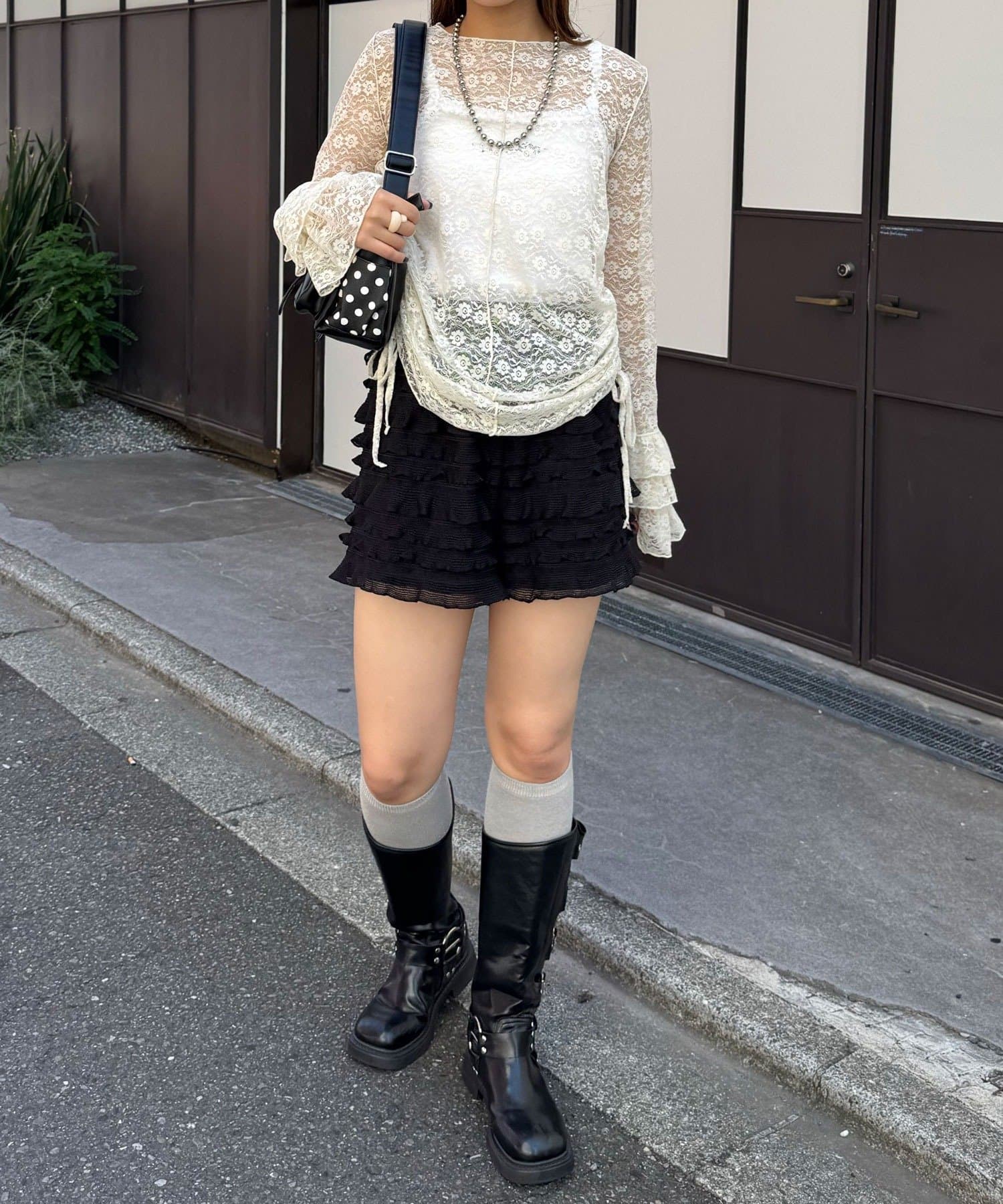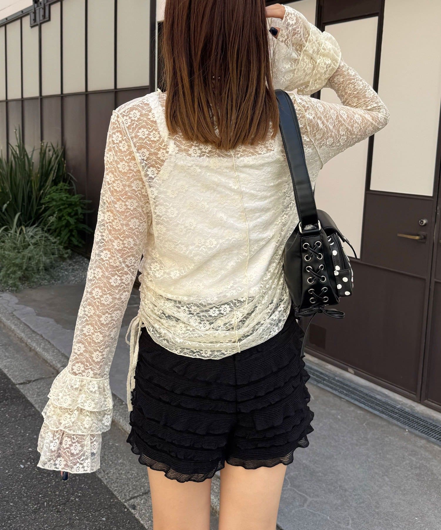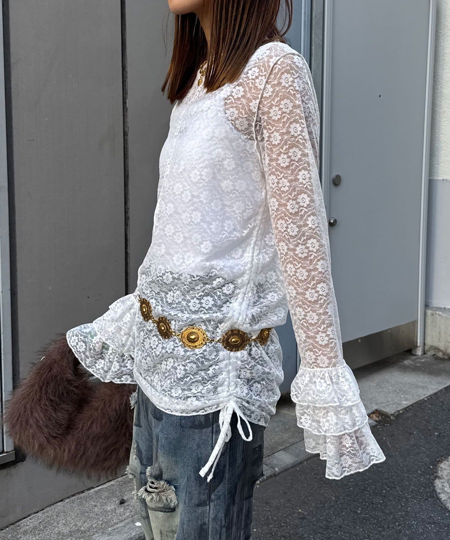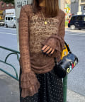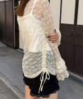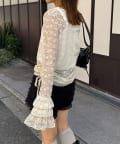 繊細なフラワーレースに、ティアードスリーブとシャーリングを効かせた華やかトップス。