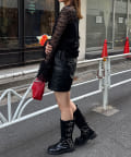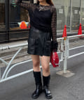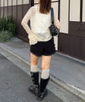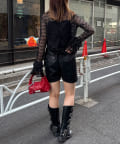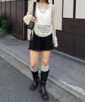 ショートパンツとロングブーツで合わせれば、トレンド感のある甘辛コーデに。