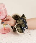 ふんわりとしたベロア生地に、ドット柄リボンが映えるデザインシュシュ。