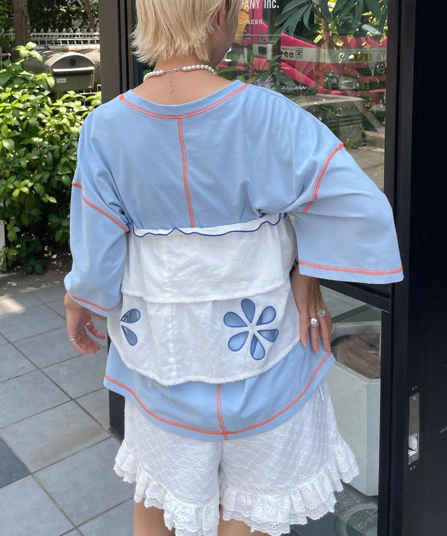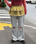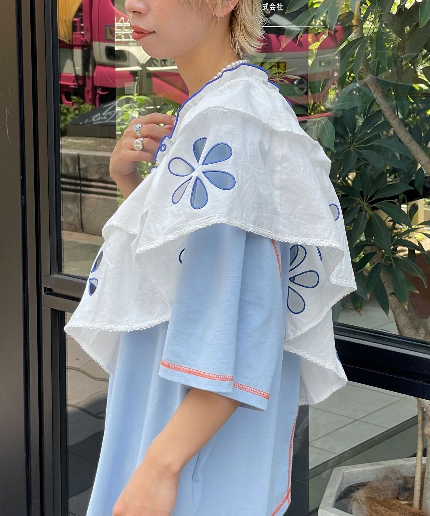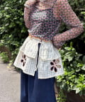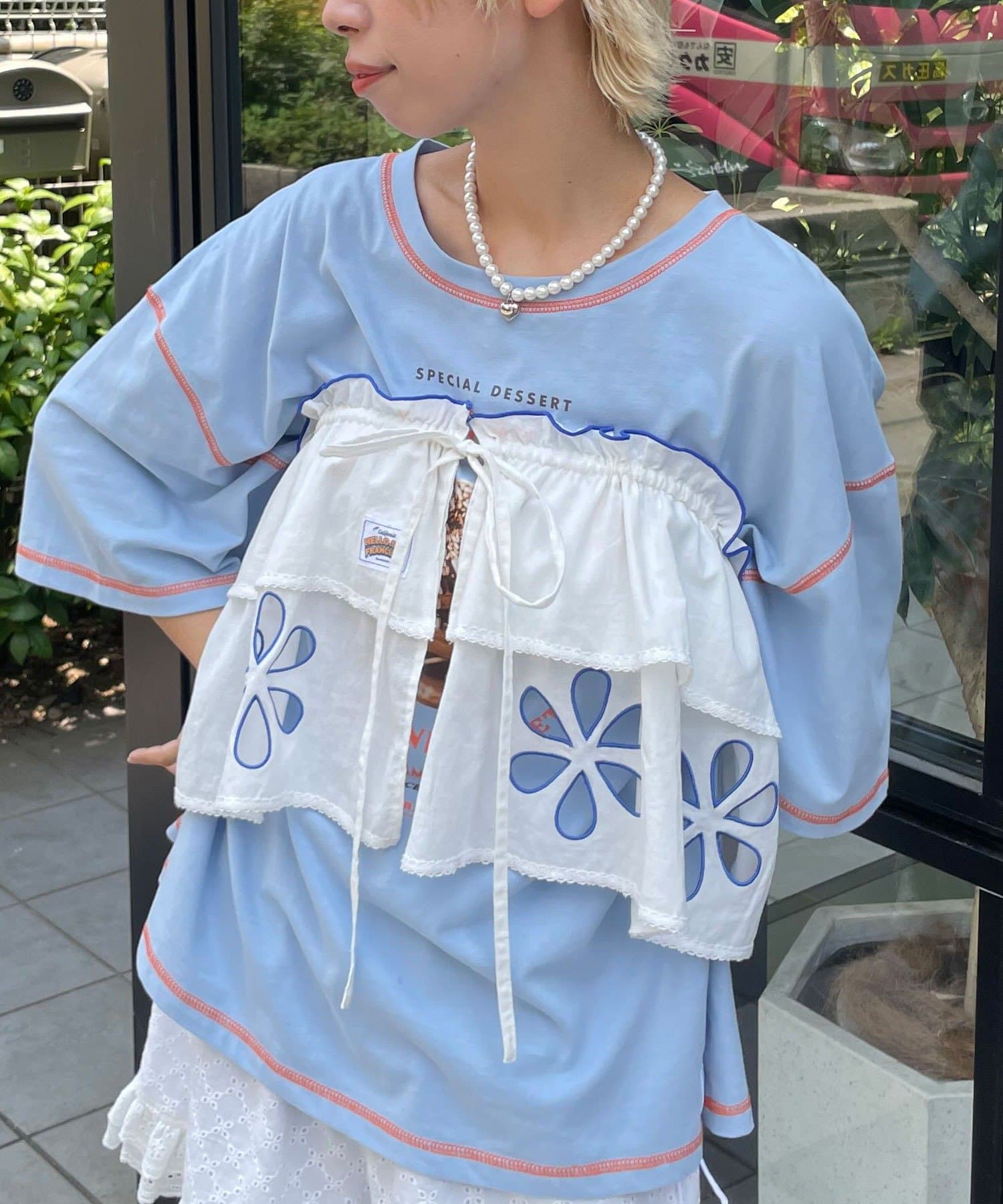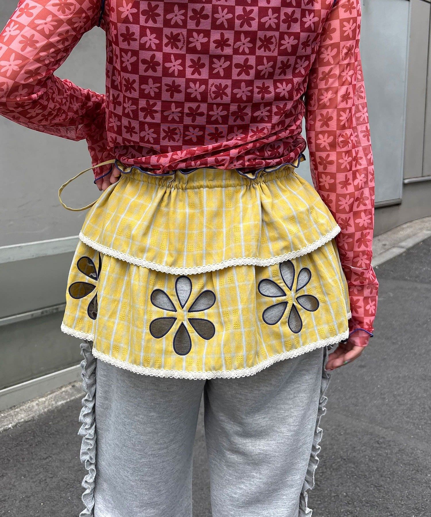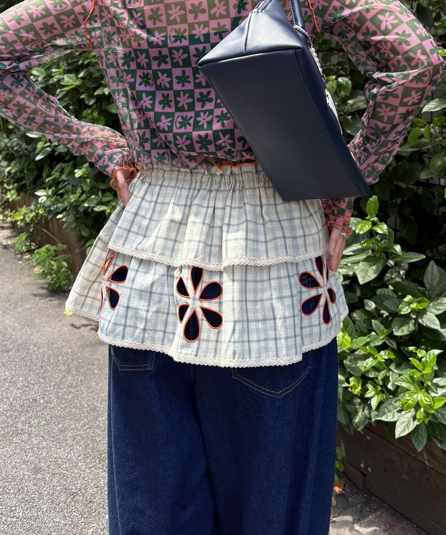 二段フリルの下に施されたフラワーカットアウトが、動くたびにさりげない華やかさを添えます。