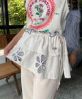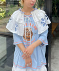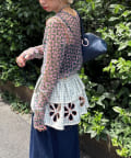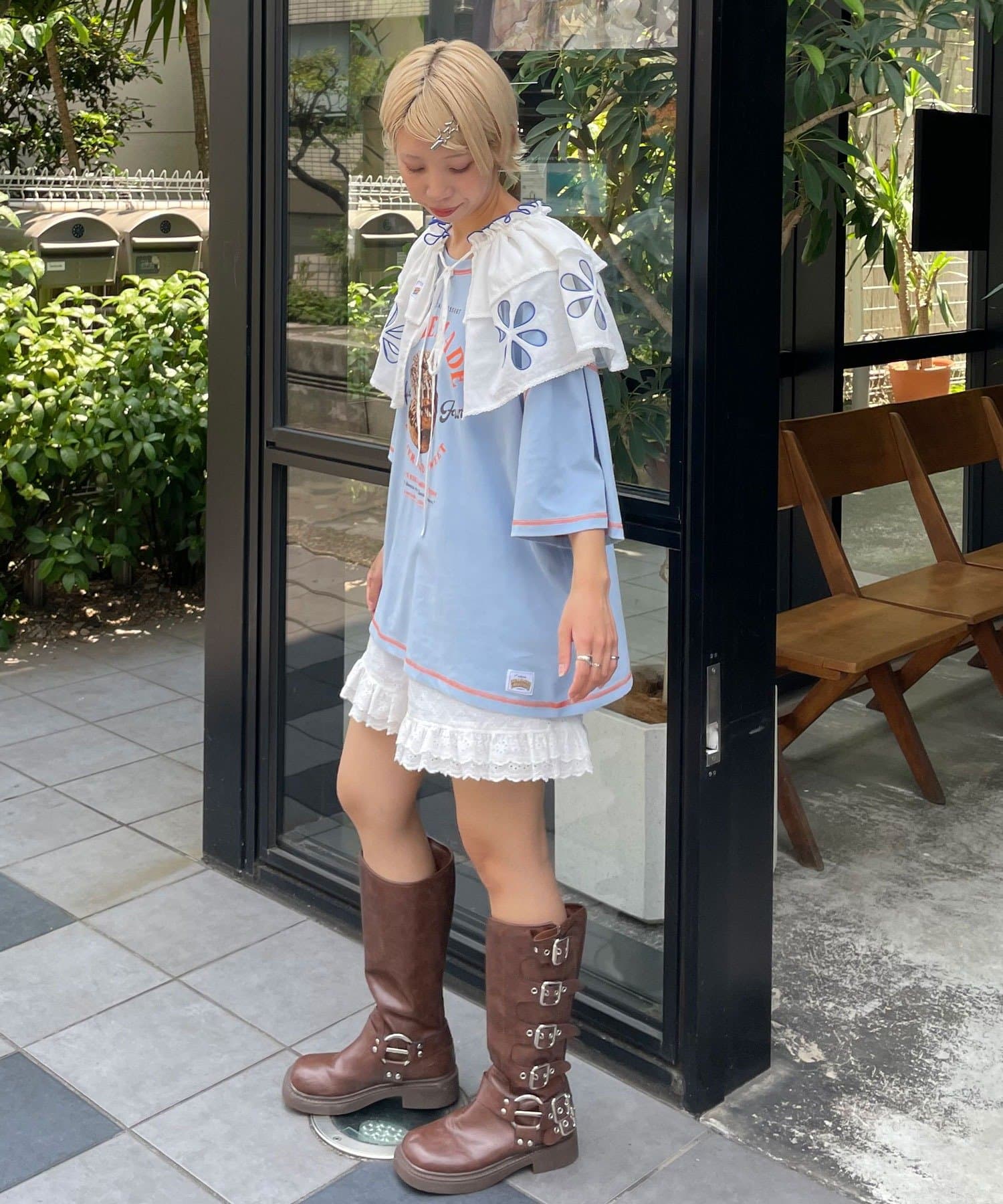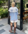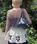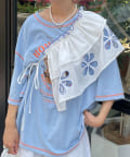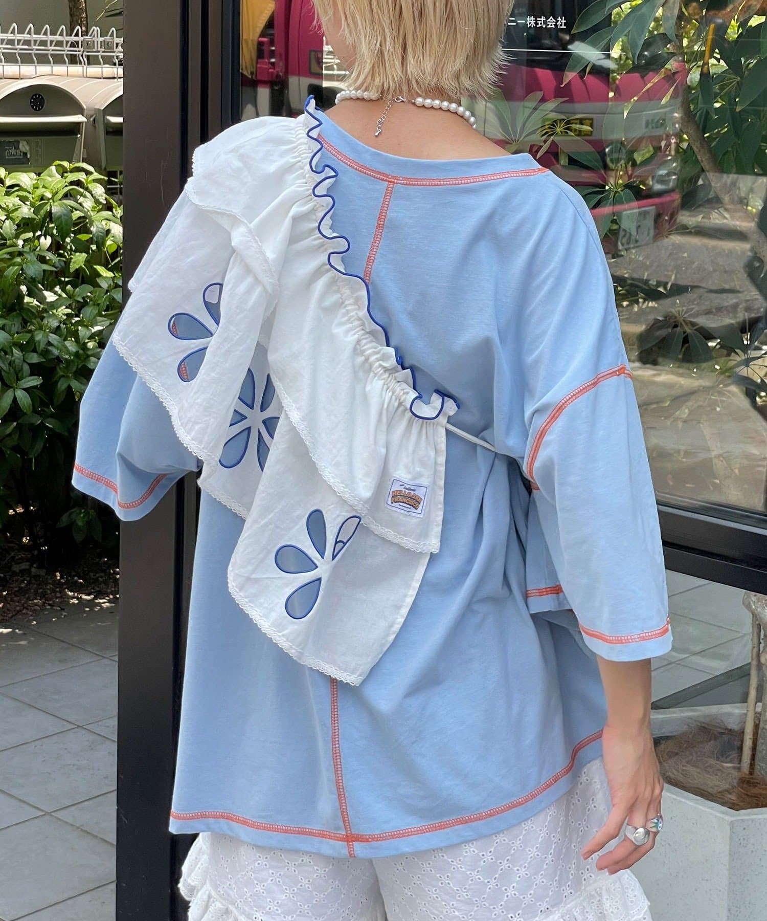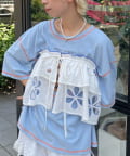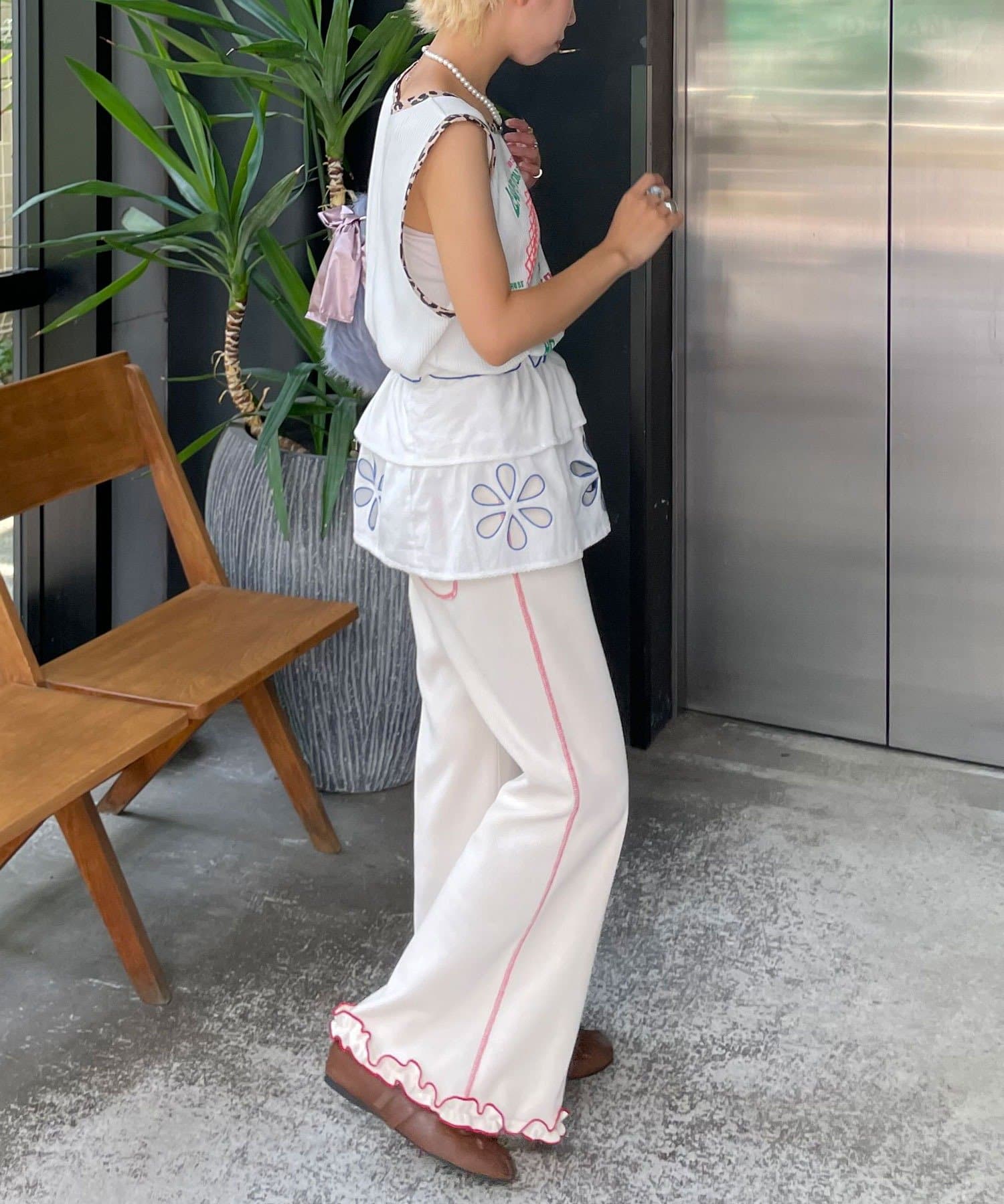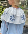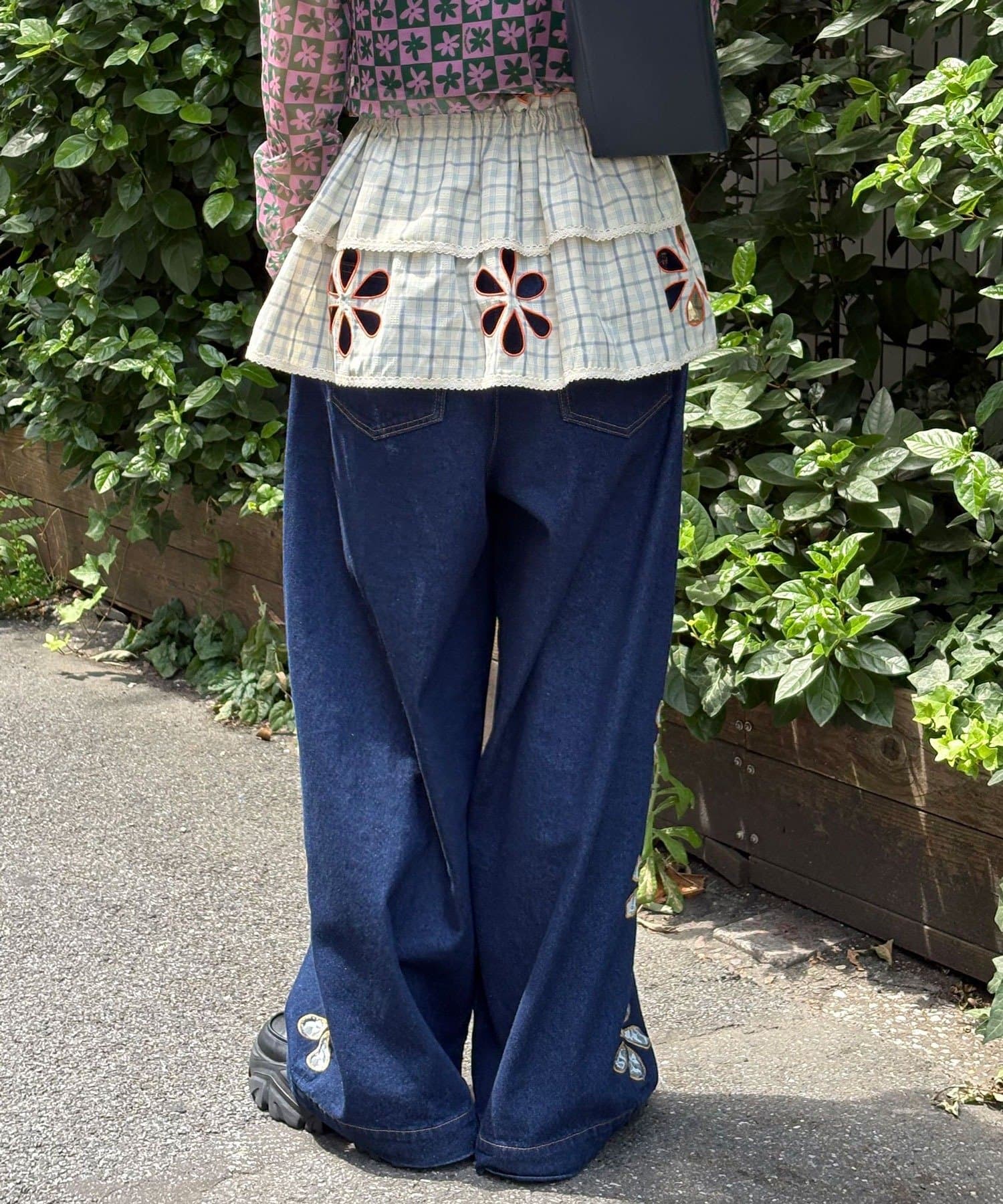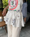 二段フリルの下に施されたフラワーカットアウトが、動くたびにさりげない華やかさを添えます。