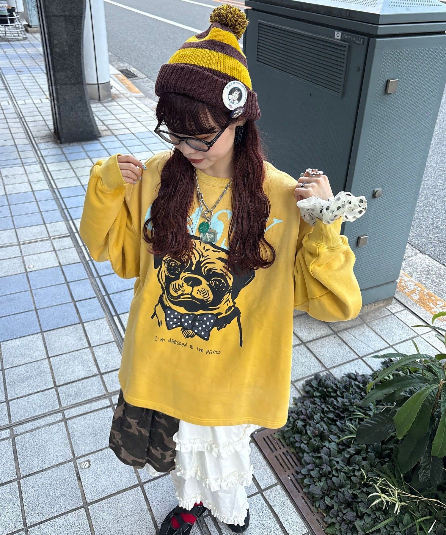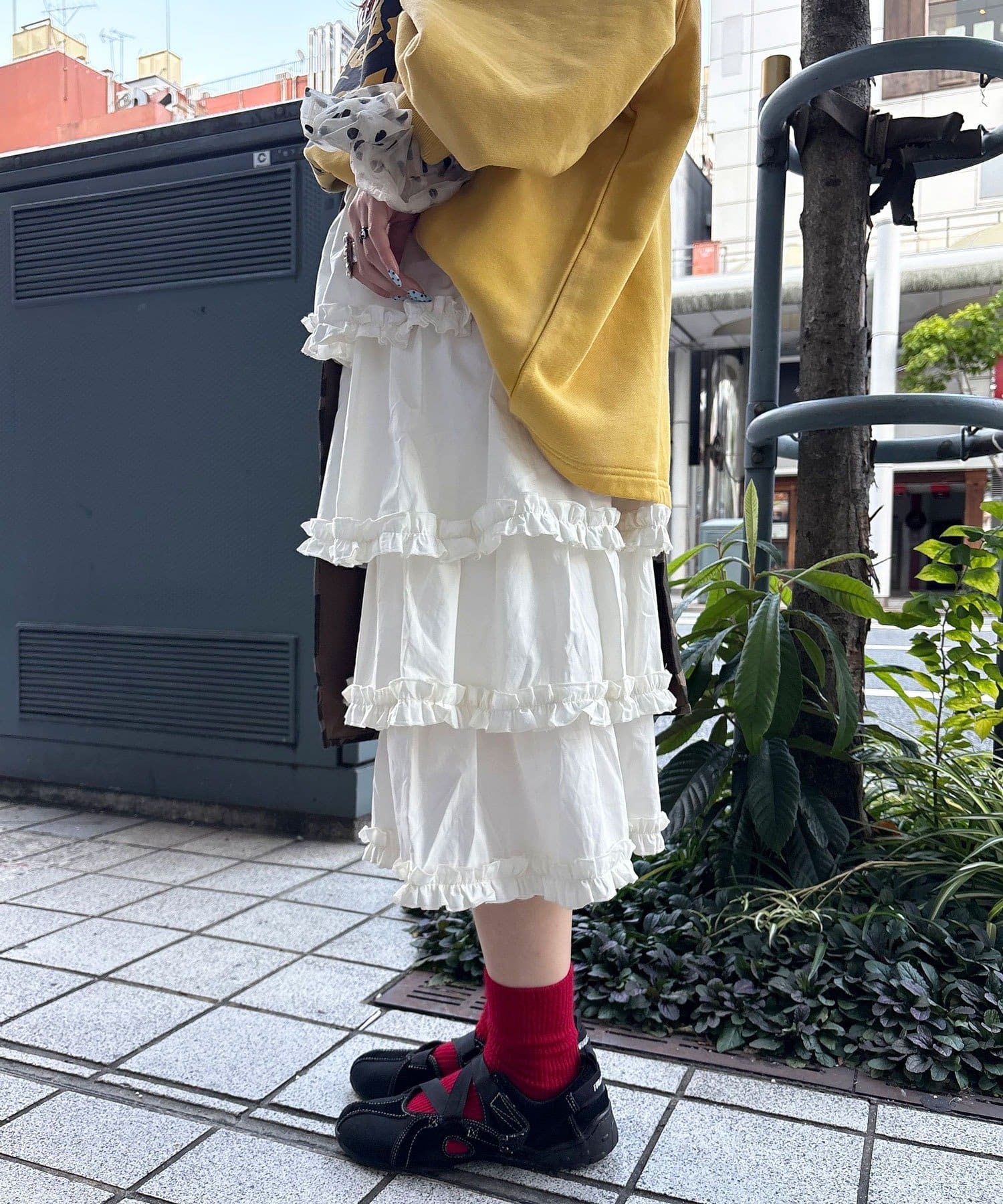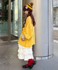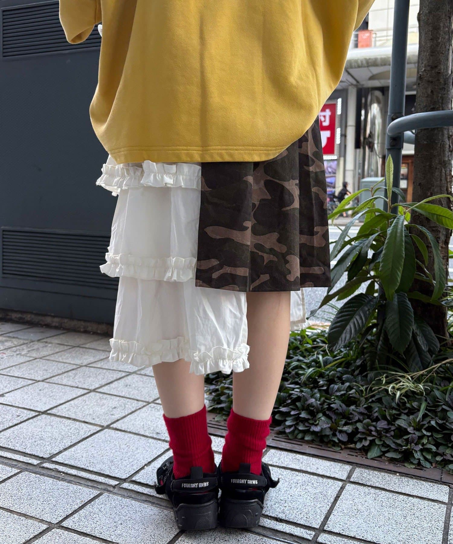 カモフラ柄プリーツとフリルレースのティアードデザインをドッキングさせた大胆な切り替えが、他にはない存在感を放ちます。