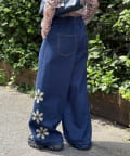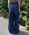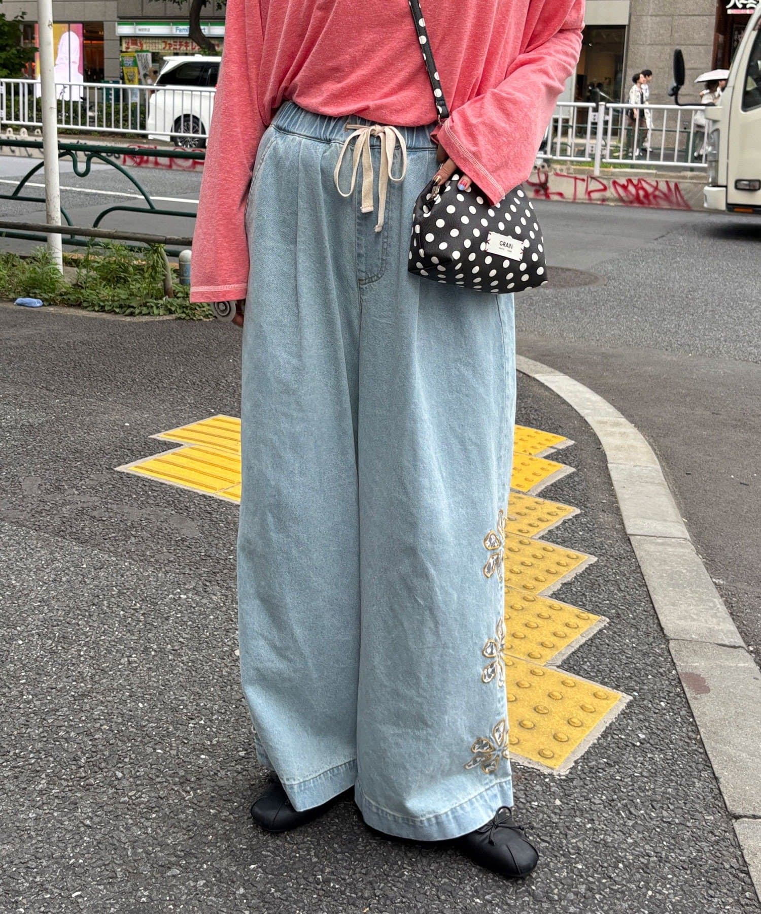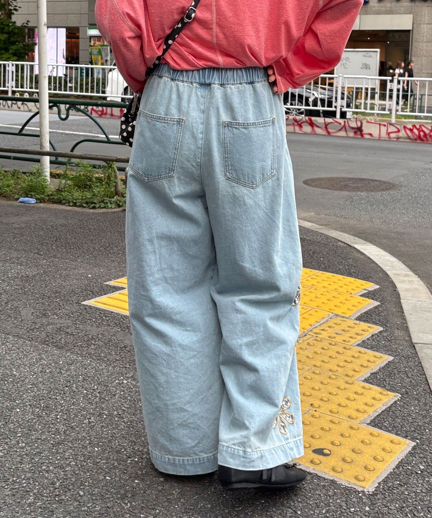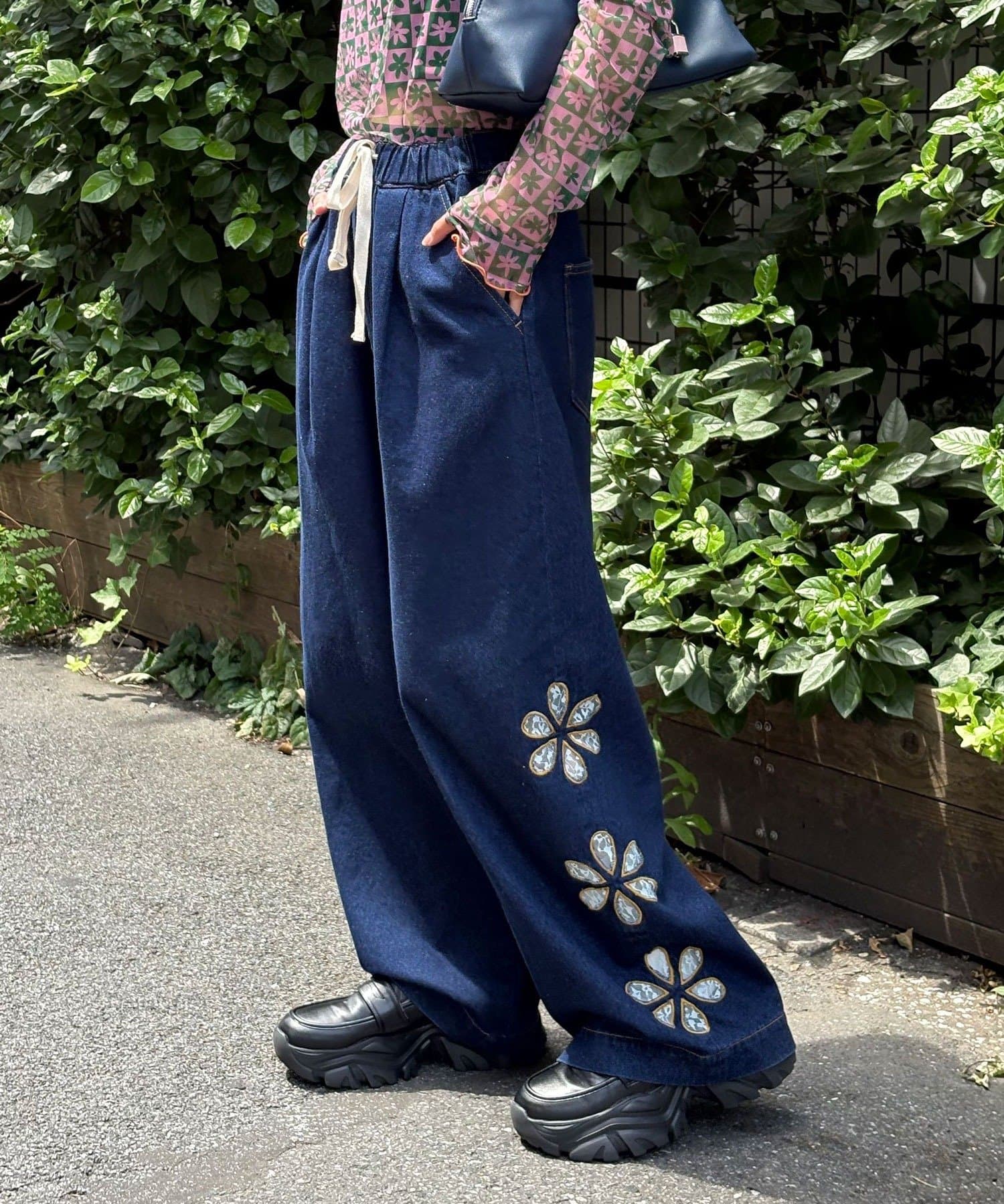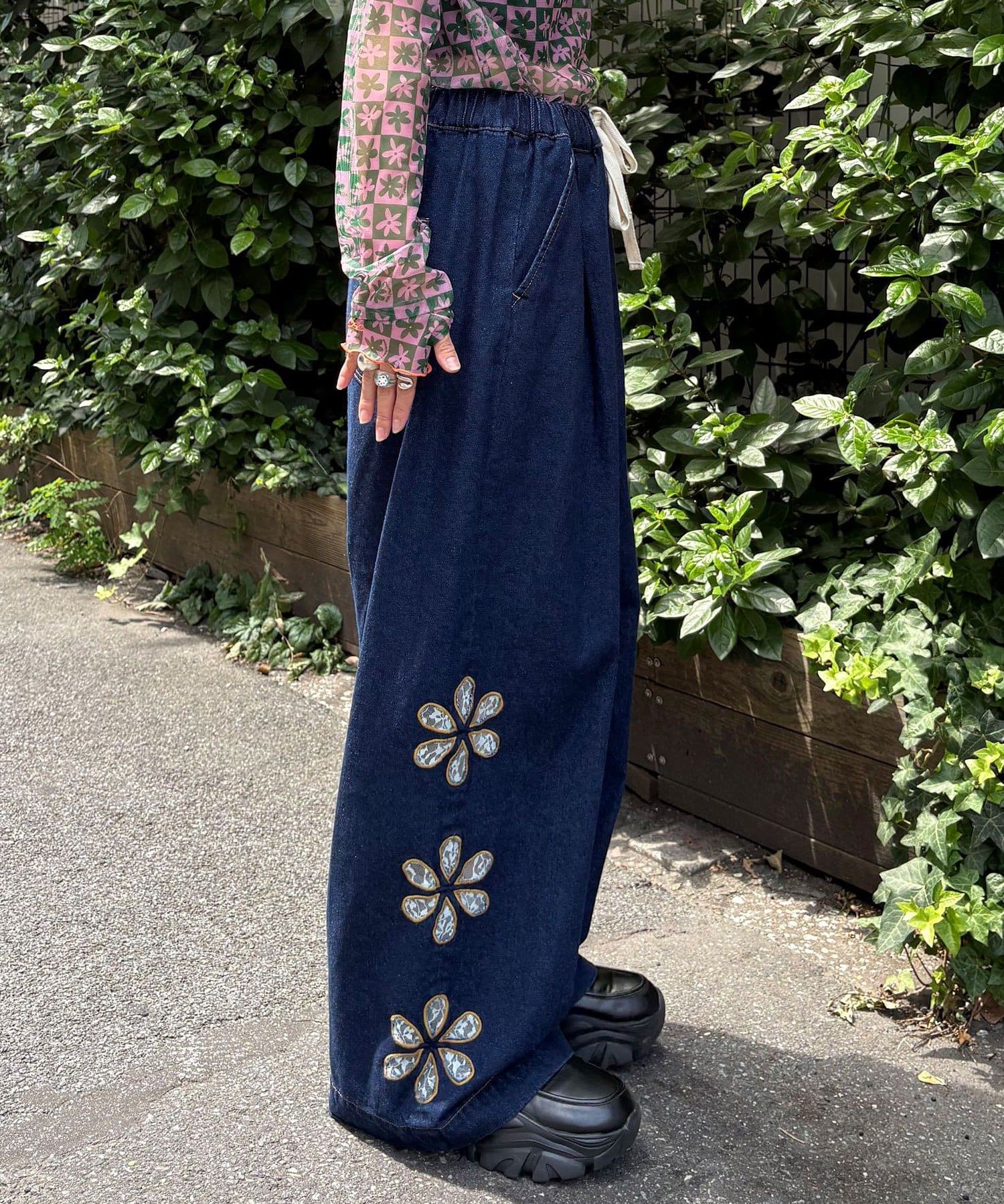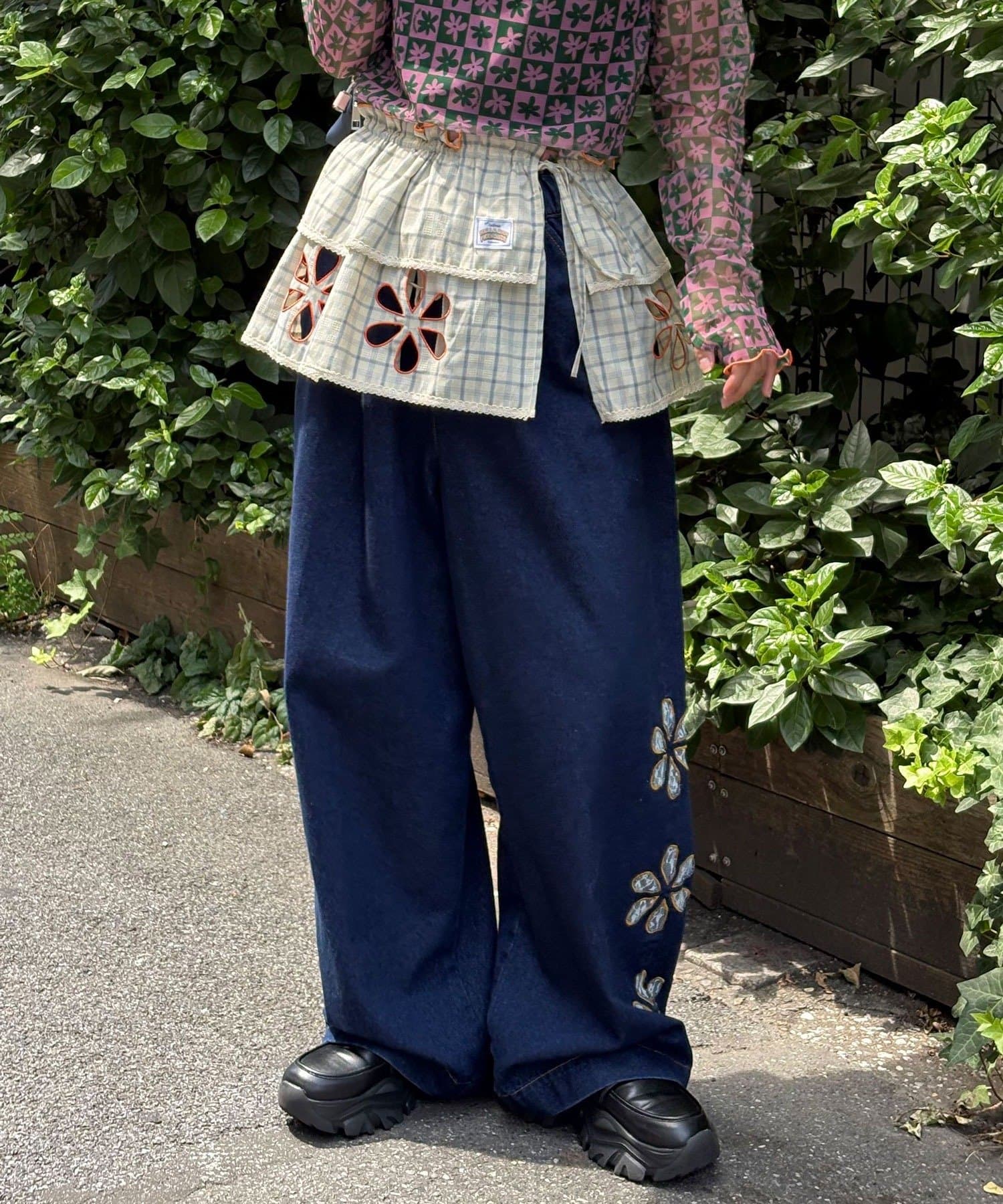 裾にあしらったフラワーカットアウト×レースが目を惹く、遊び心たっぷりのワイドデニム。