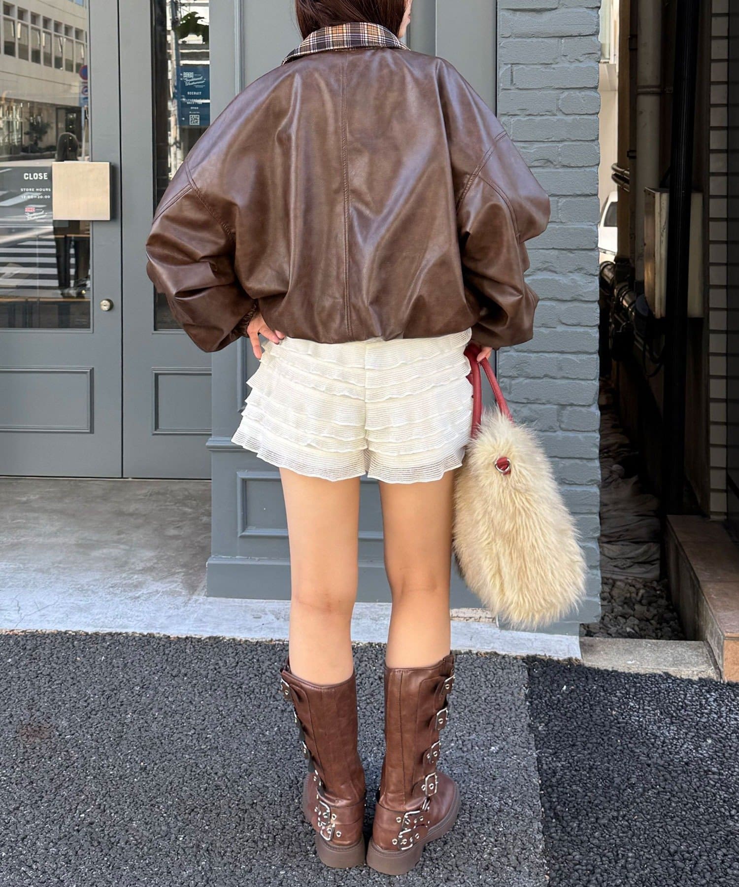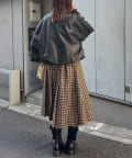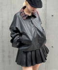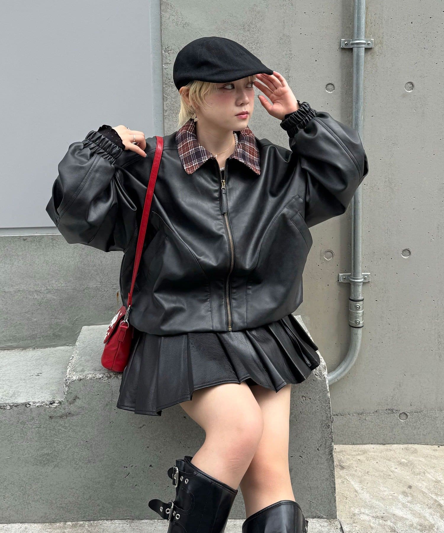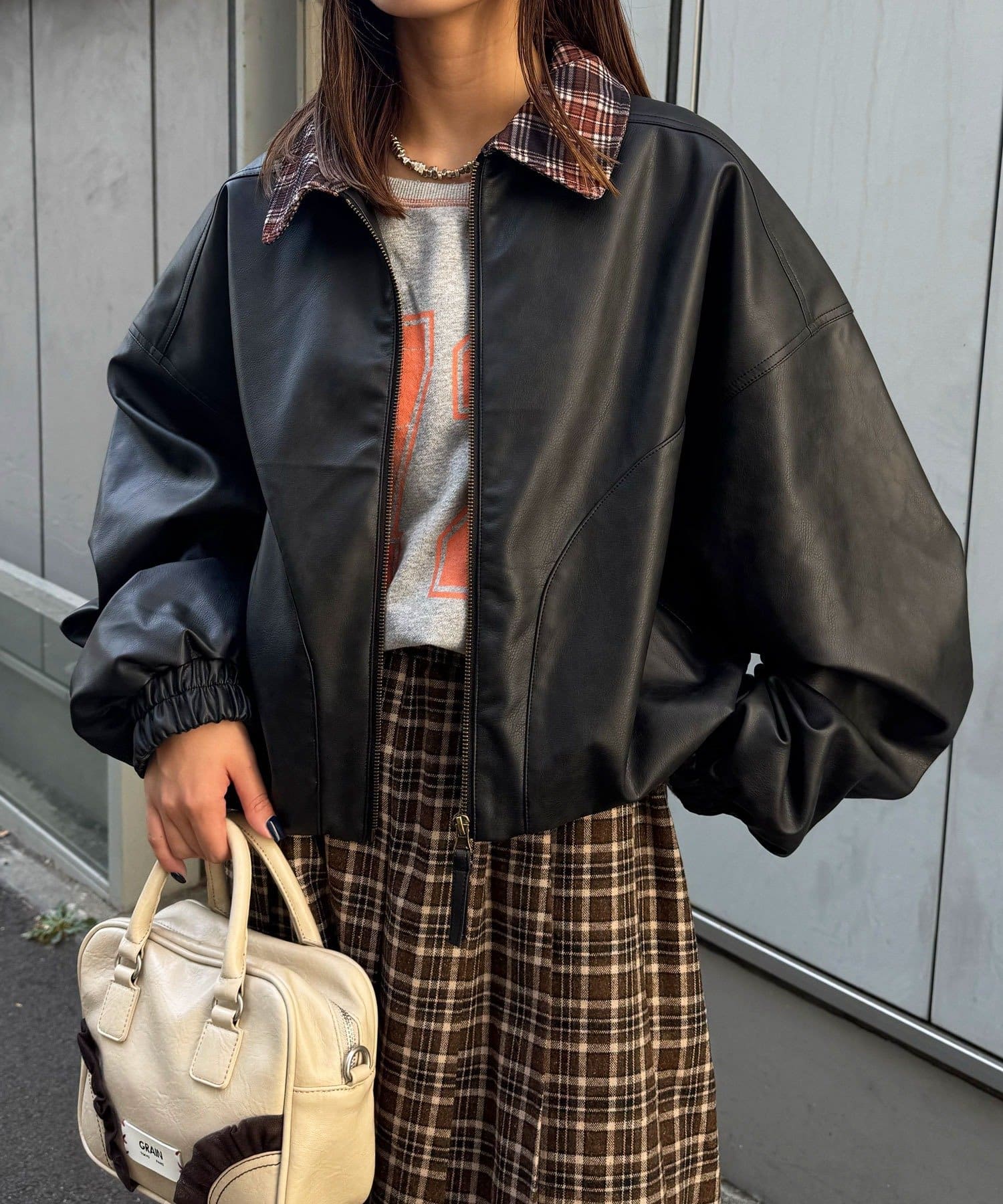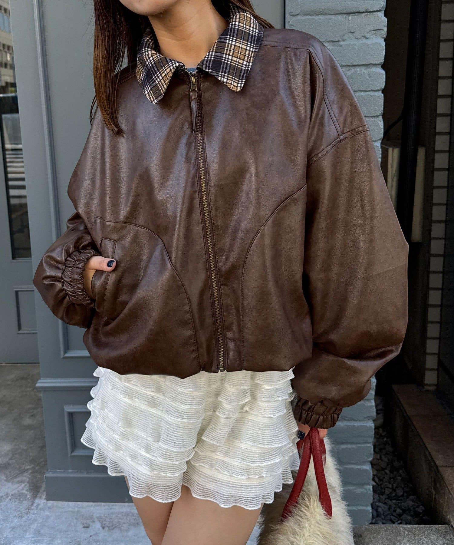• CIAOPANIC(チャオパニック) チェック襟フェイクレザーバルーンショートブルゾン