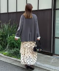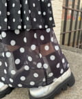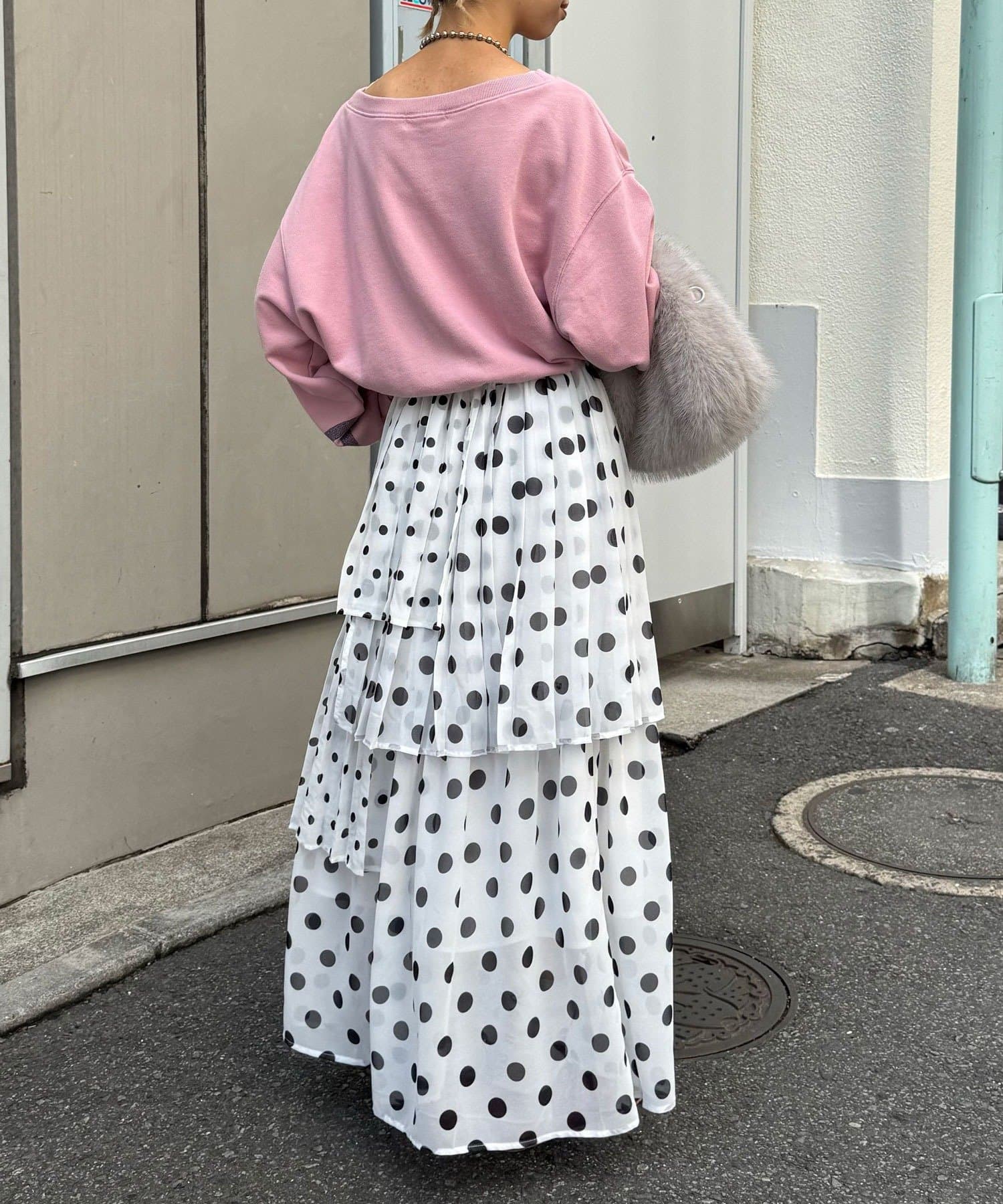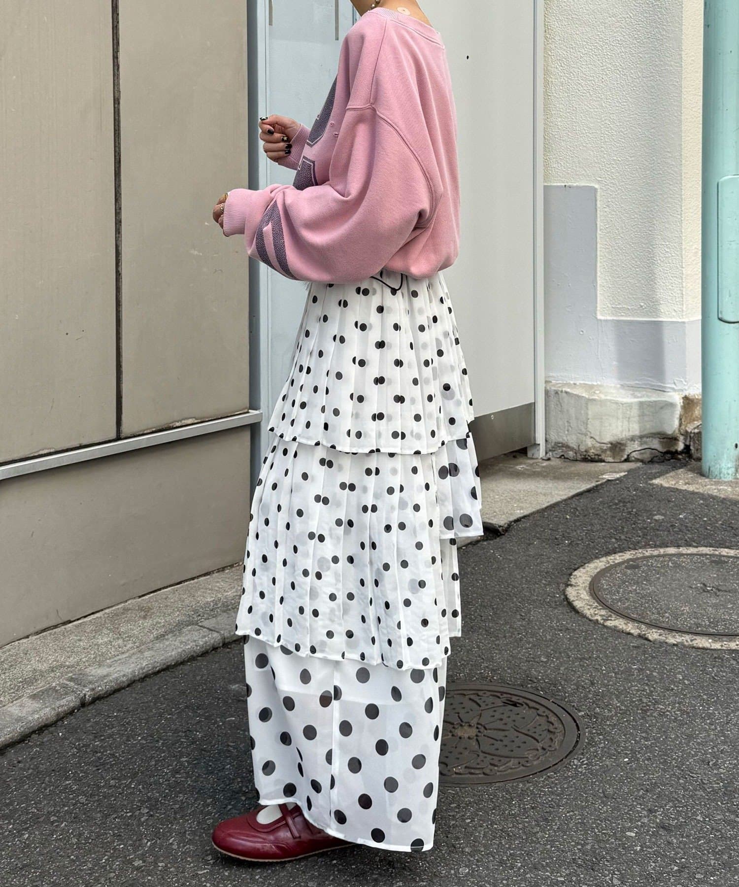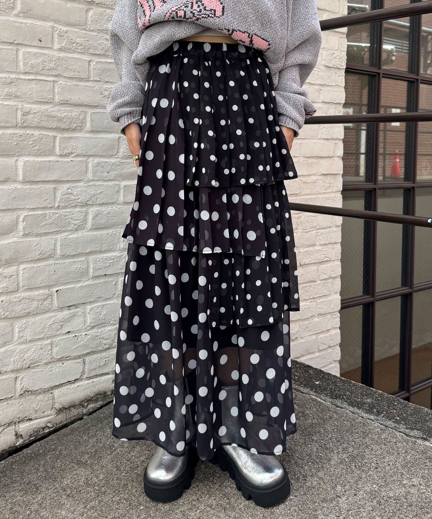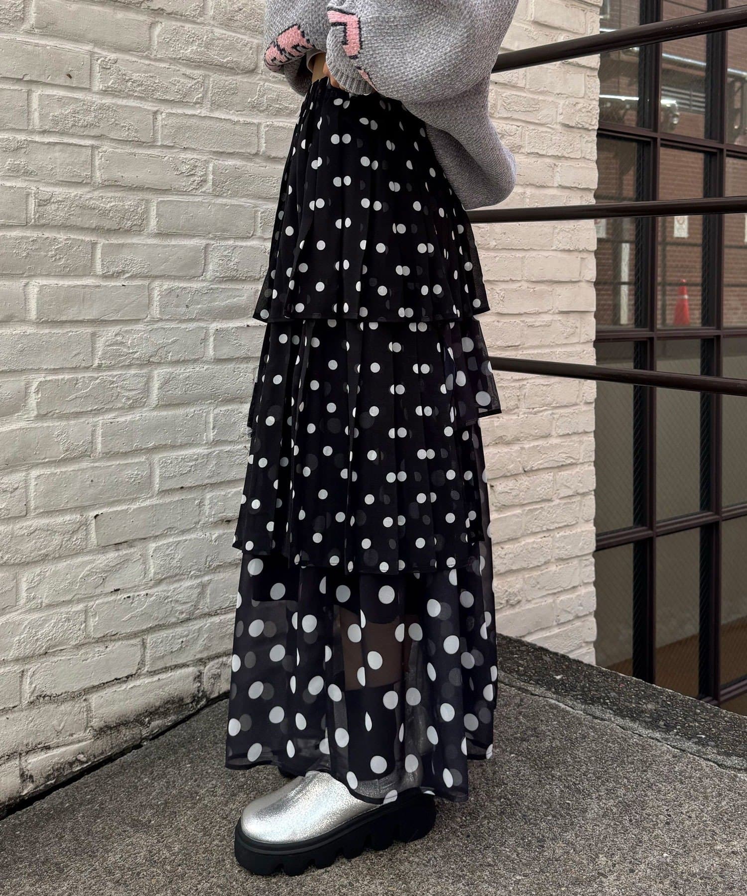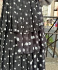 ドット柄のプリーツ生地をたっぷり使ったティアードスカート。