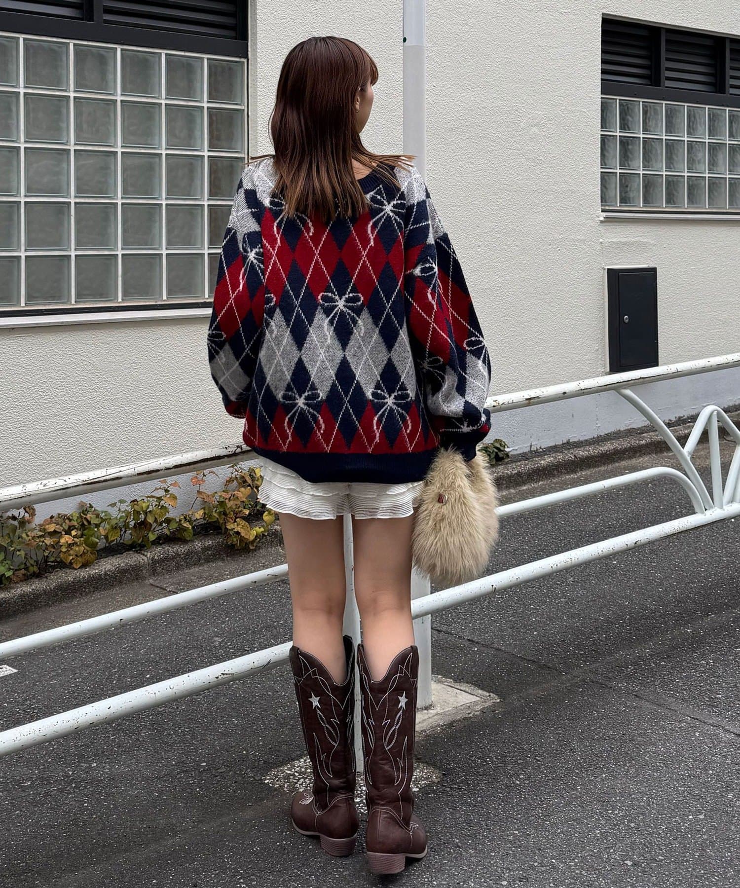 アーガイル柄にリボンを組み合わせた、遊び心のあるデザインカーディガン。