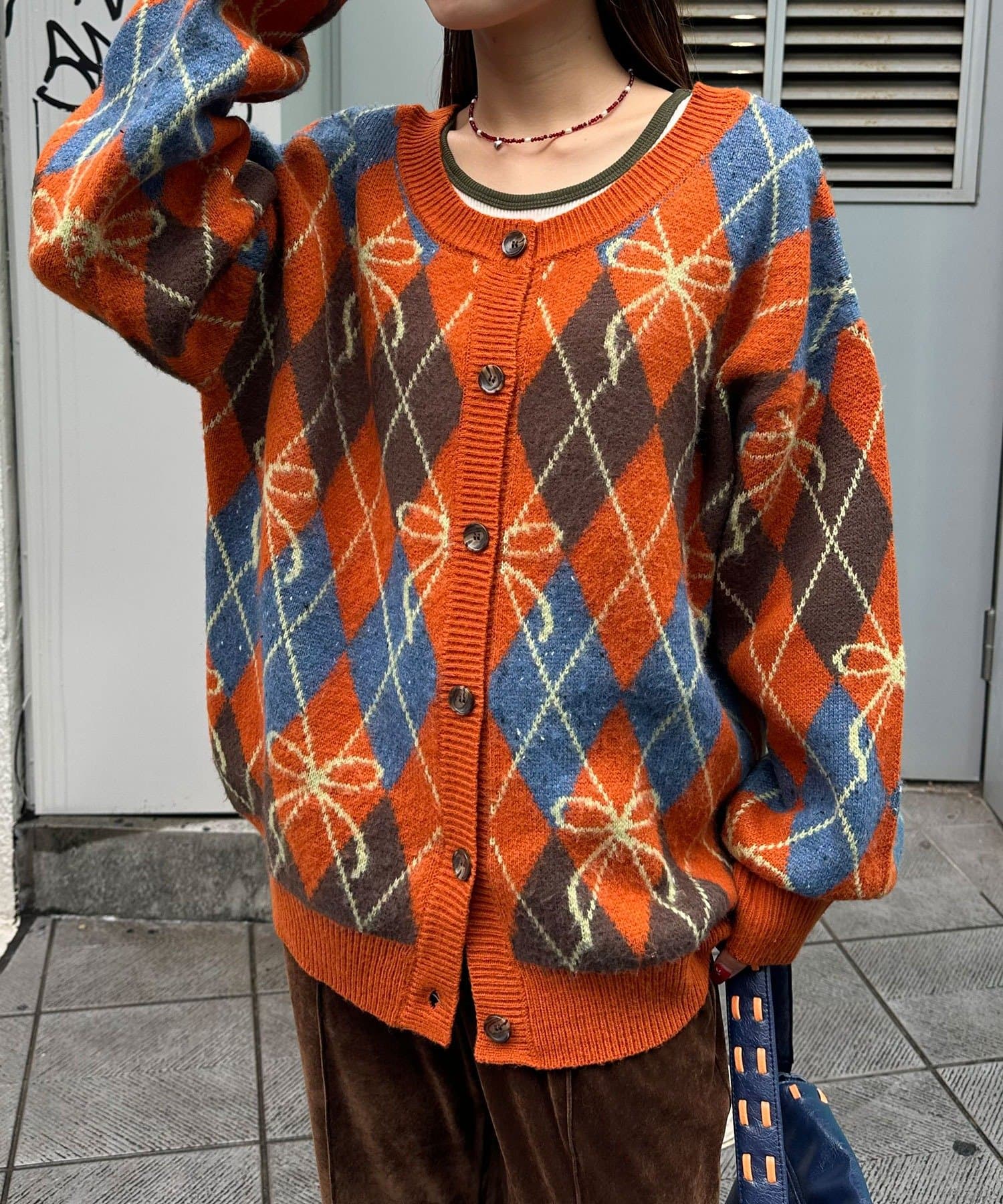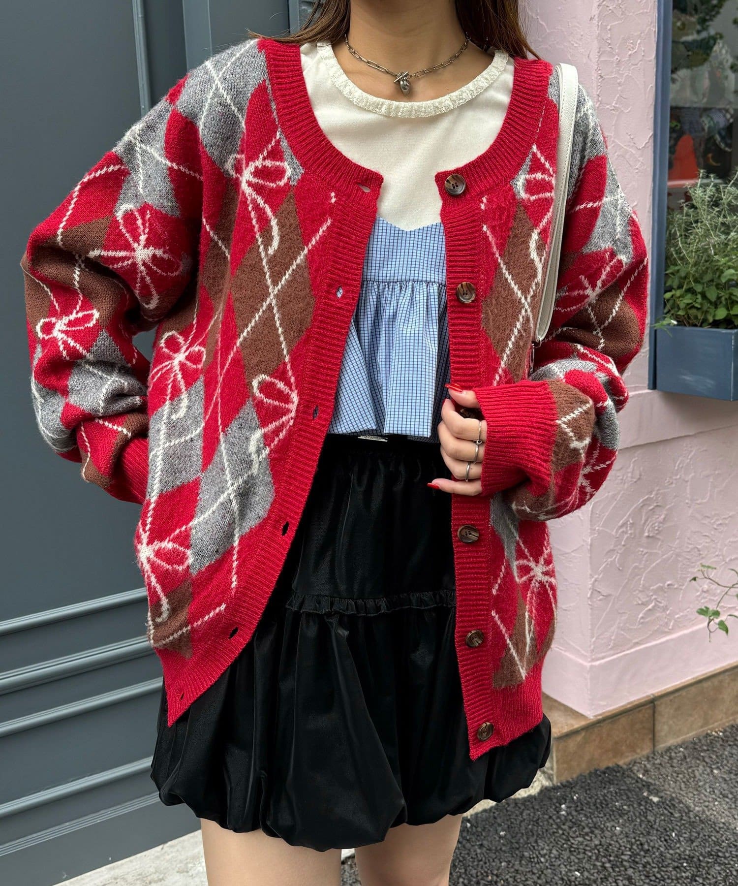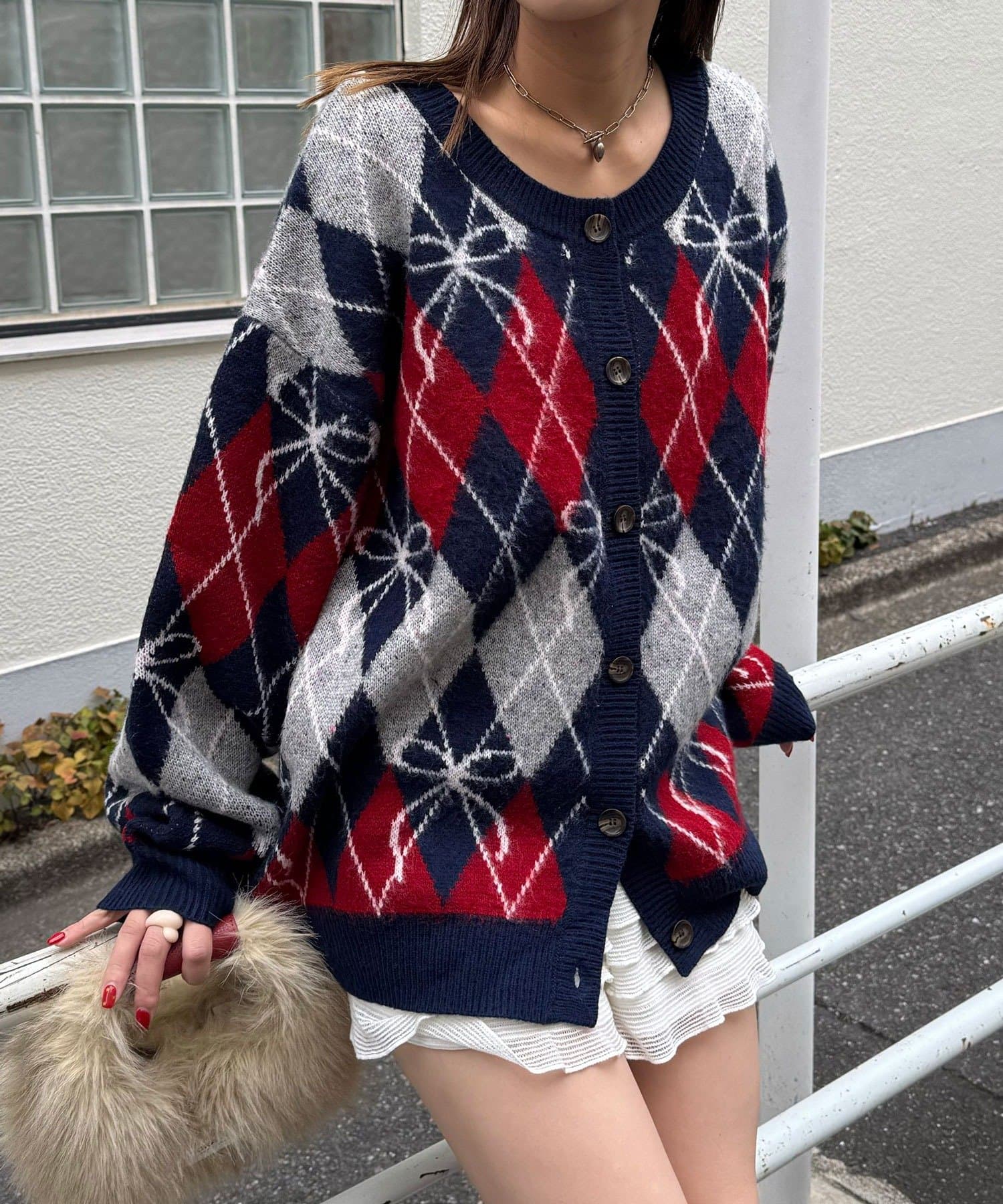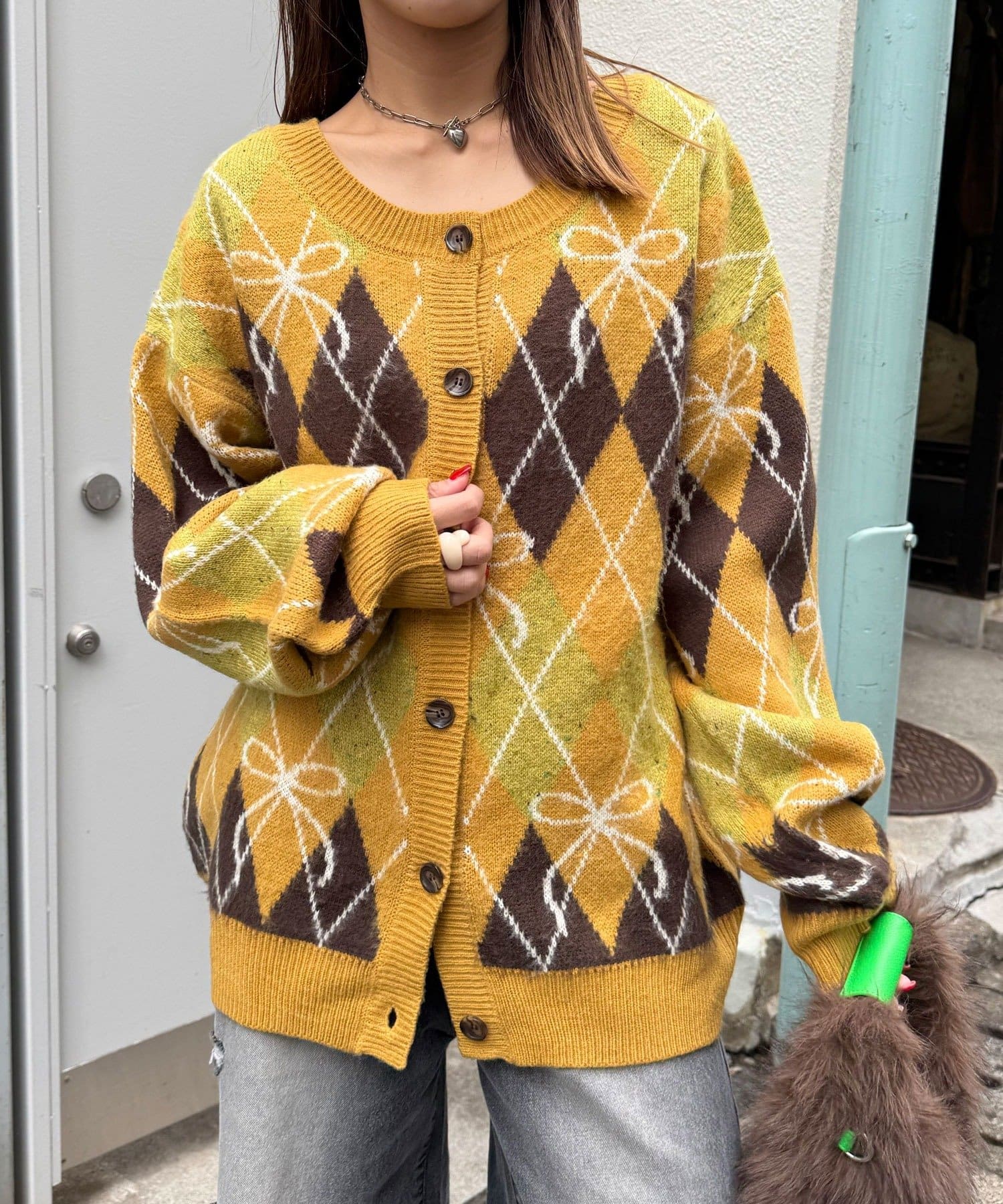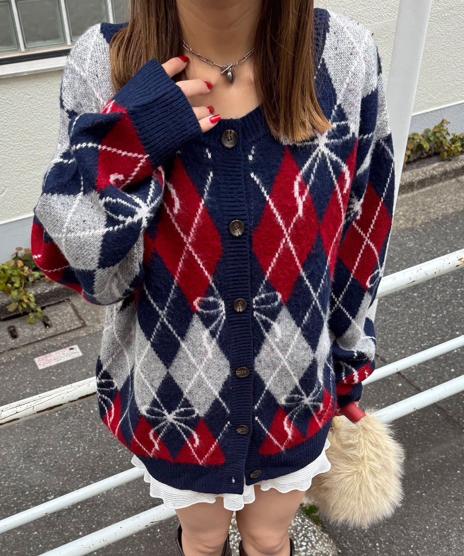 アーガイル柄にリボンを組み合わせた、遊び心のあるデザインカーディガン。