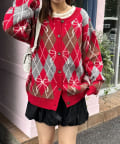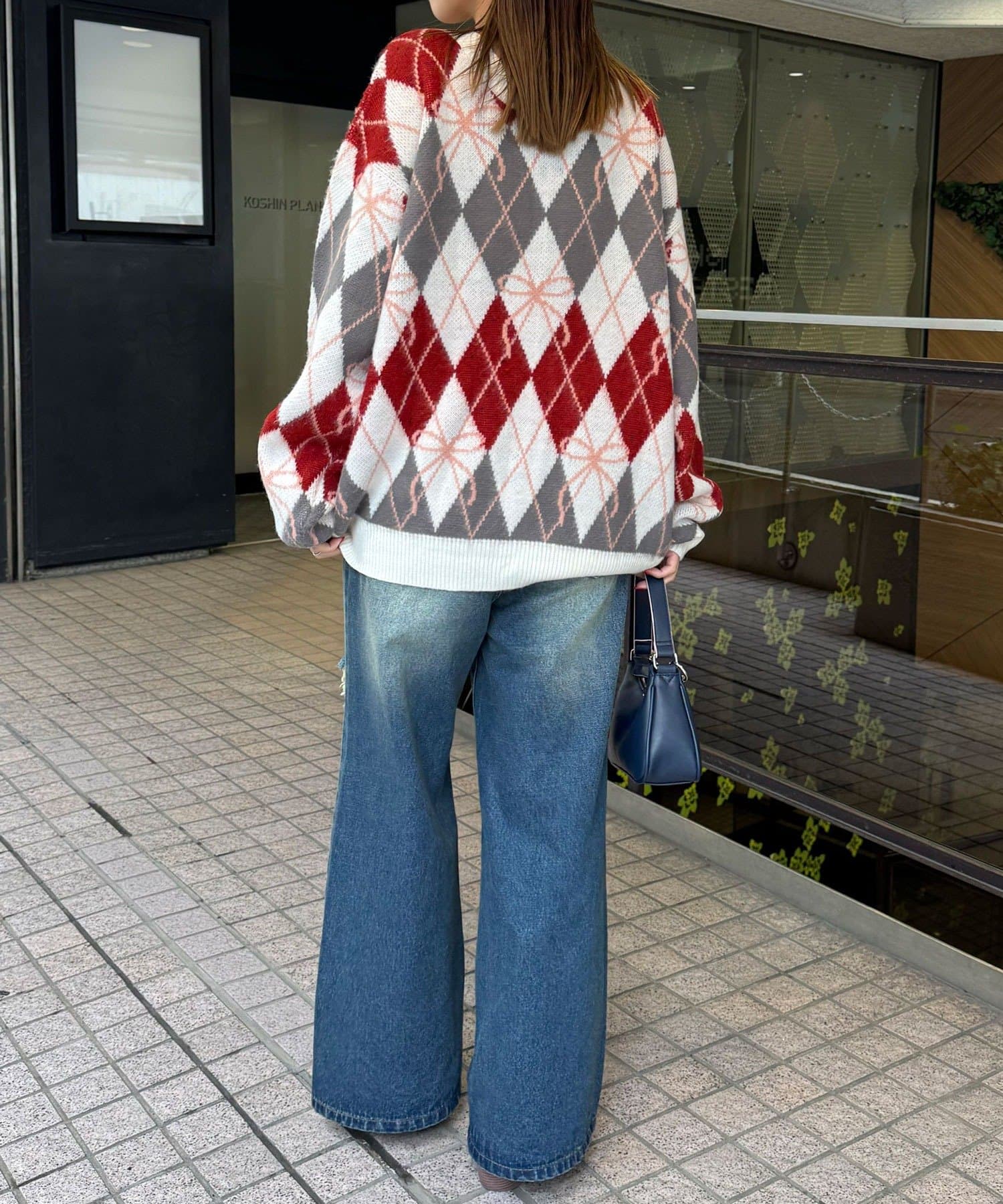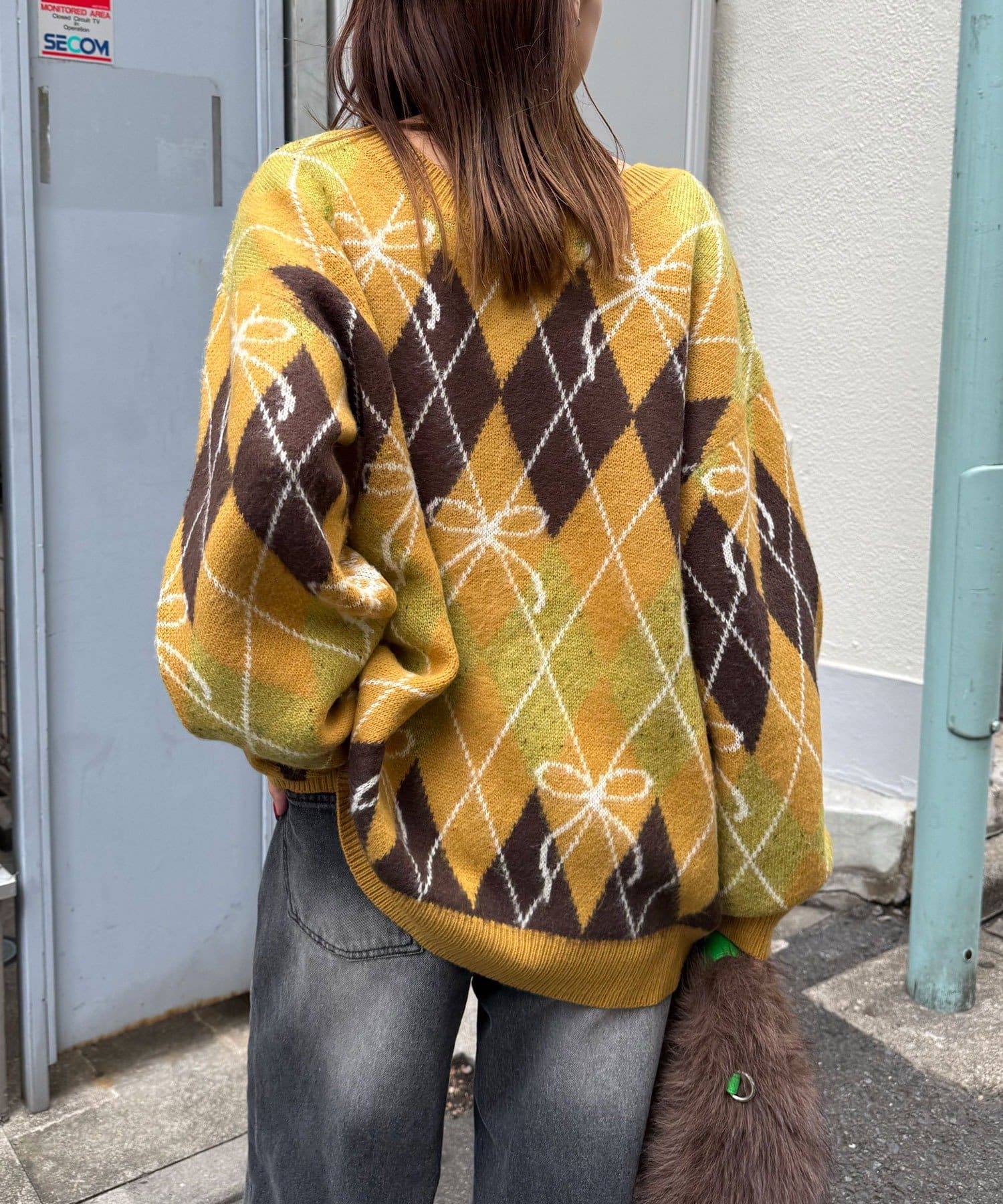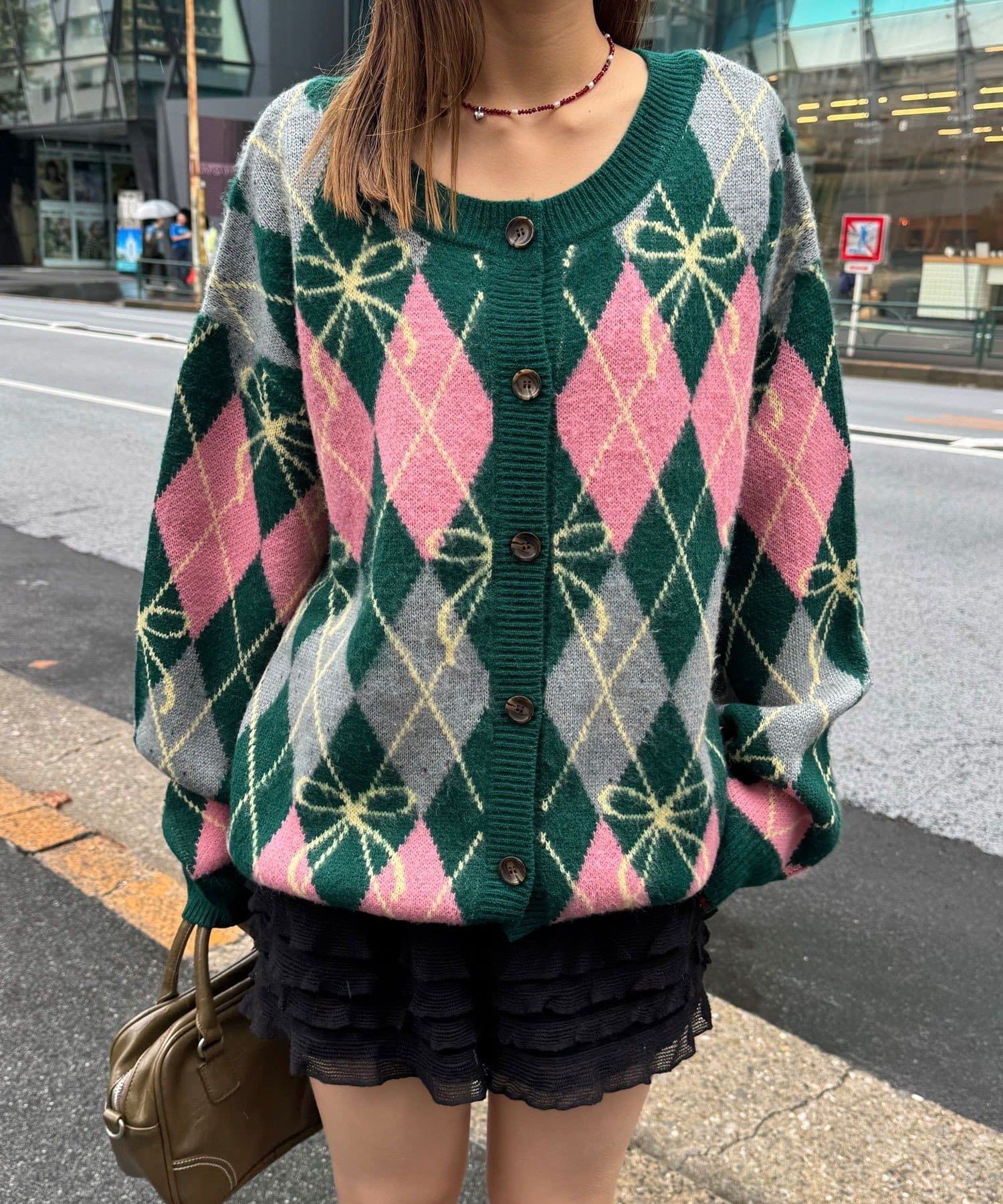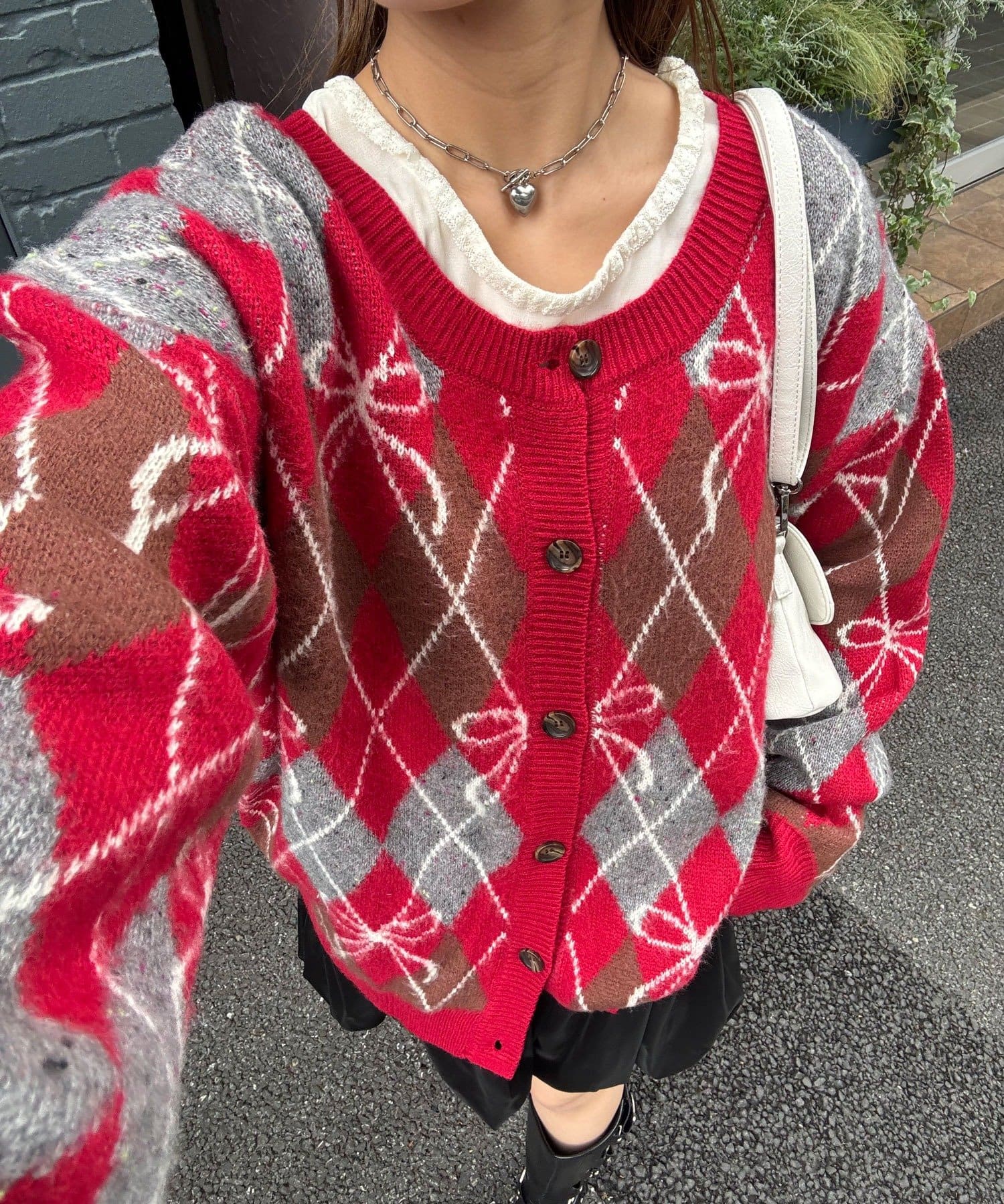 アーガイル柄にリボンを組み合わせた、遊び心のあるデザインカーディガン。