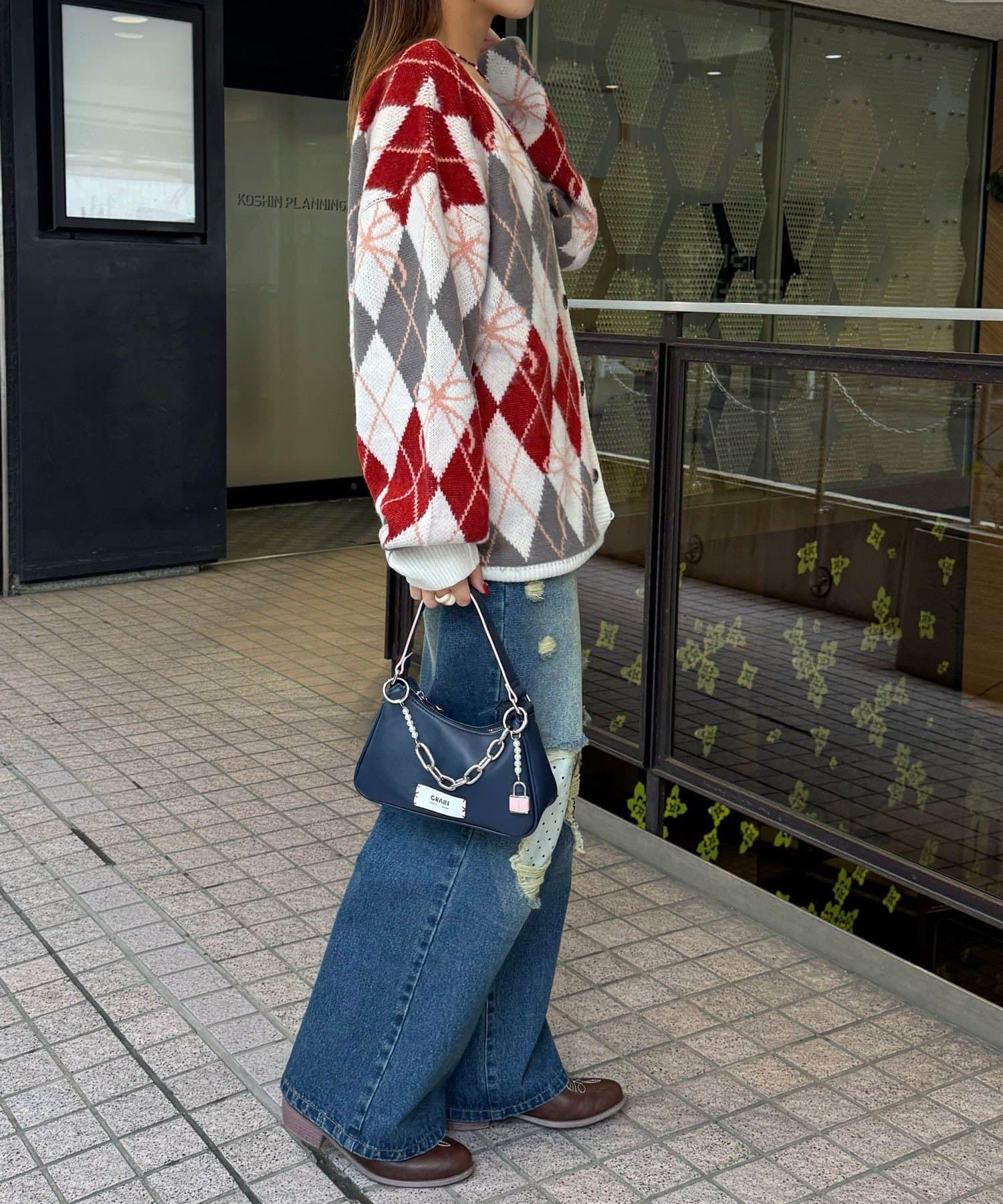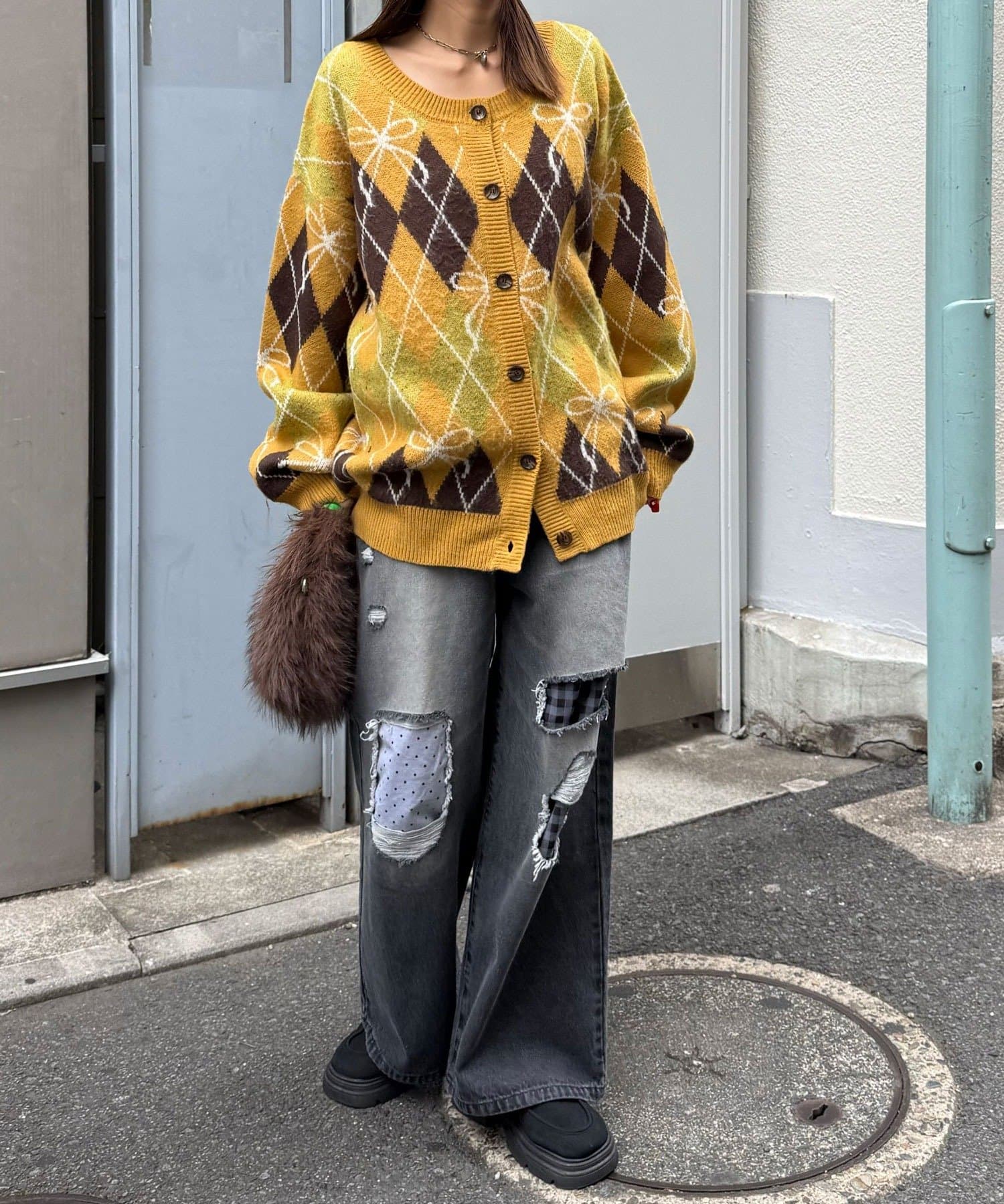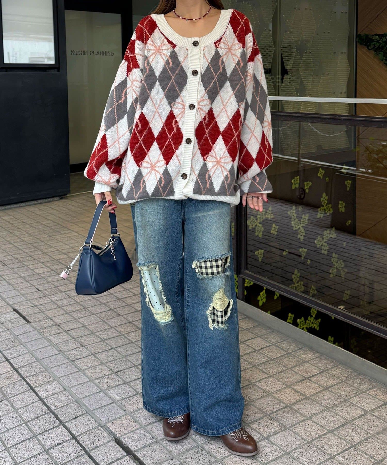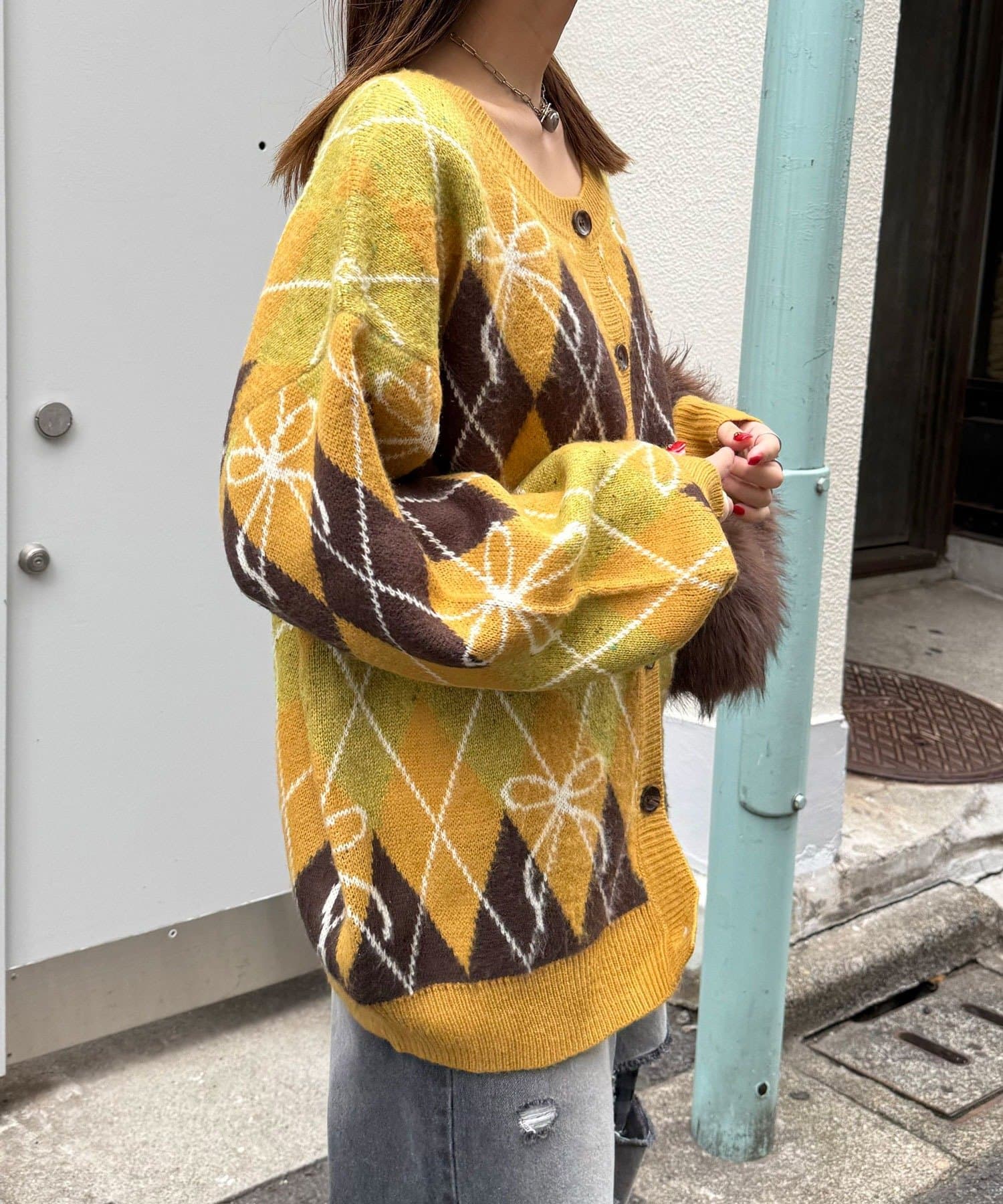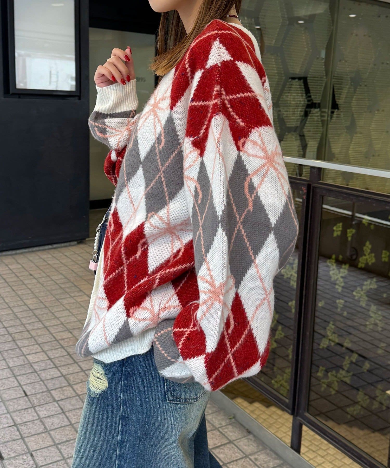 アーガイル柄にリボンを組み合わせた、遊び心のあるデザインカーディガン。