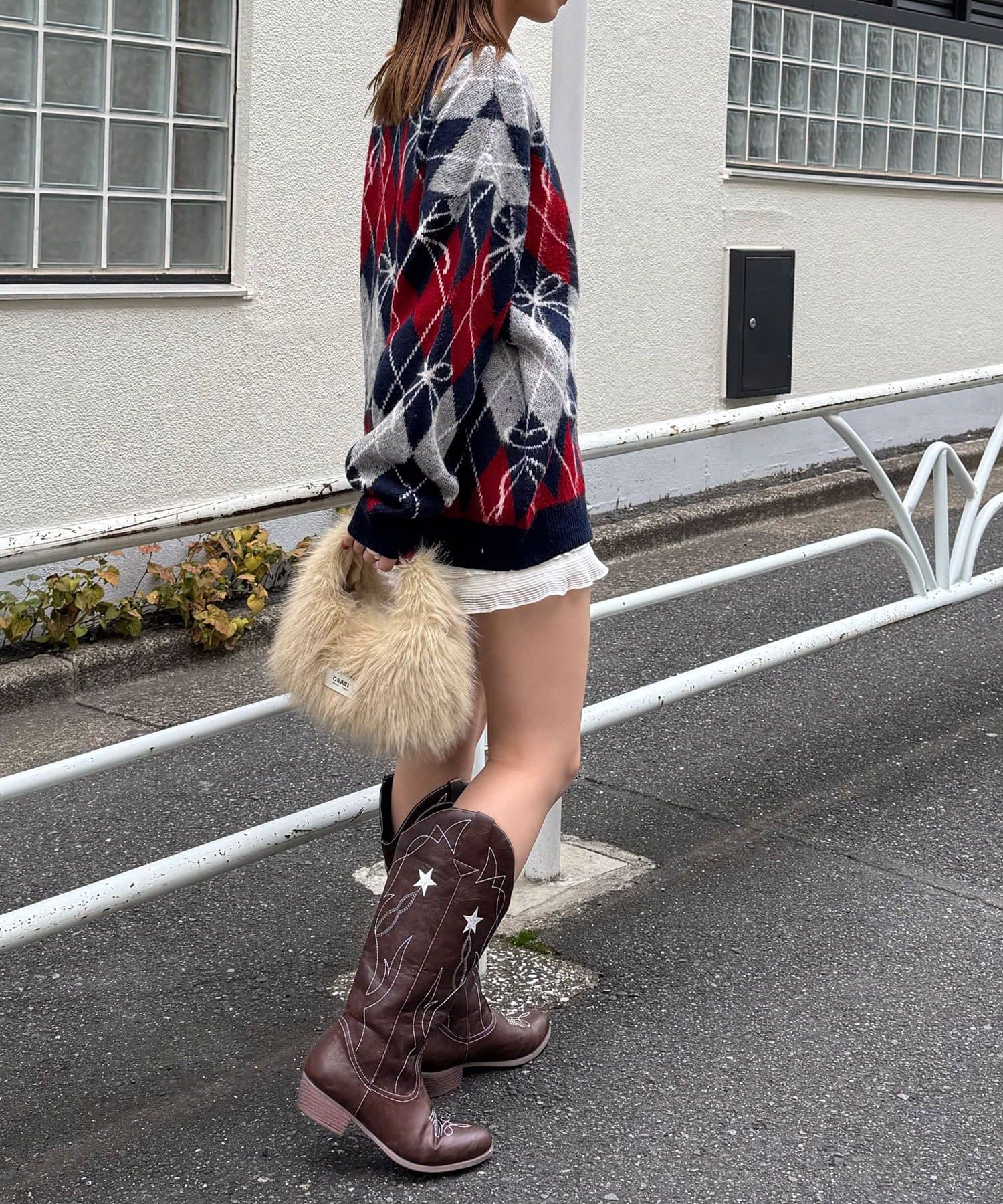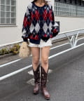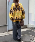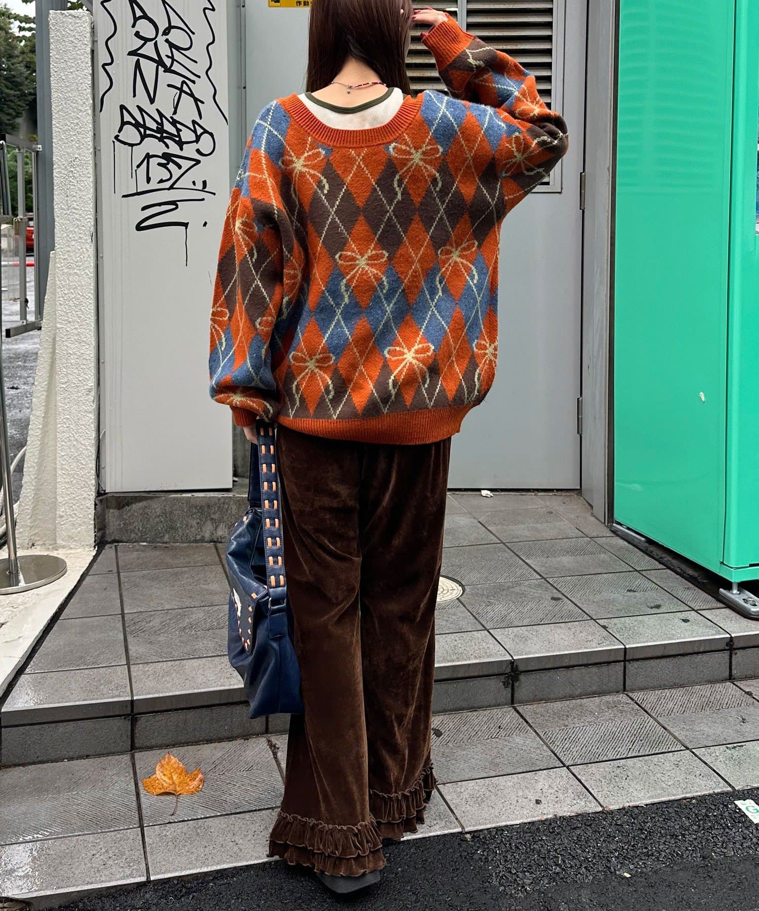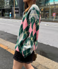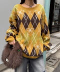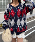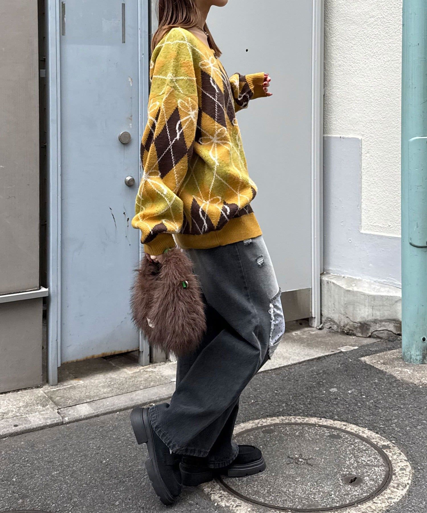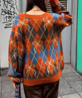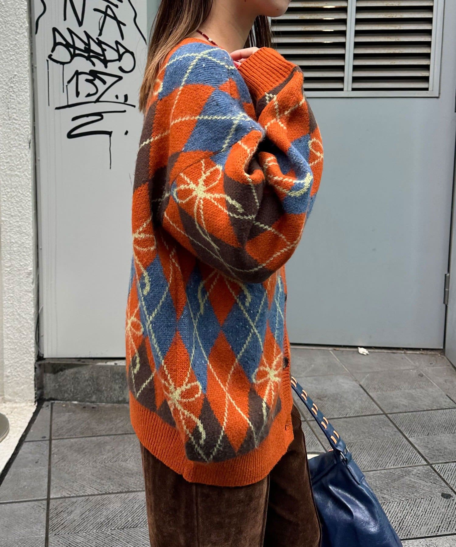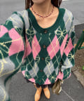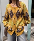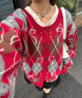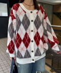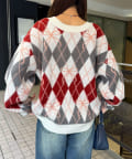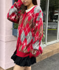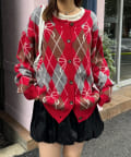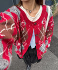 アーガイル柄にリボンを組み合わせた、遊び心のあるデザインカーディガン。