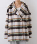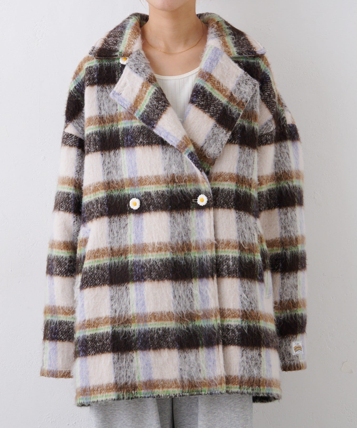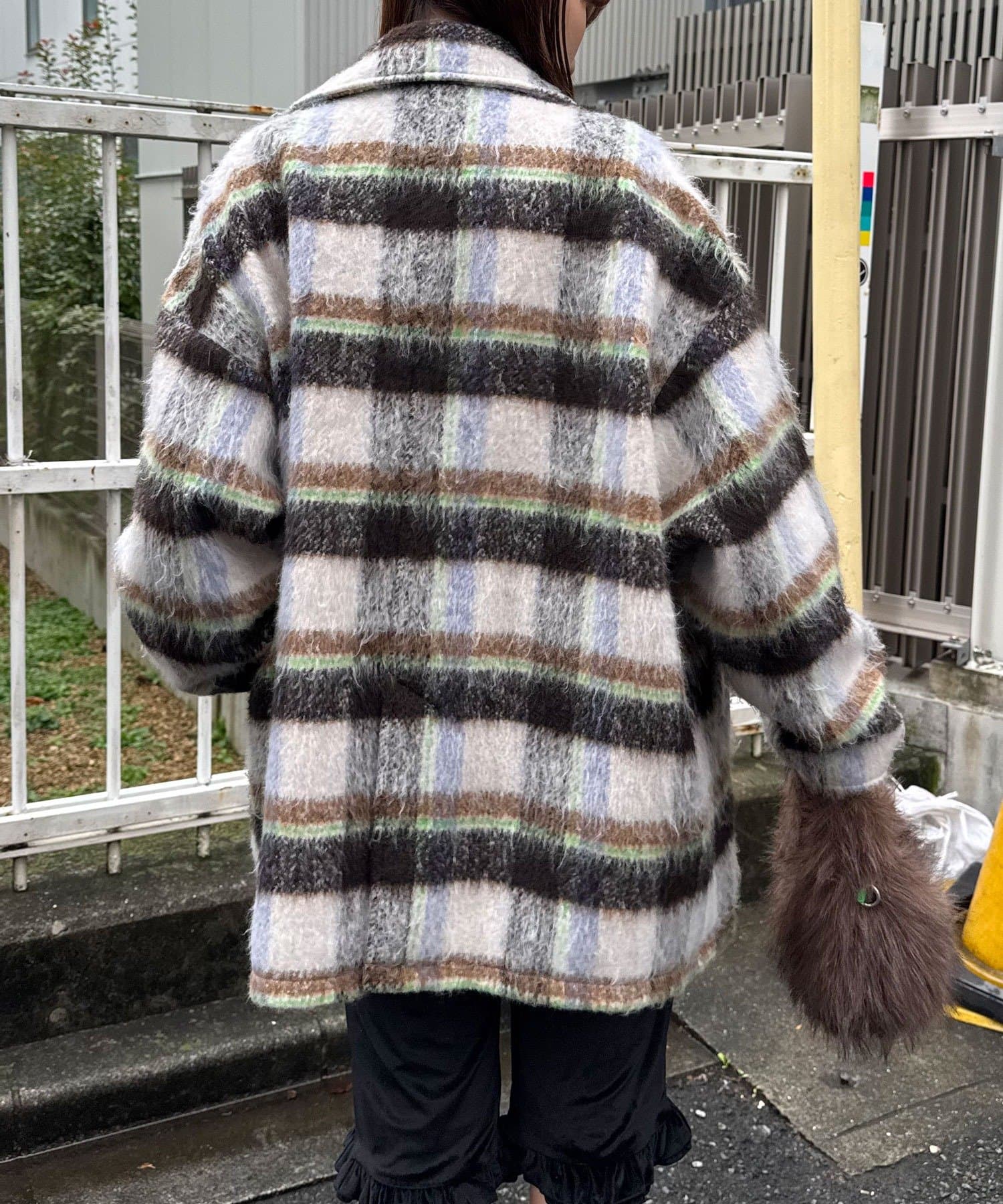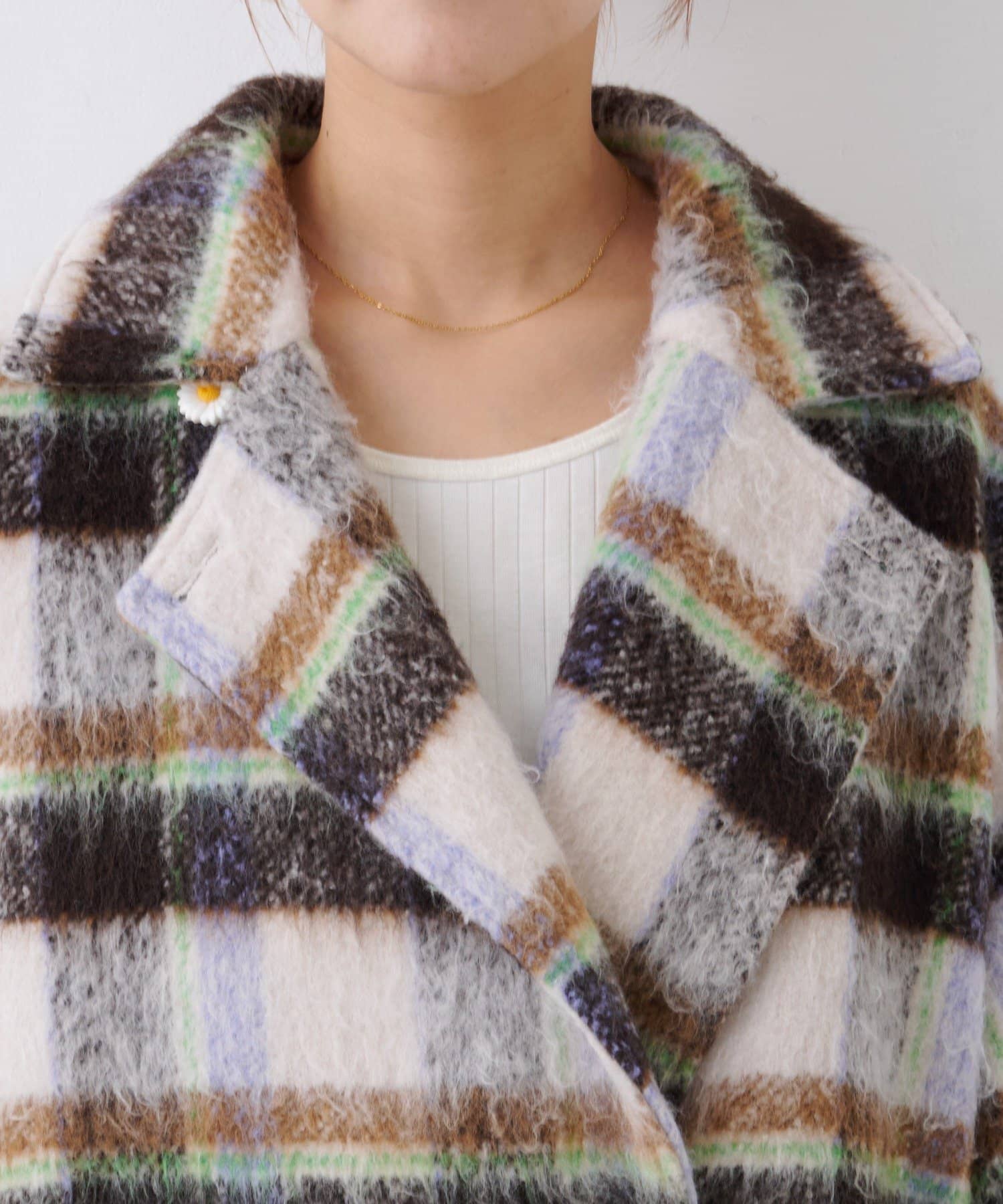 マーガレットボタンとチェック柄がポイントのシャギーオーバーコート。