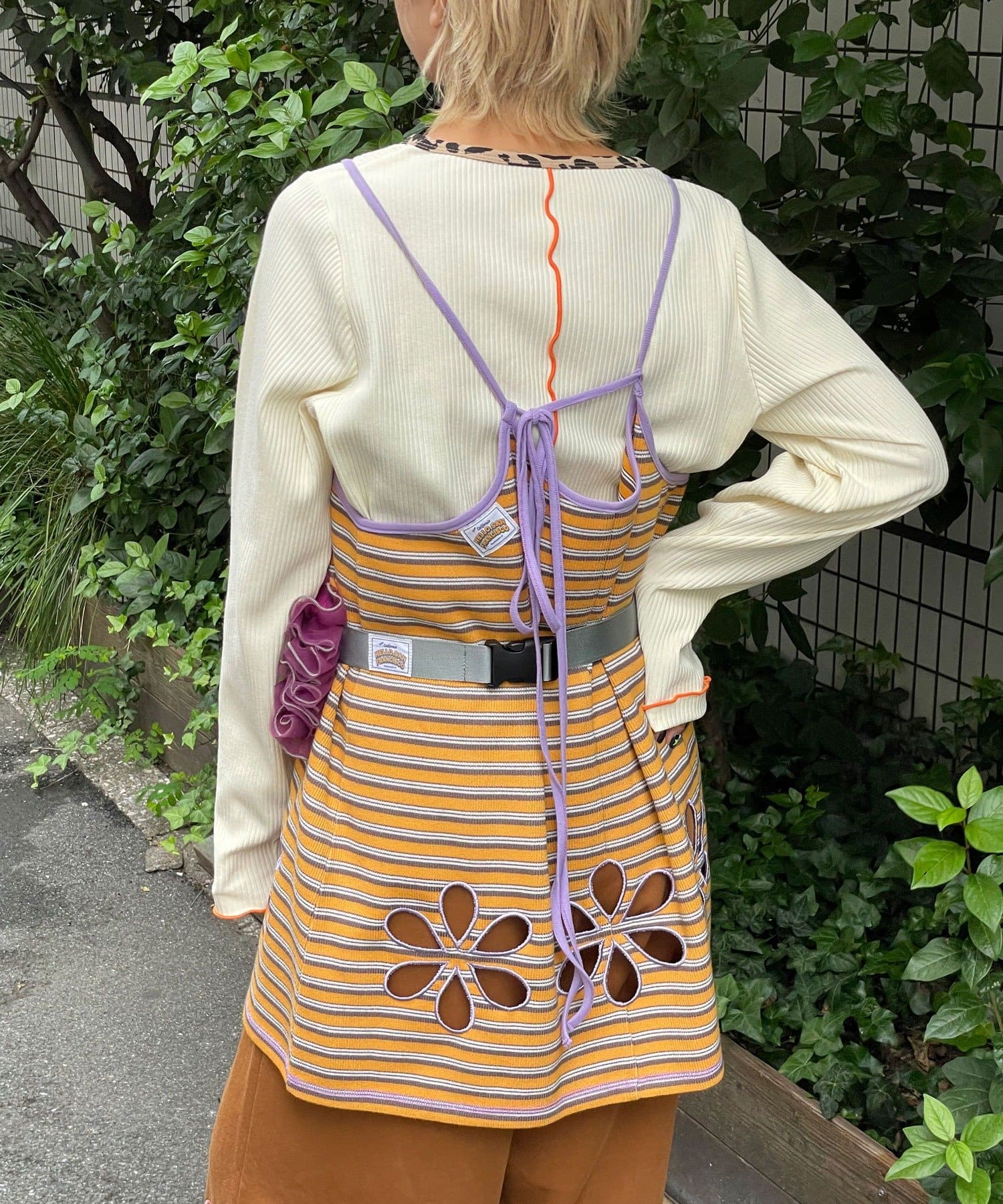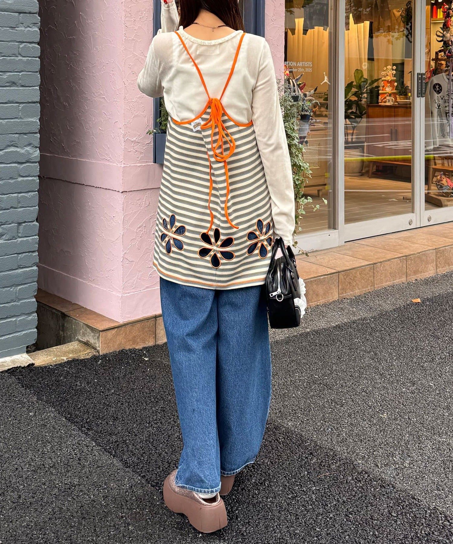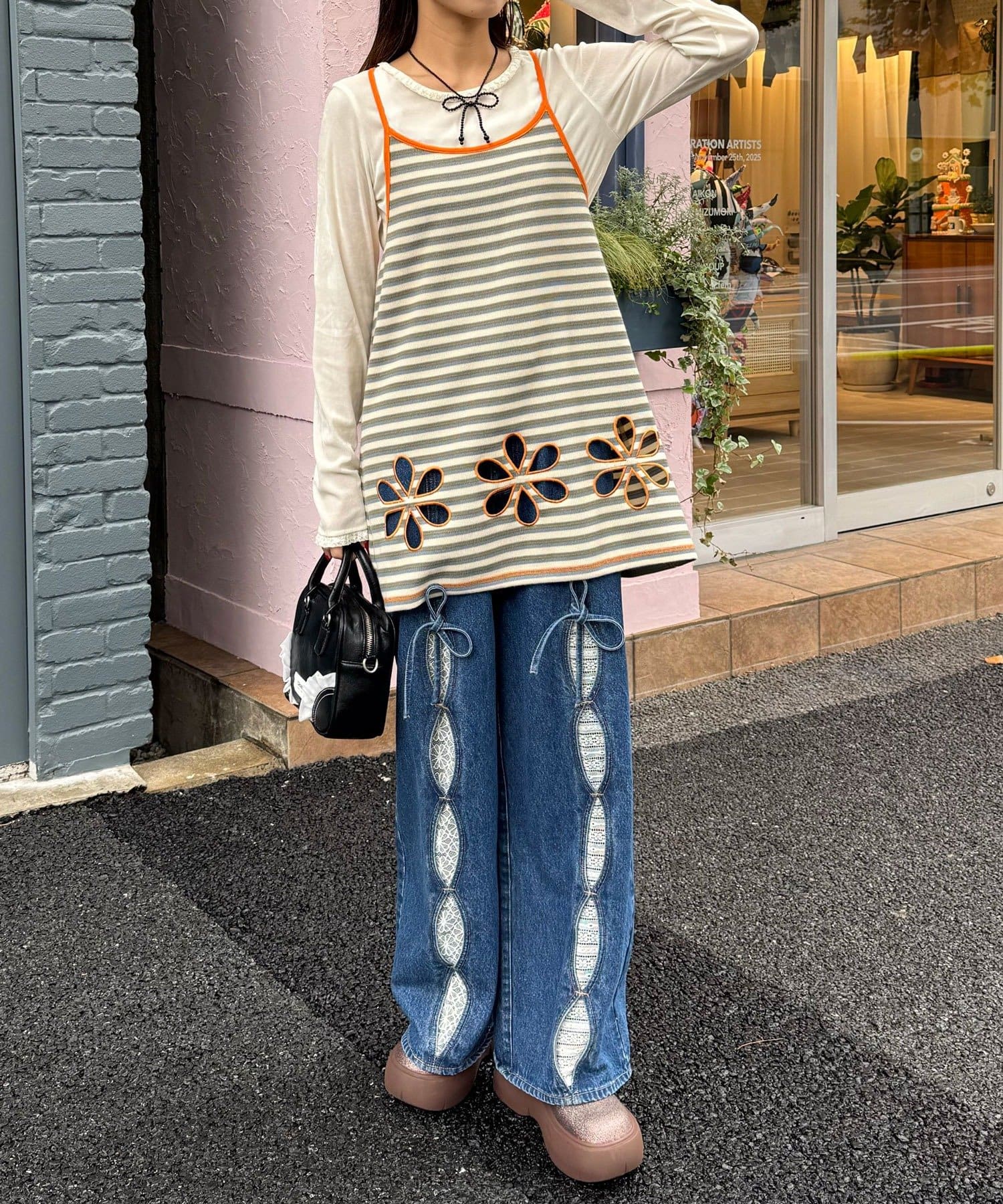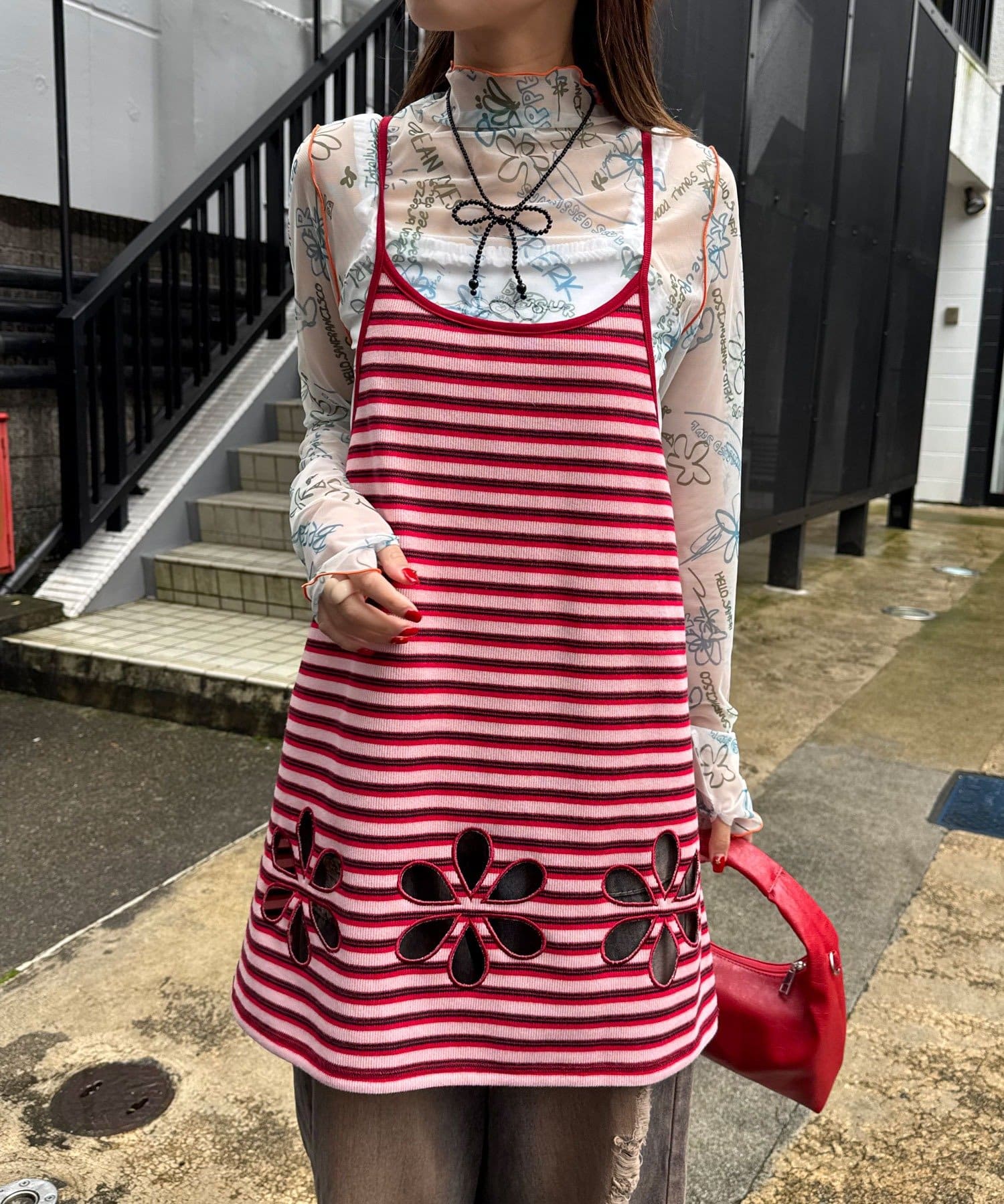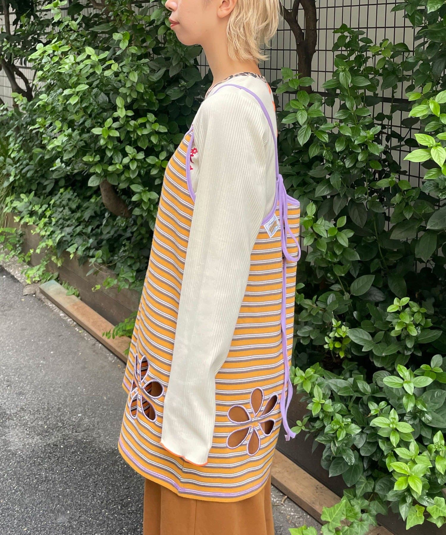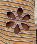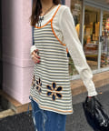 ボーダー柄キャミの裾にフラワーカットアウトをプラス。