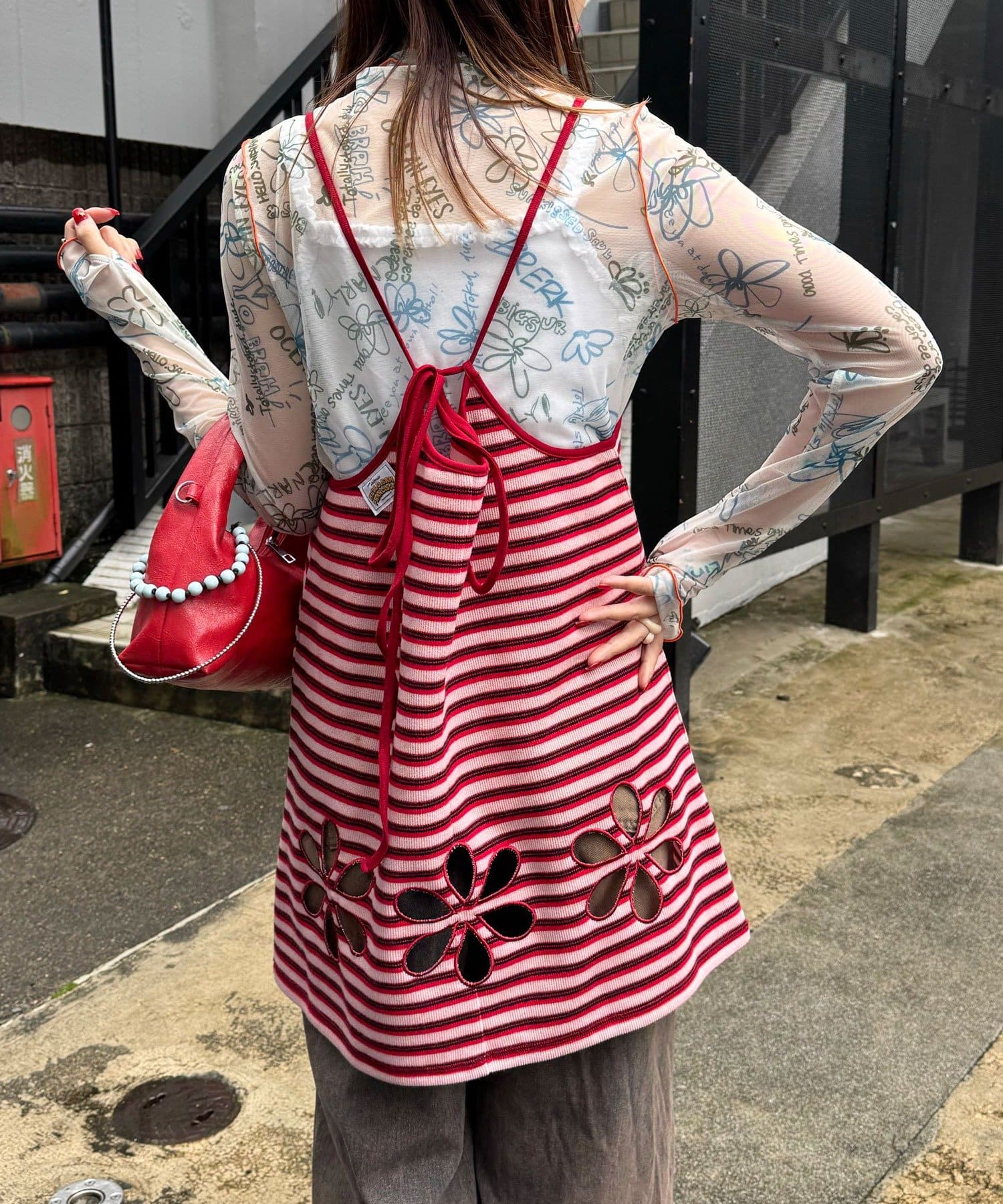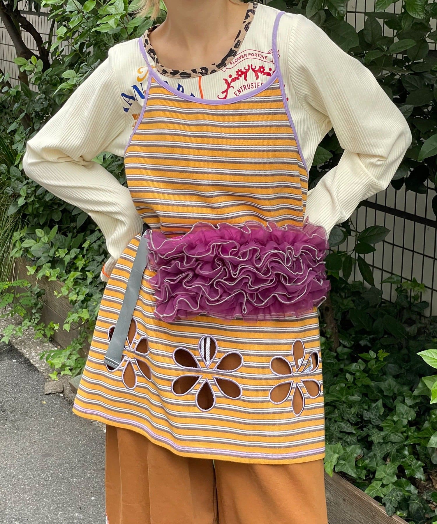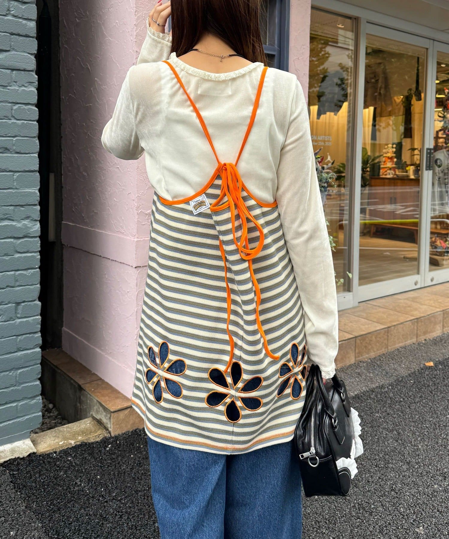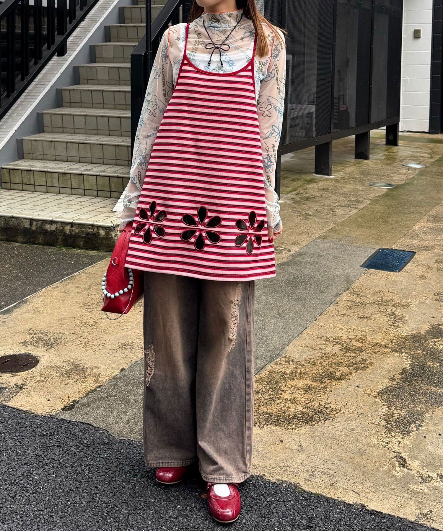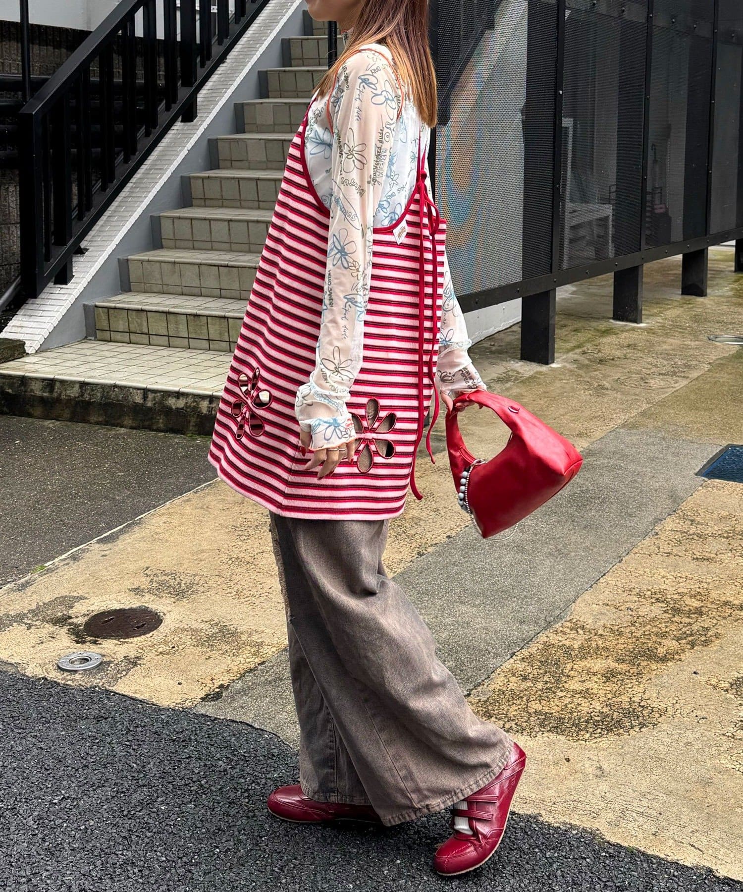 ボーダー柄キャミの裾にフラワーカットアウトをプラス。